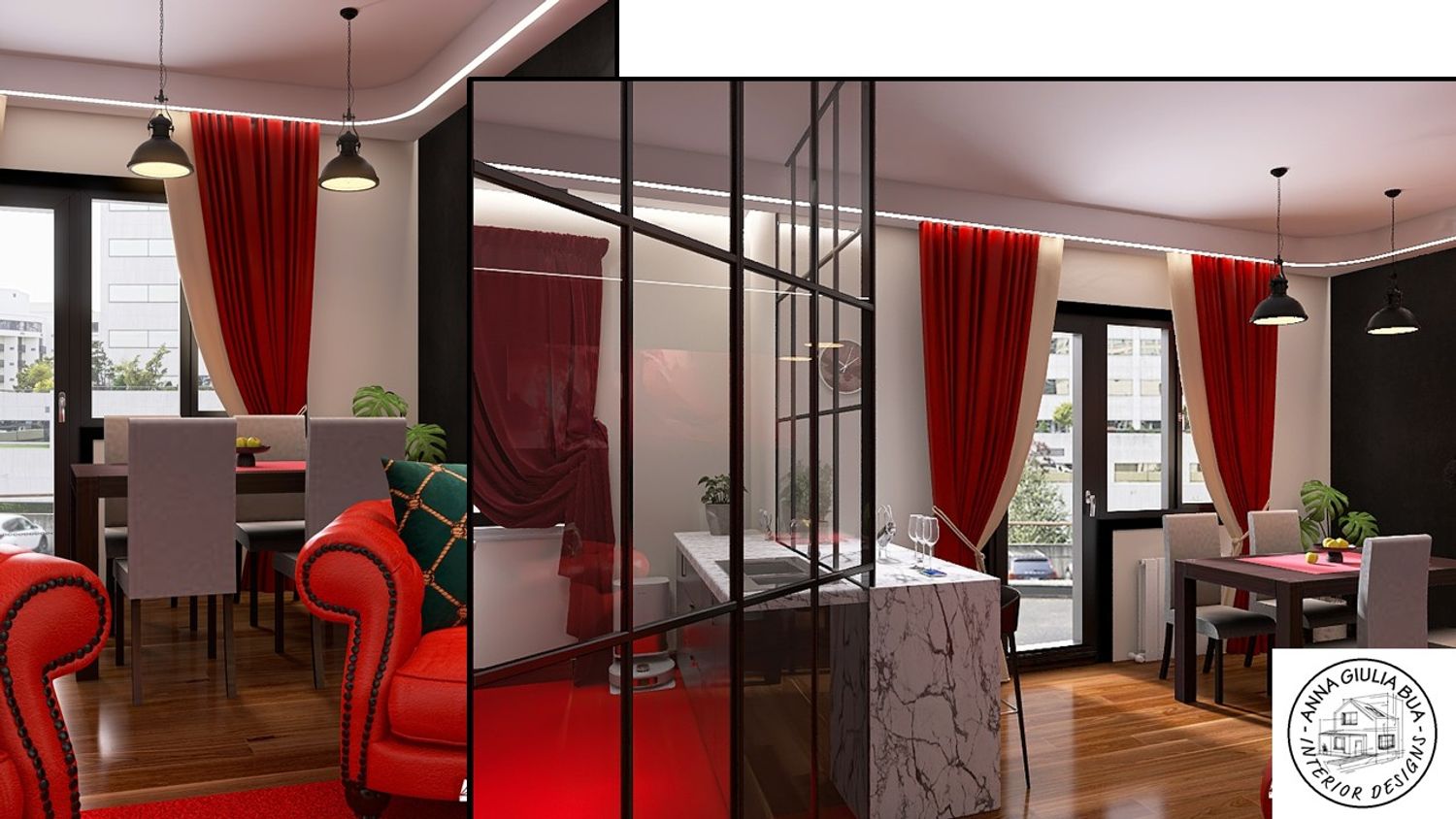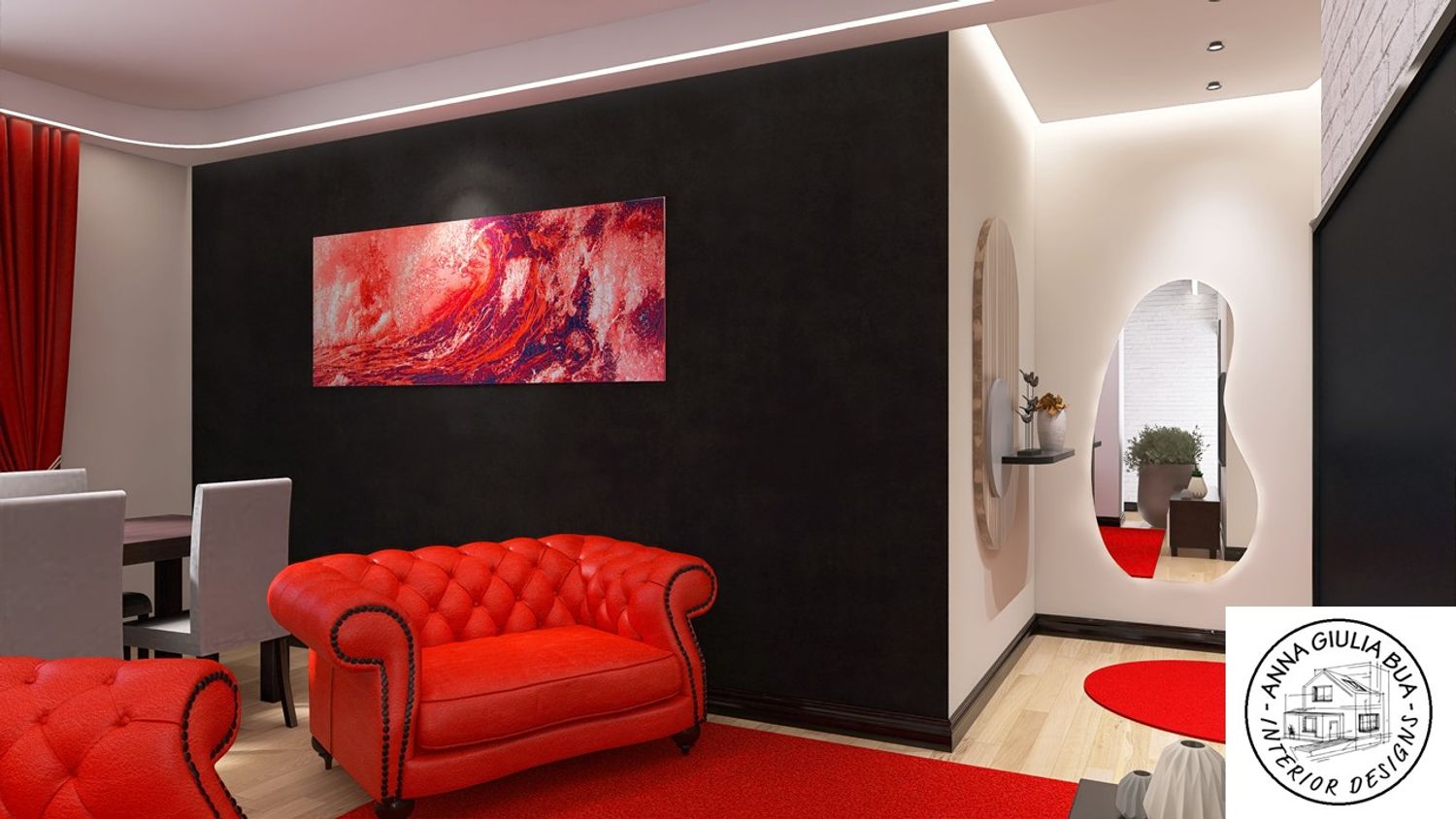 Divano Chesterfield Moderno: Il divano rosso con lavorazione capitonné è il cuore del soggiorno, unendo un classico del design a un colore moderno e audace.