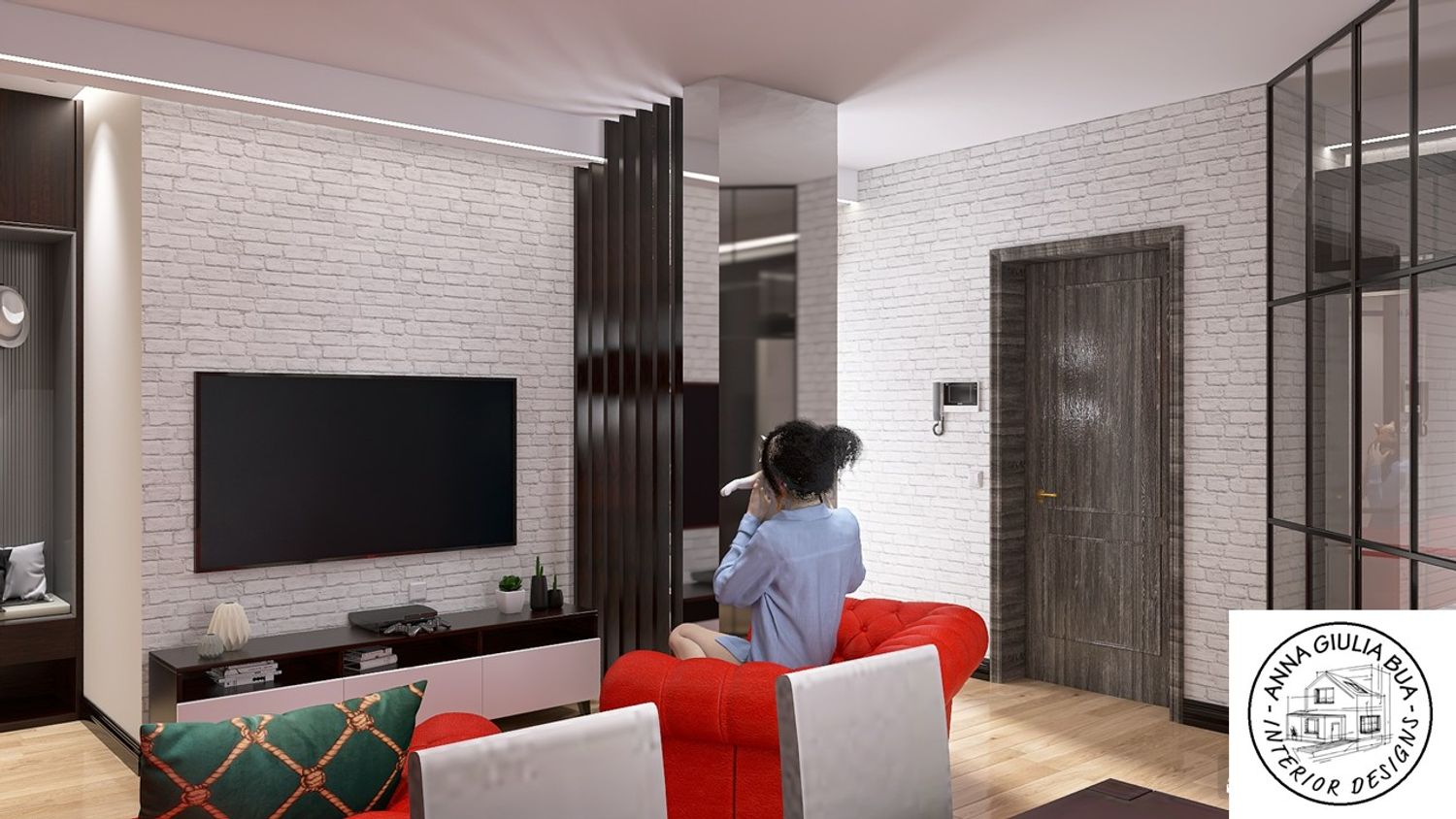 Bianco (Luce e Contrasto): La parete in mattoni bianchi bilancia il nero, evitando che l'ambiente risulti troppo opprimente e aggiungendo una texture luminosa.