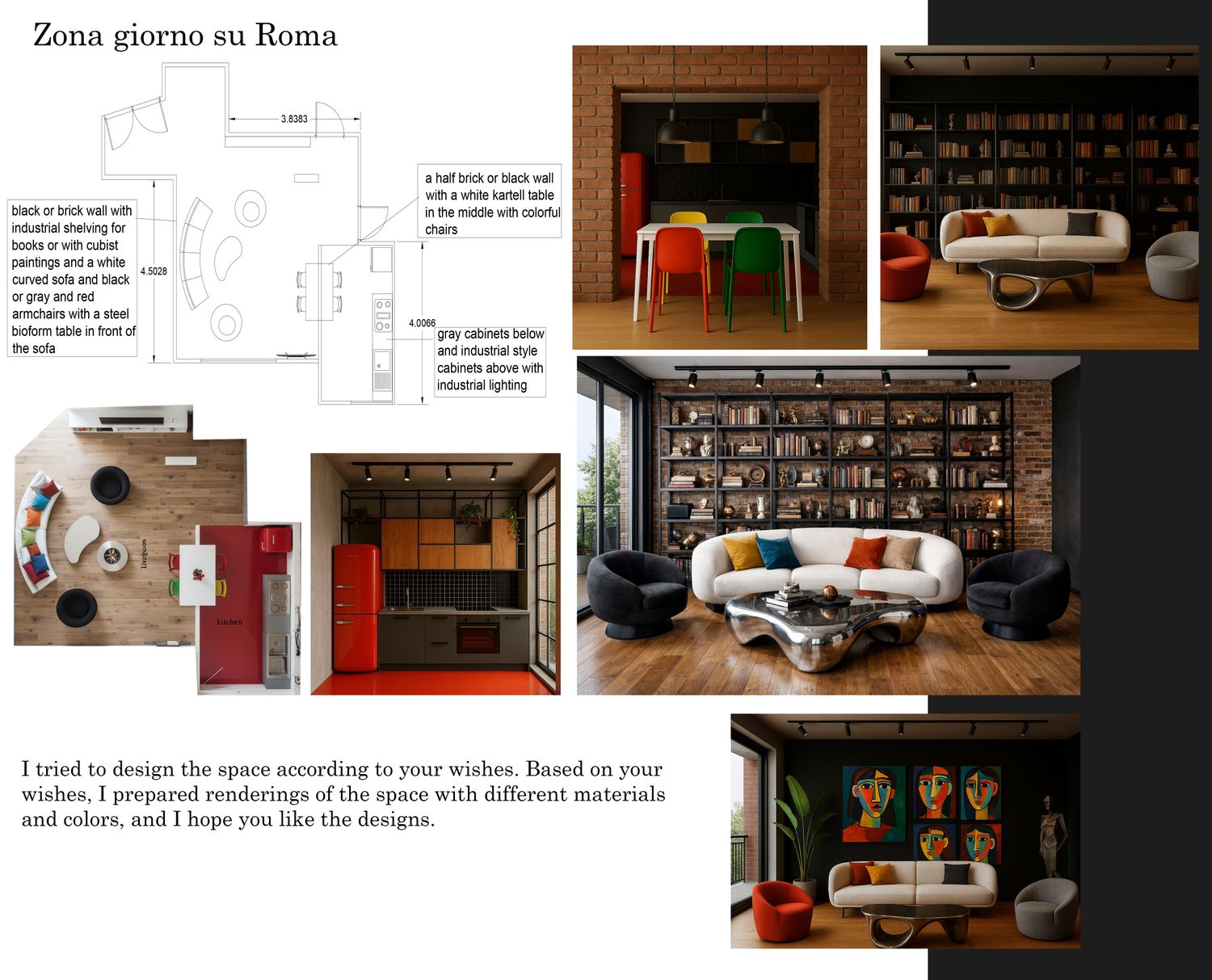 I tried to design the space according to your wishes. Based on your wishes, I prepared renderings of the space with different materials and colors, and I hope you like the designs.