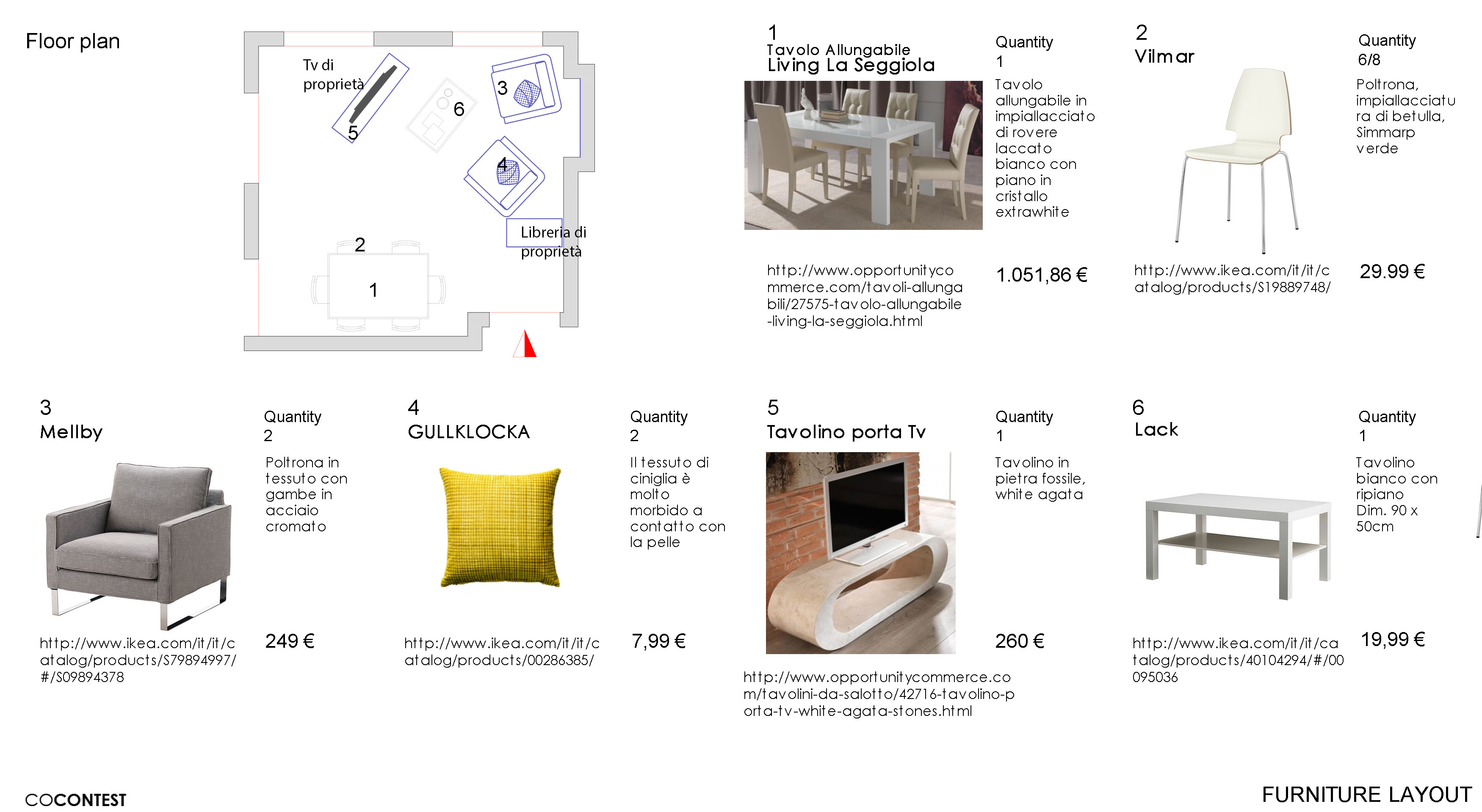 I mobili sono: tavolo, divano, una credenza con 2 ante, piccola libreria e tv.