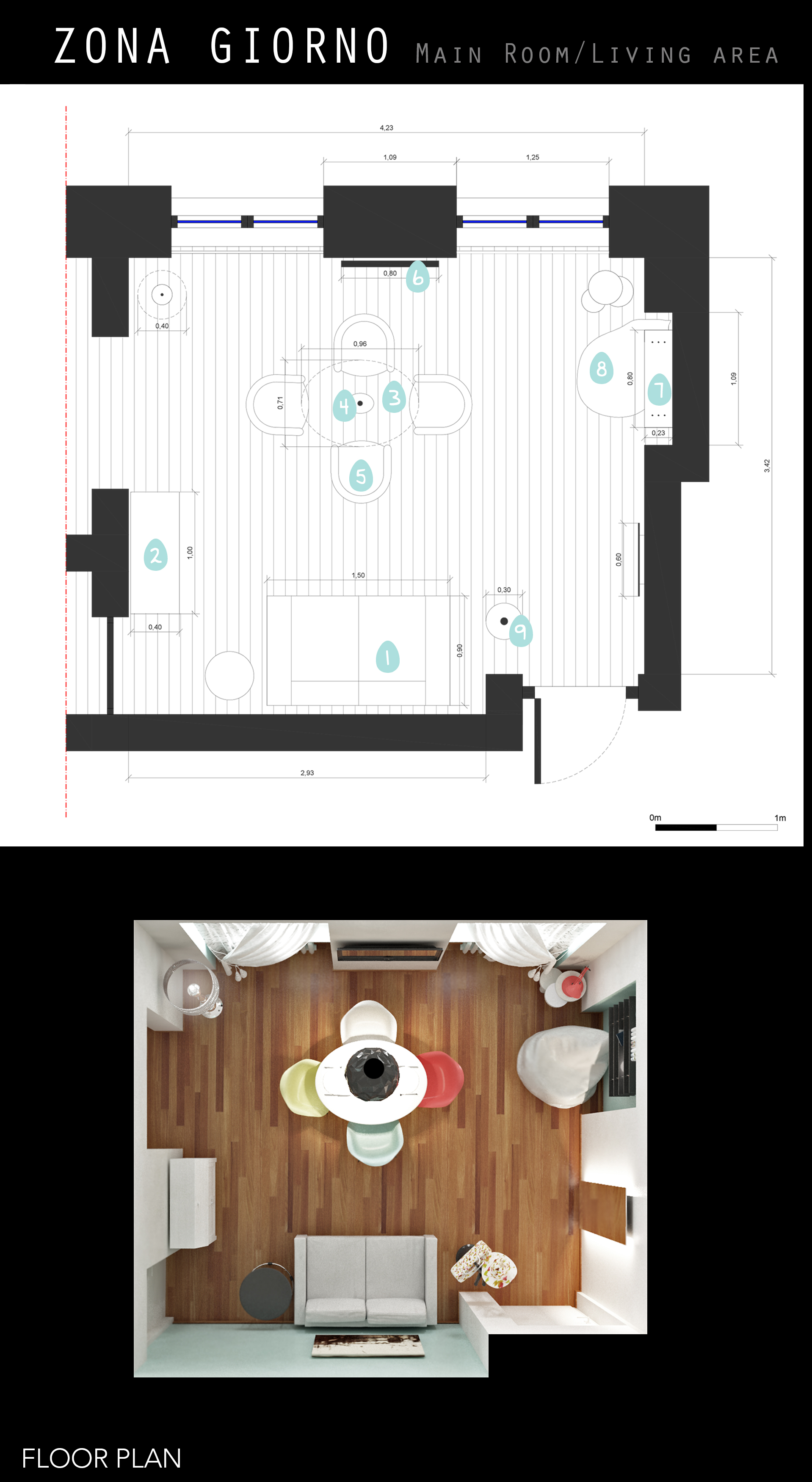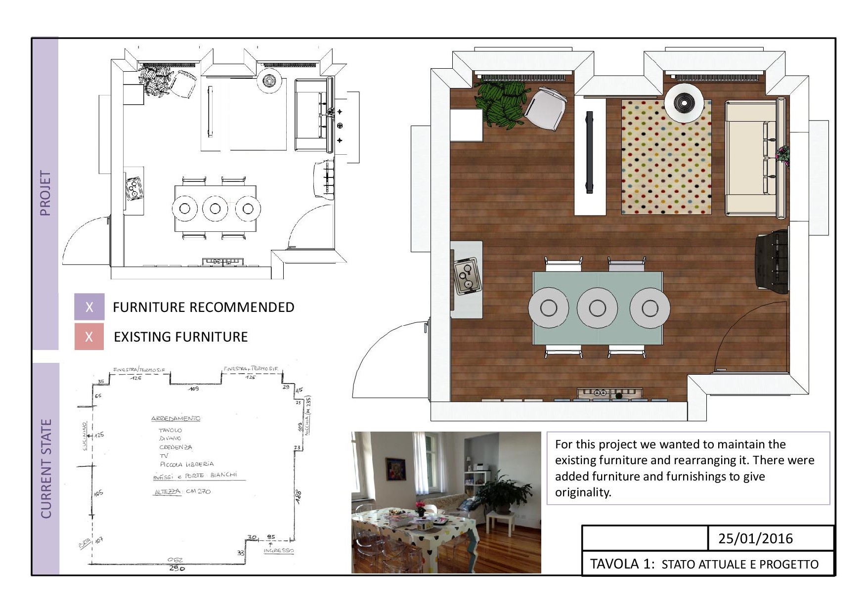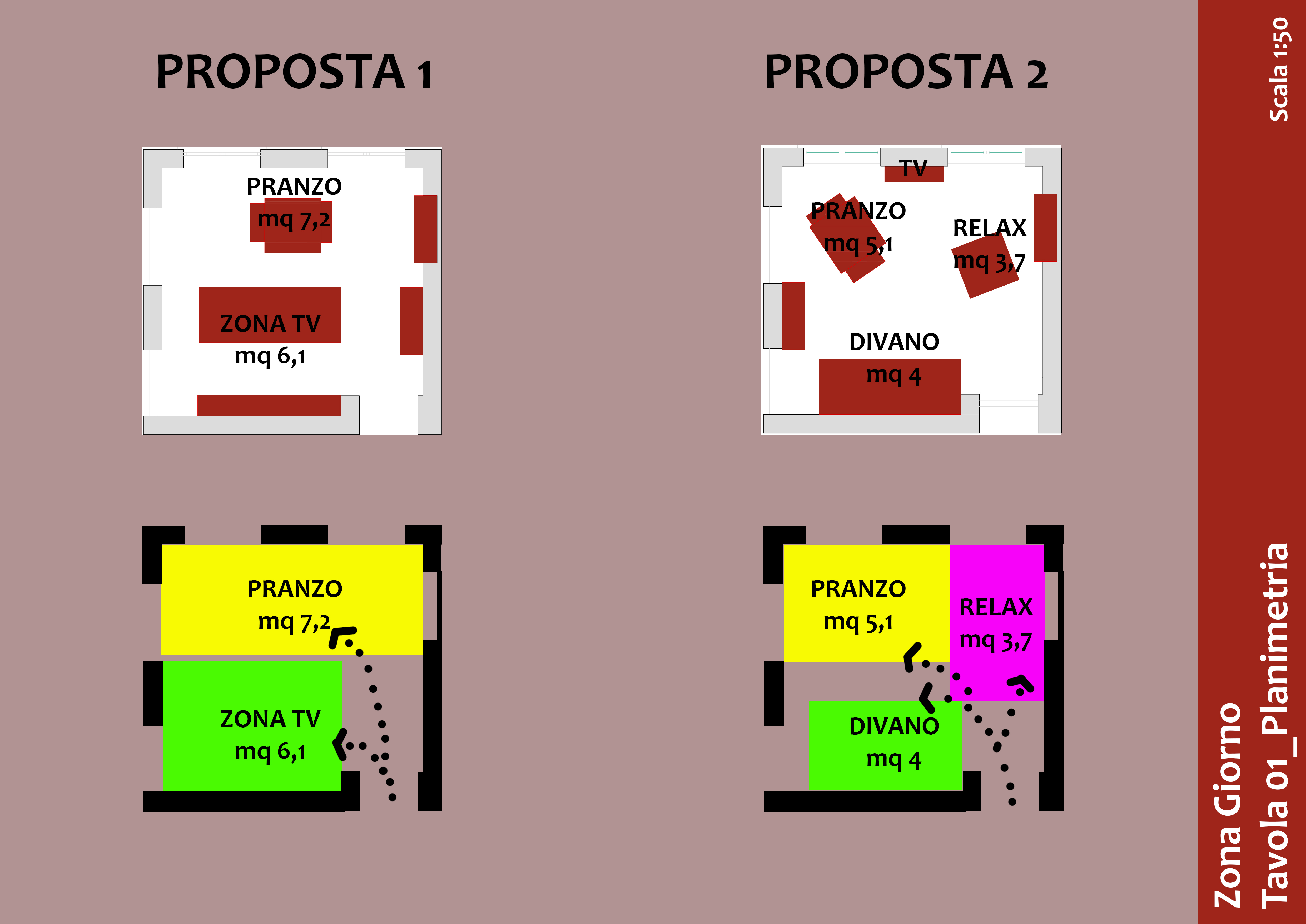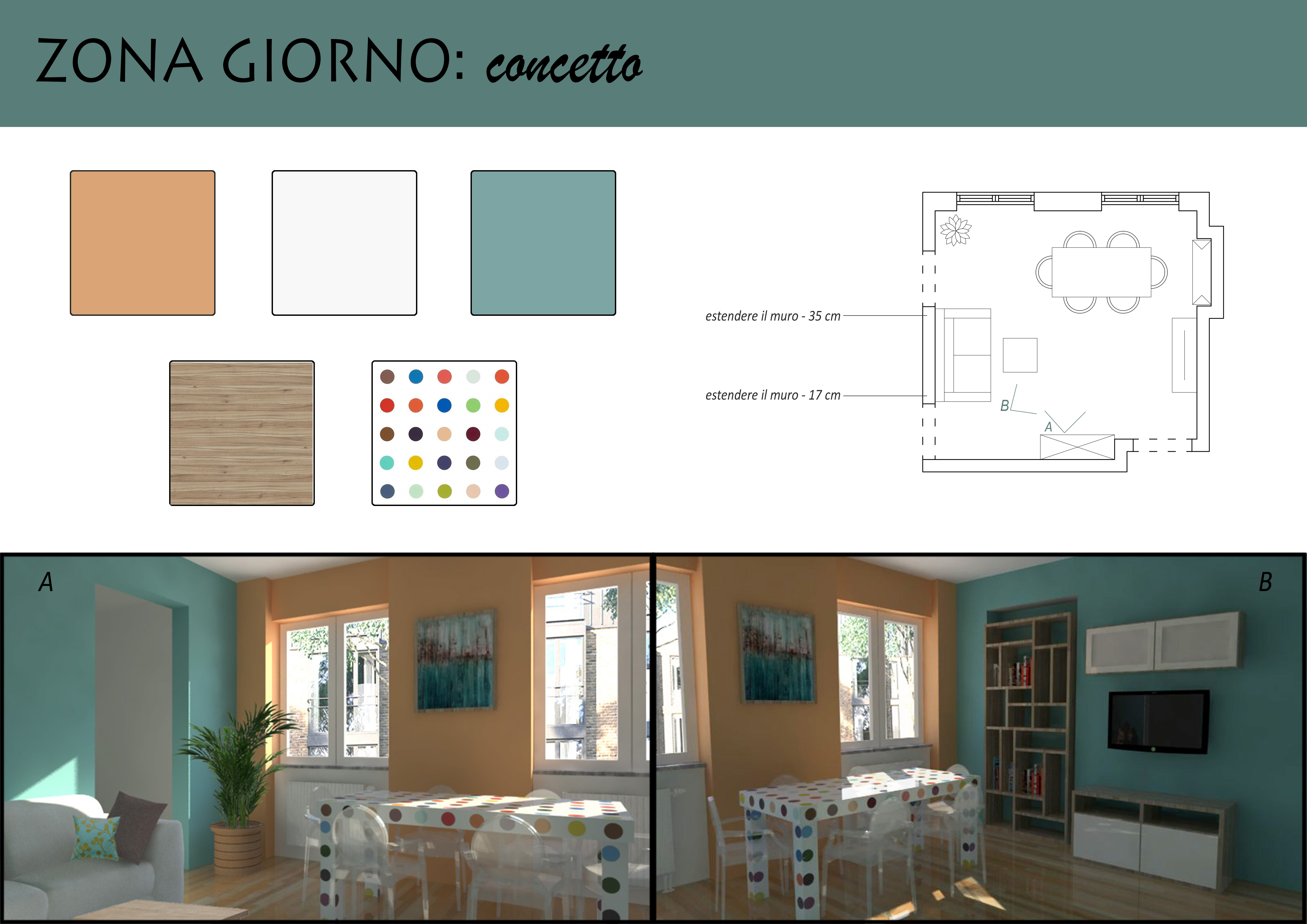 Proposta per nuova disposizione arredamento e colori pareti.