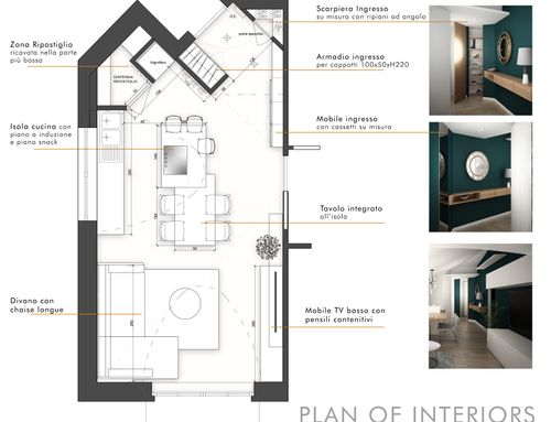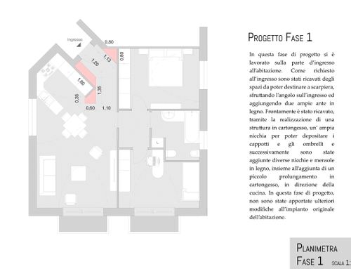 So we are asking you for a project that concerns an environment with modern style, wall colors, lowerings and niches in plasterboard, and for the entrance, provide custom-made furniture, perhaps also designed in plasterboard / wood. For this last environment, of SMALL DIMENSIONS, we ask you to develop ideas that try to contemplate aesthetics and containment eg: shoe rack, coat rack, mirror etc.