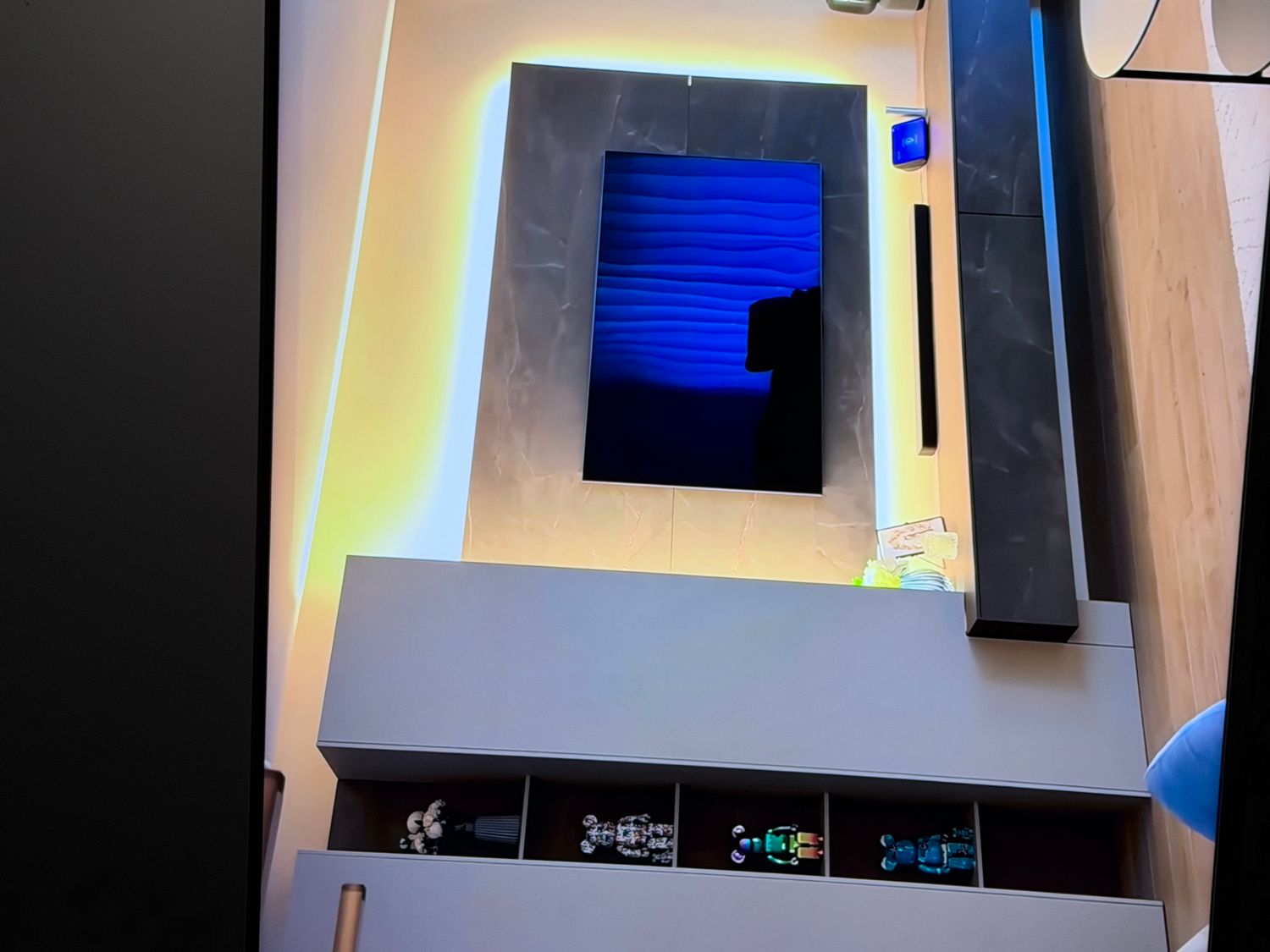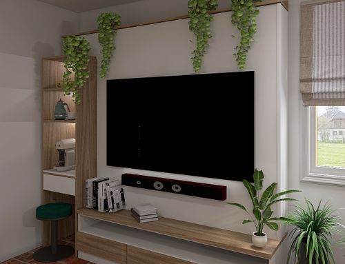 I’m looking for ideas for a room that is currently used as a storage area. The idea would be to turn it into a nice relaxation area with a sofa, TV, a TV wall unit where I can place a soundbar, etc. I’d also like a table, possibly extendable so it takes up less space when closed, and if there’s some room left, a small corner where I could place a coffee machine, for example.
