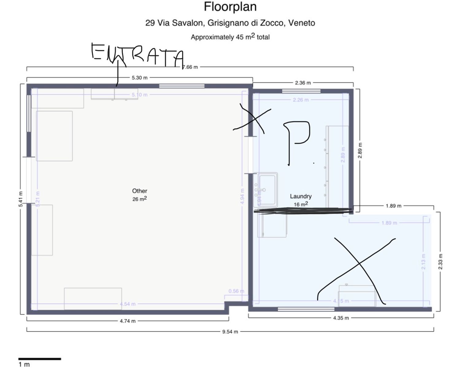 Then, in a smaller area that I can create, I’d like to set up a small home gym. I marked with “X” the section of wall I’d like to remove, together with the metal door, to give more openness to the room.