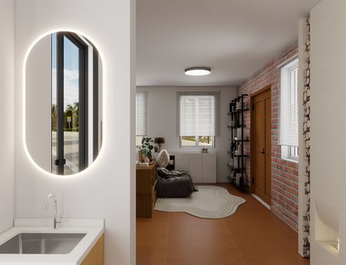 En cuanto al lavadero actual, dado que las conexiones de agua ya están ahí, me gustaría mantenerlo en esa posición, sustituyéndolo por un lavabo más moderno y pequeño, posiblemente integrado en un mueble hasta el suelo, con un espejo encima.