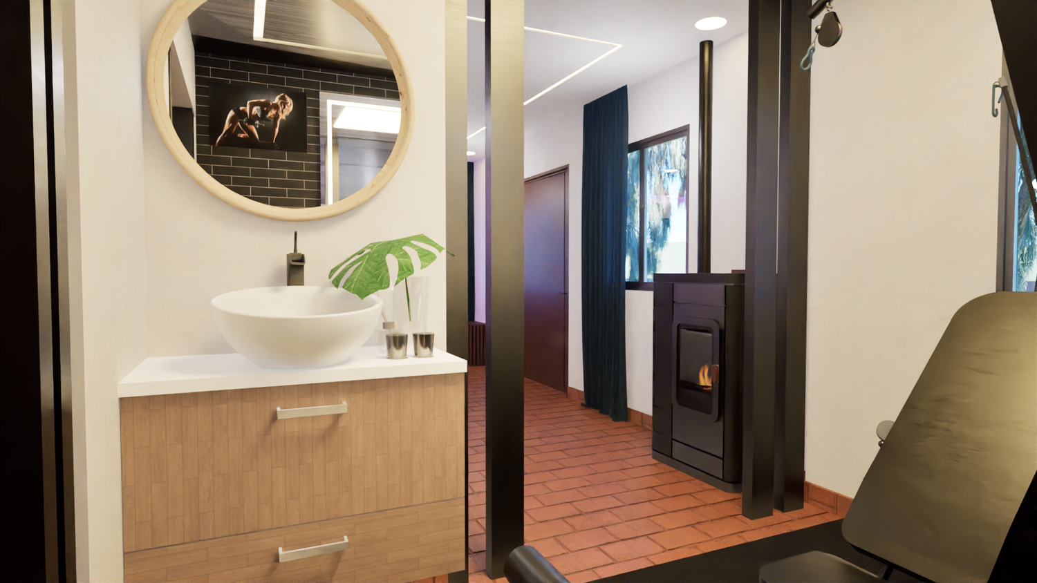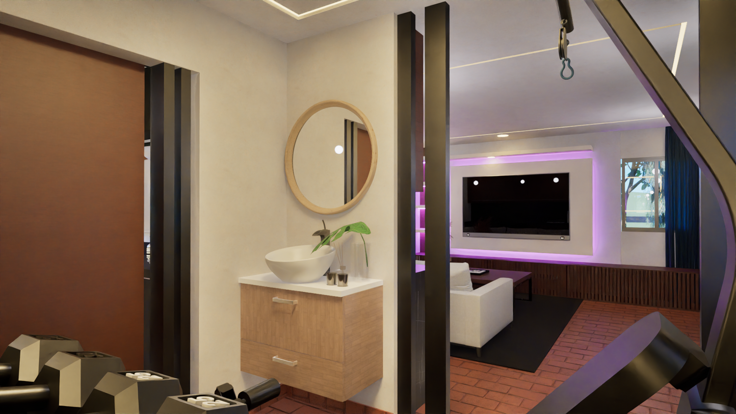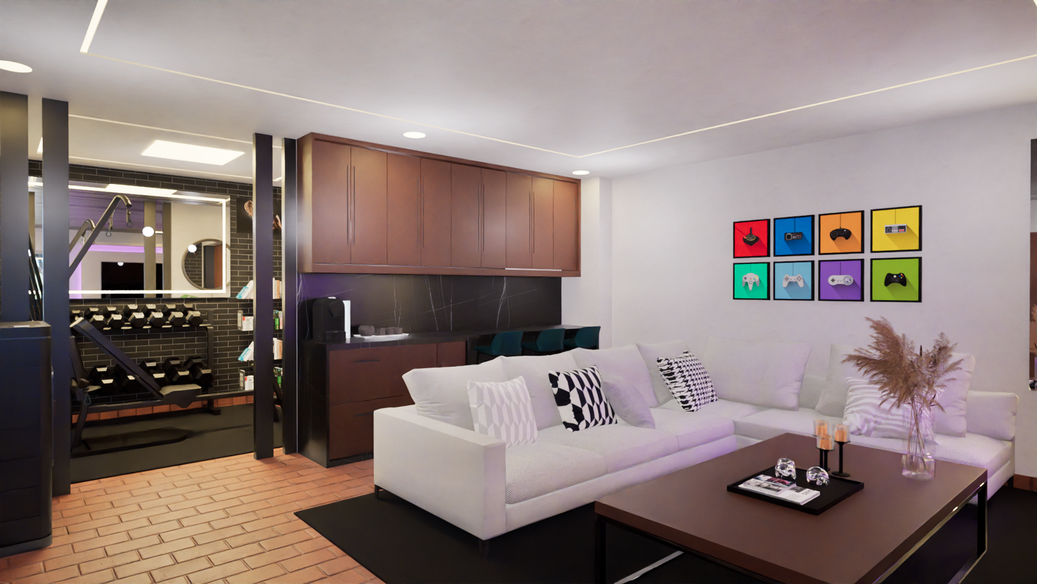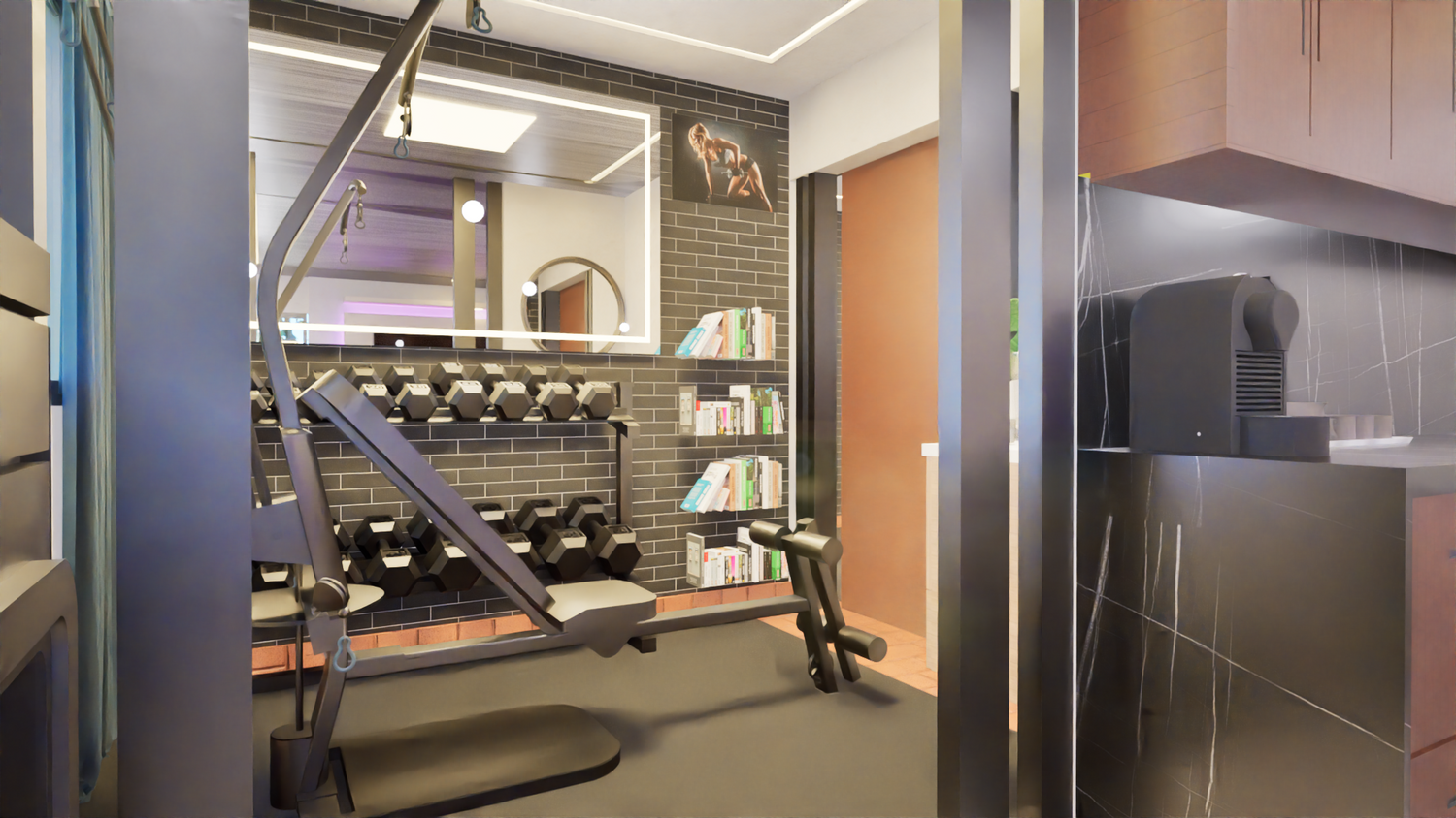 È stata prevista una barra dove saranno collocate la macchina del caffè e altri utensili, che potranno essere riposti nello stesso arredo. È stato inoltre lasciato uno spazio più riservato dove saranno collocati la palestra e il lavamani.