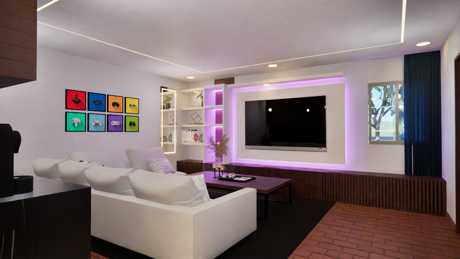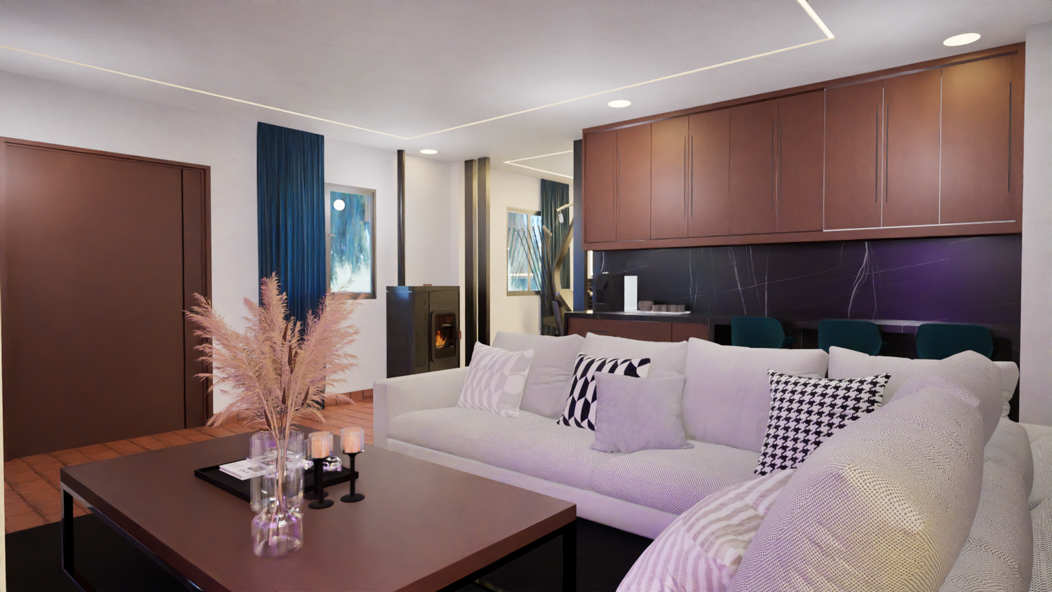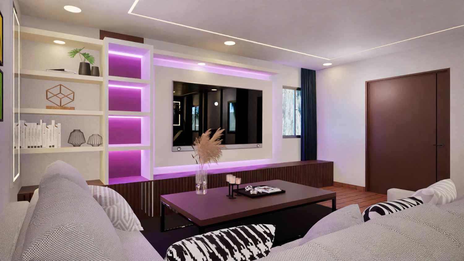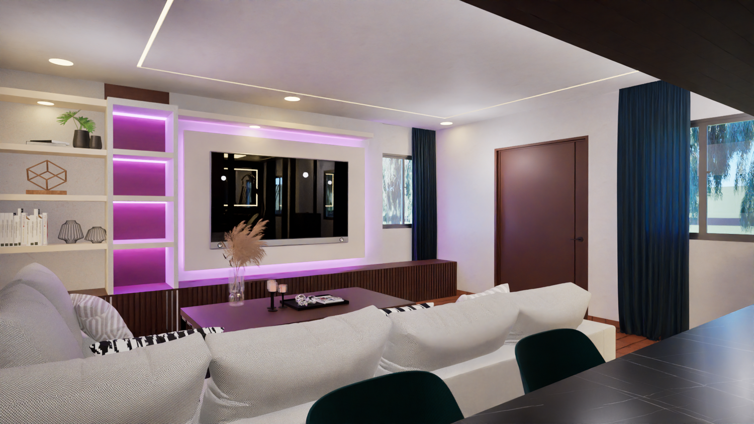 La proposta prevede l’utilizzo di colori bianchi in combinazione con tonalità del legno. È stato lasciato uno spazio per collocare un mobile progettato per la TV, dotato di luci LED, al fine di conferire un tocco moderno, mantenendo al contempo un ambiente che trasmetta tranquillità; su questo si basa la proposta cromatica.