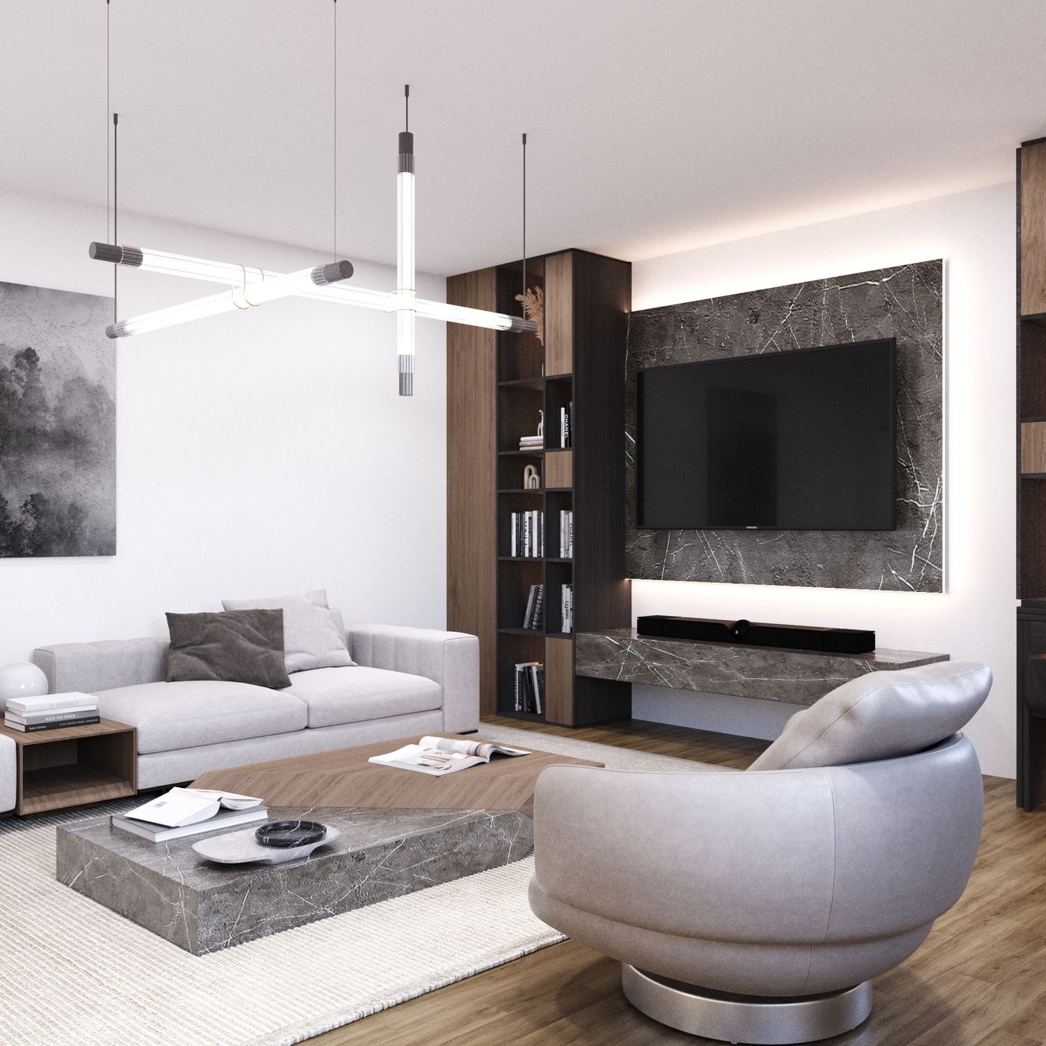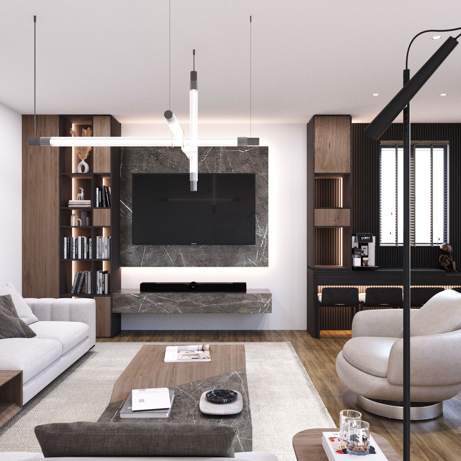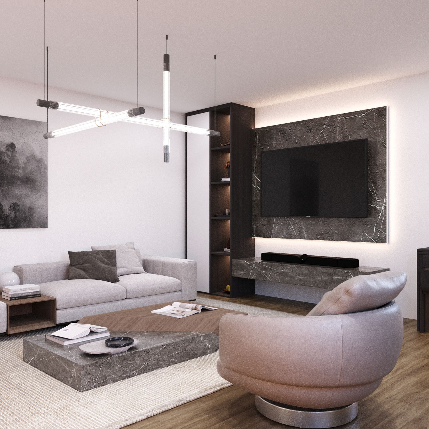 Parete TV Integrata: Arricchita da texture in marmo moderno e illuminazione nascosta, la parete TV è ottimizzata per soundbar e apparecchiature multimediali. Raggruppare tutte queste funzioni su un'unica parete ha permesso di lasciare un'area centrale ampia e spaziosa.