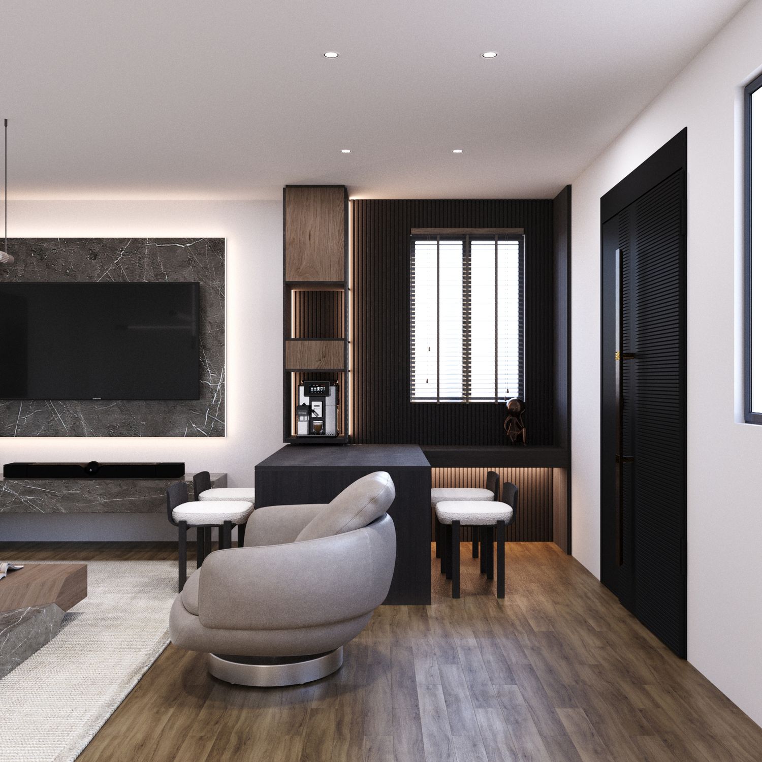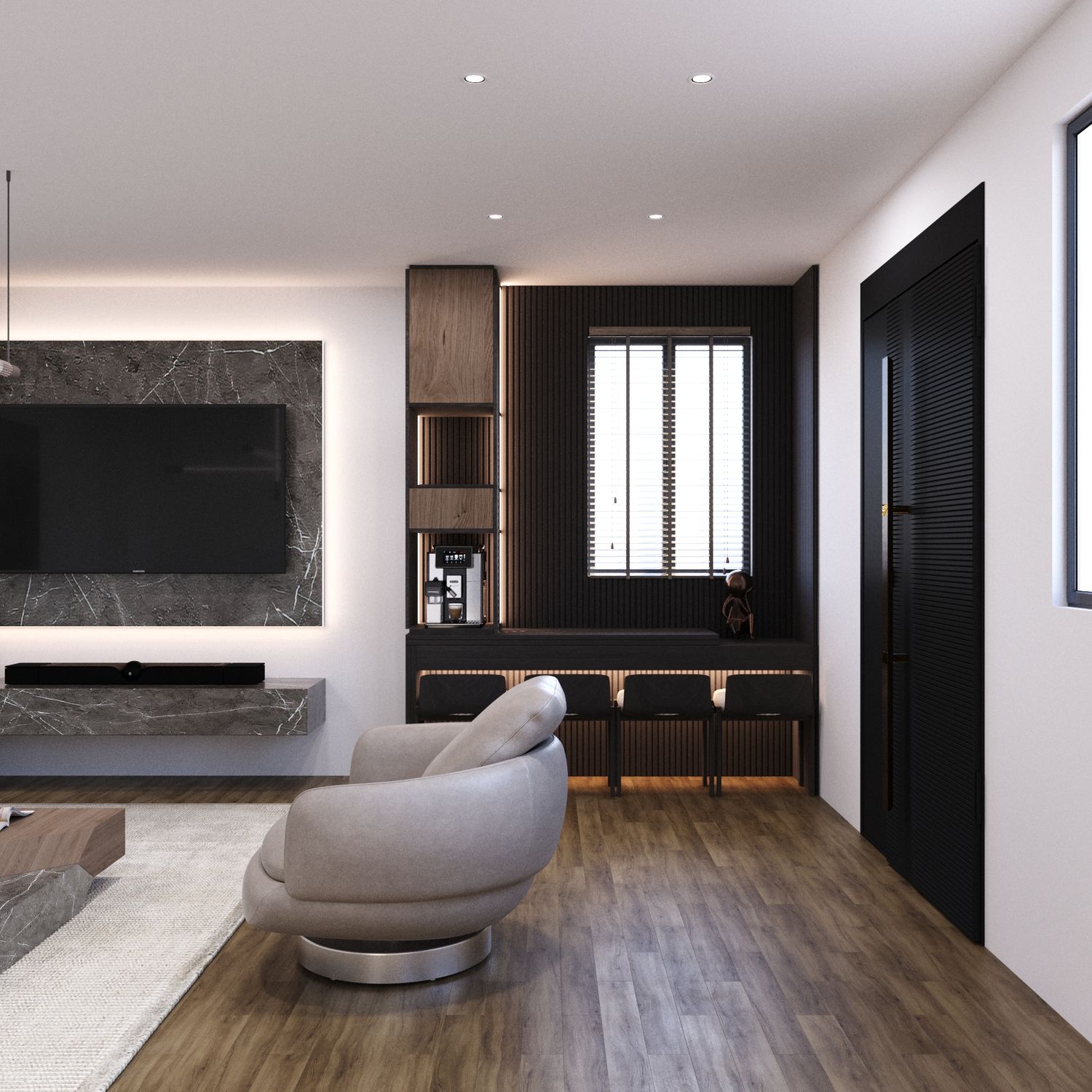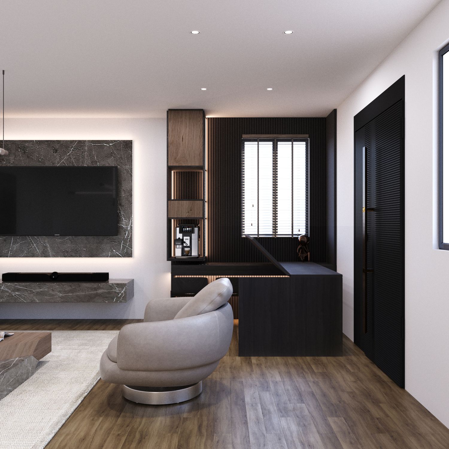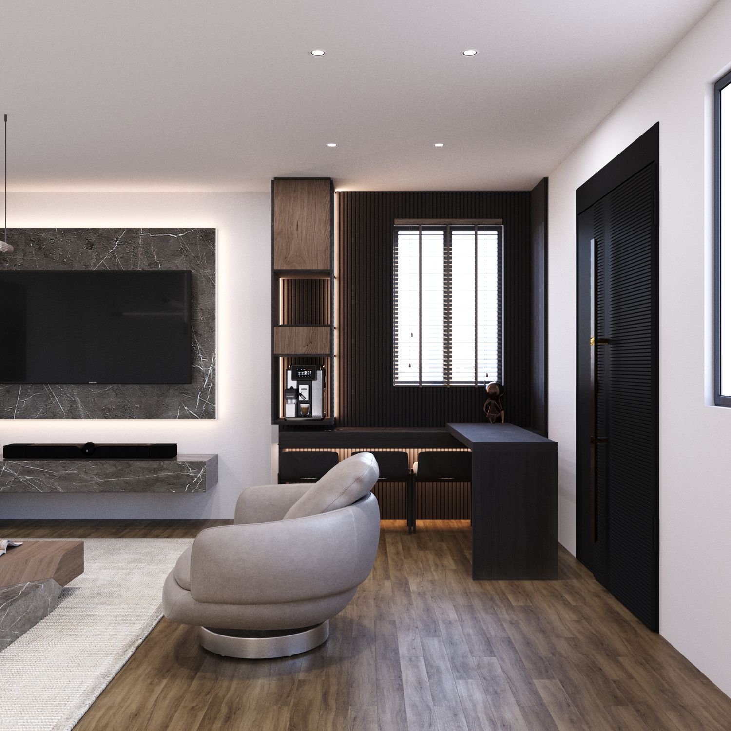 Parete TV Integrata: Arricchita da texture in marmo moderno e illuminazione nascosta, la parete TV è ottimizzata per soundbar e apparecchiature multimediali. Raggruppare tutte queste funzioni su un'unica parete ha permesso di lasciare un'area centrale ampia e spaziosa.