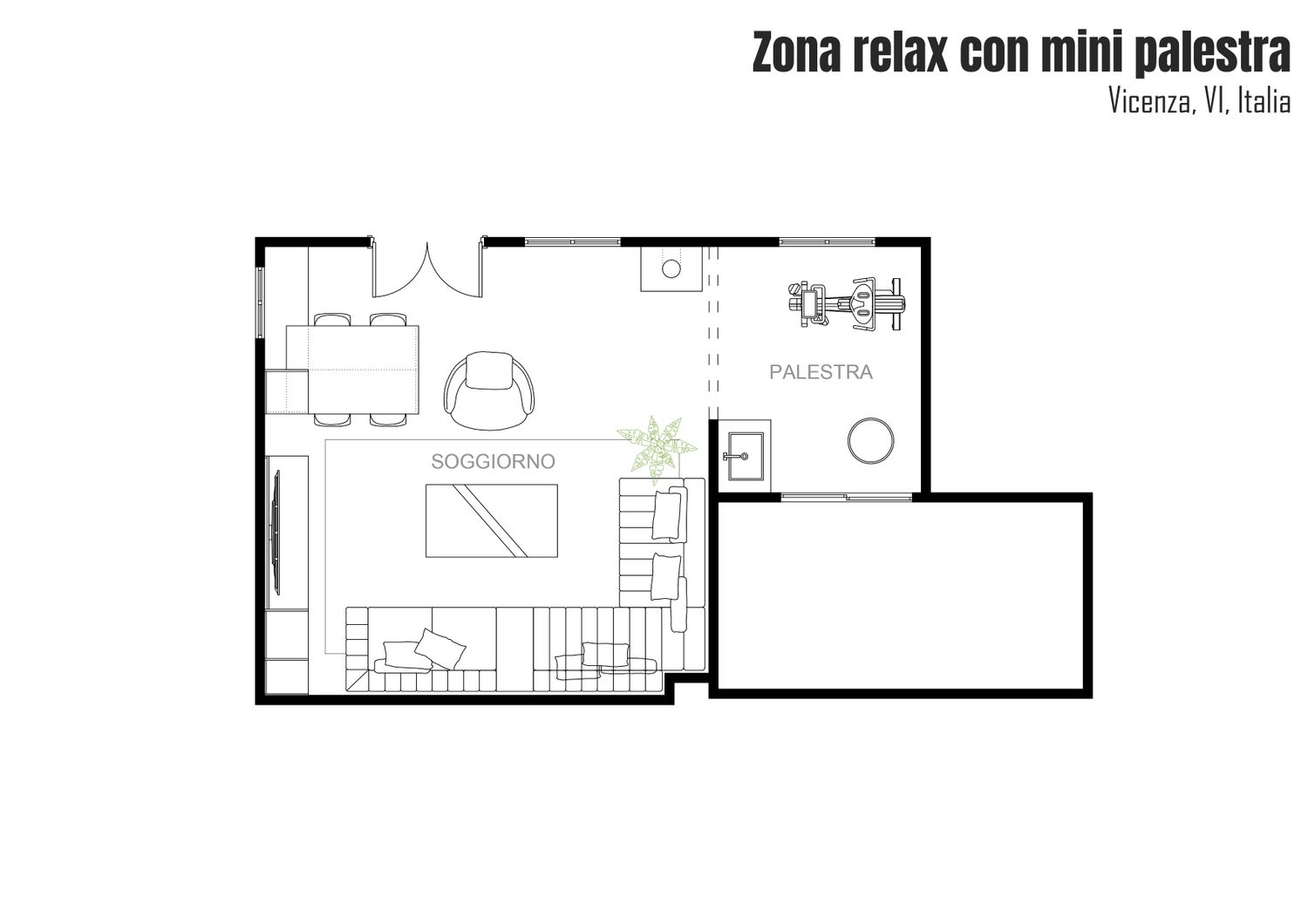 Disposizione Focalizzata sul Comfort: Al centro della stanza è stato posizionato un ampio divano a L con poltrona, dove il comfort è prioritario. Questa zona lounge di fronte alla TV offre l'ambiente ideale sia per guardare film che per il relax prolungato.