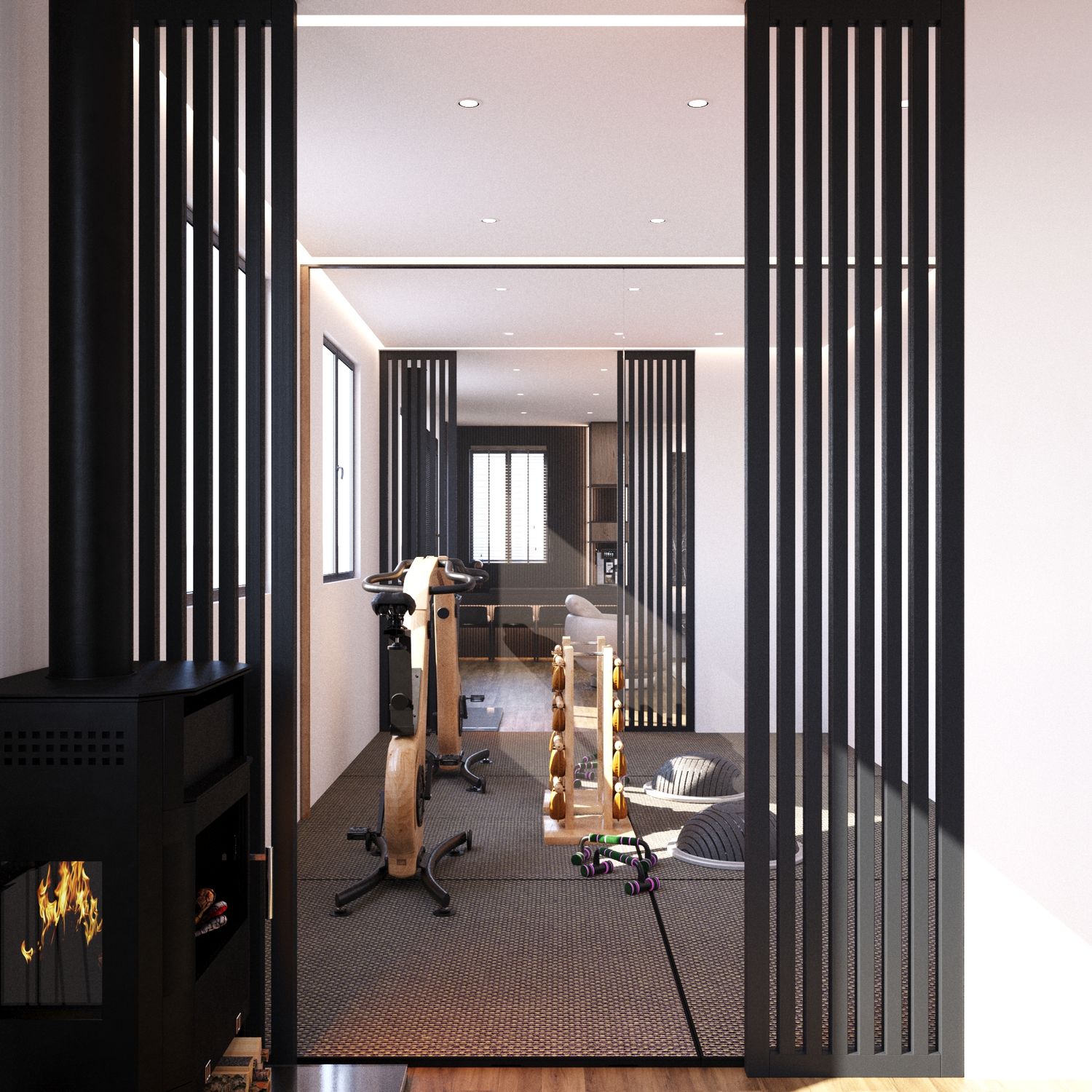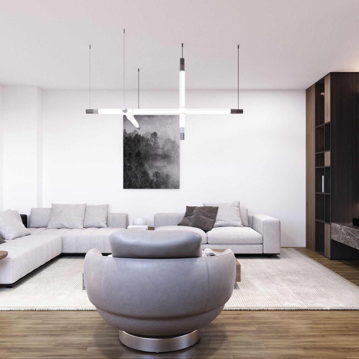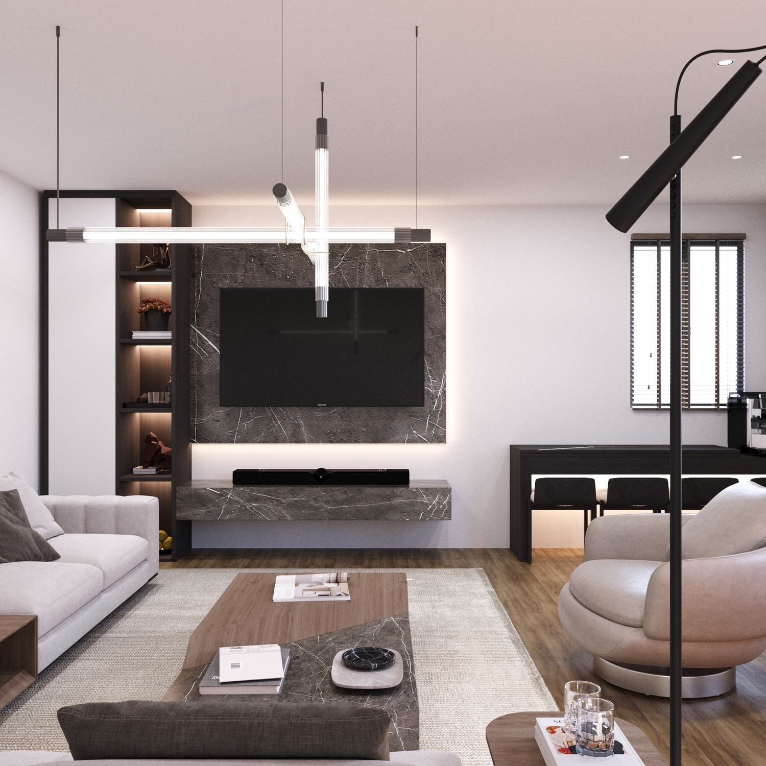 Illuminazione: Le lampade a sospensione lineari moderne e l'illuminazione a nicchia aumentano la profondità dello spazio, conferendo un tocco sofisticato.