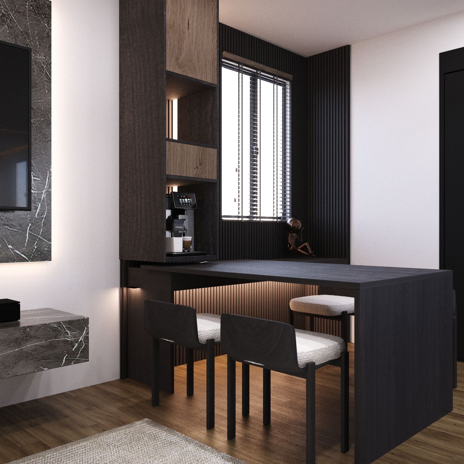 Soluzione con Tavolo Intelligente: L'unità situata all'ingresso funge da elegante console e postazione di lavoro efficiente per l'uso quotidiano; all'occorrenza, si trasforma in un tavolo da pranzo per 4 persone. Questa struttura modulare offre la massima funzionalità senza limitare lo spazio di movimento.