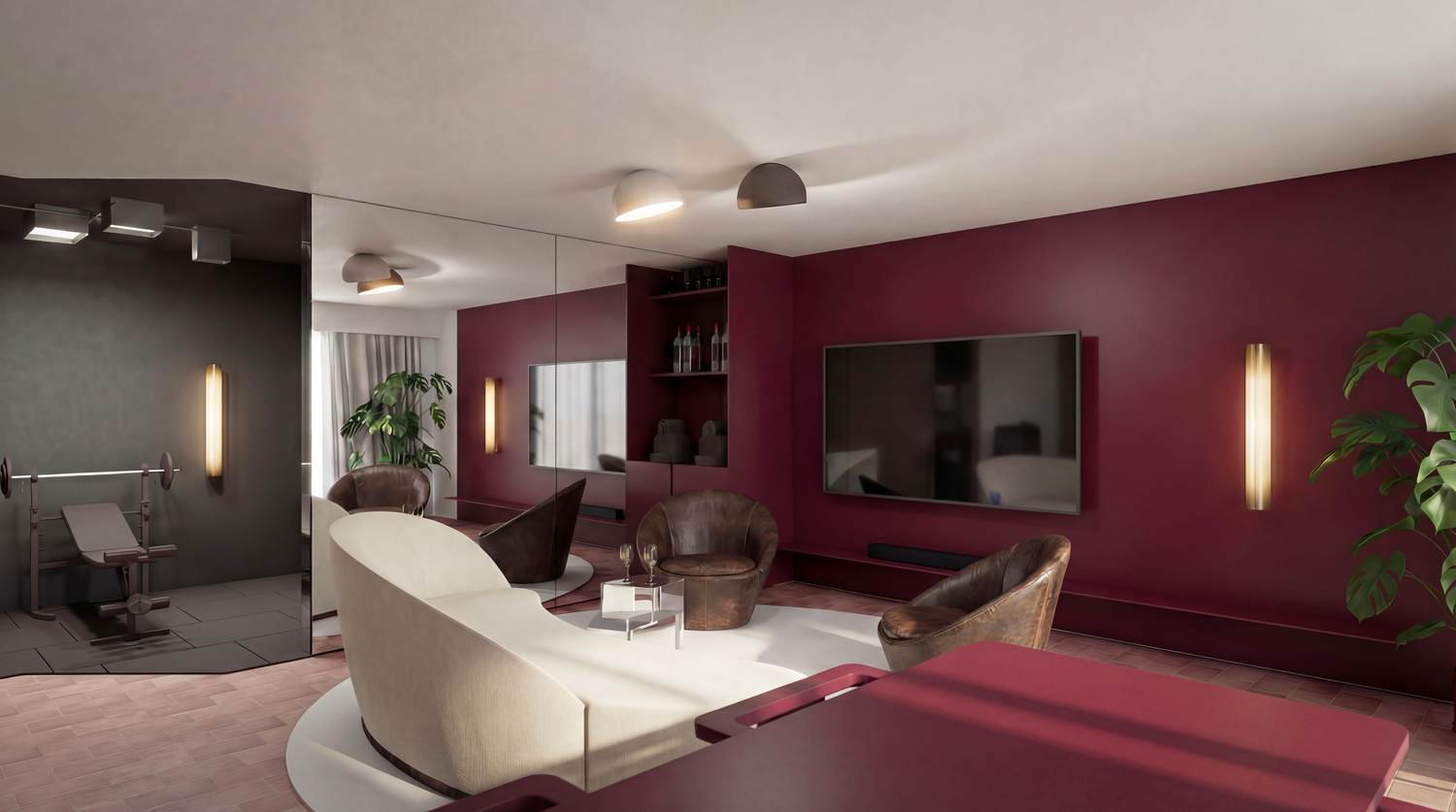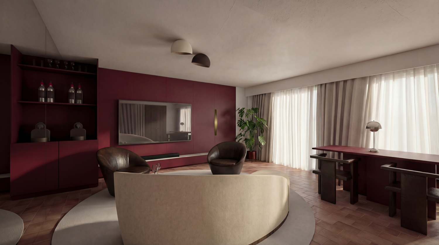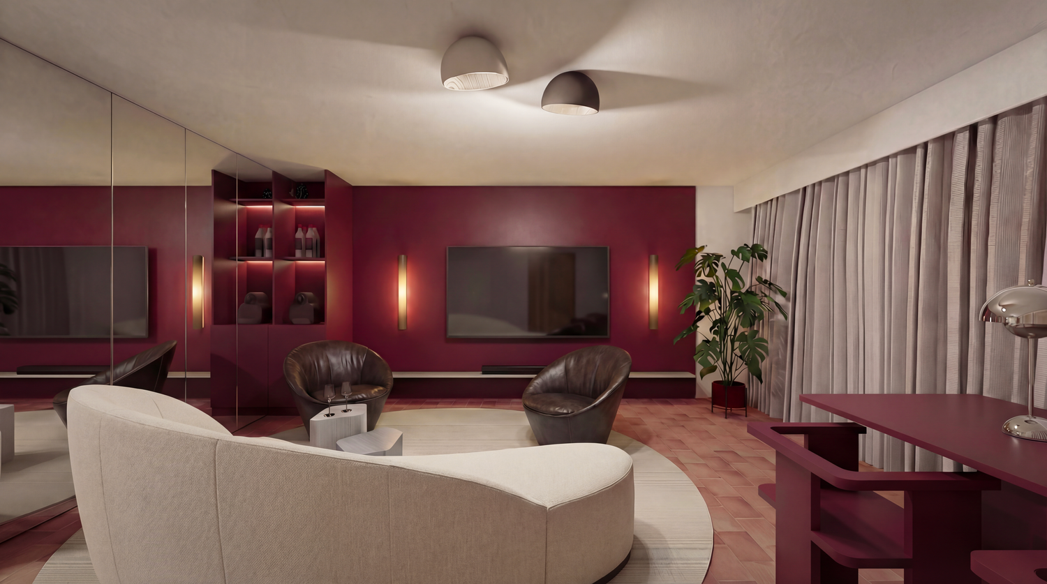 La zona lounge invita a rallentare, ad assaporare il tempo e a vivere lo spazio in modo rilassato. Sedute comode dalle forme morbide e avvolgenti dialogano con una palette cromatica calda e rassicurante. Il grande televisore è integrato in una boiserie in laminato color Borgogna, richiamo a uno dei vini più pregiati e raffinati, che diventa elemento caratterizzante dello spazio. La boiserie si trasforma anche in un sistema contenitivo: attraverso un mobile cantinetta consente di mascherare il dente generato dalle pareti esterne, risolvendo una criticità distributiva con un gesto progettuale discreto ed elegante.