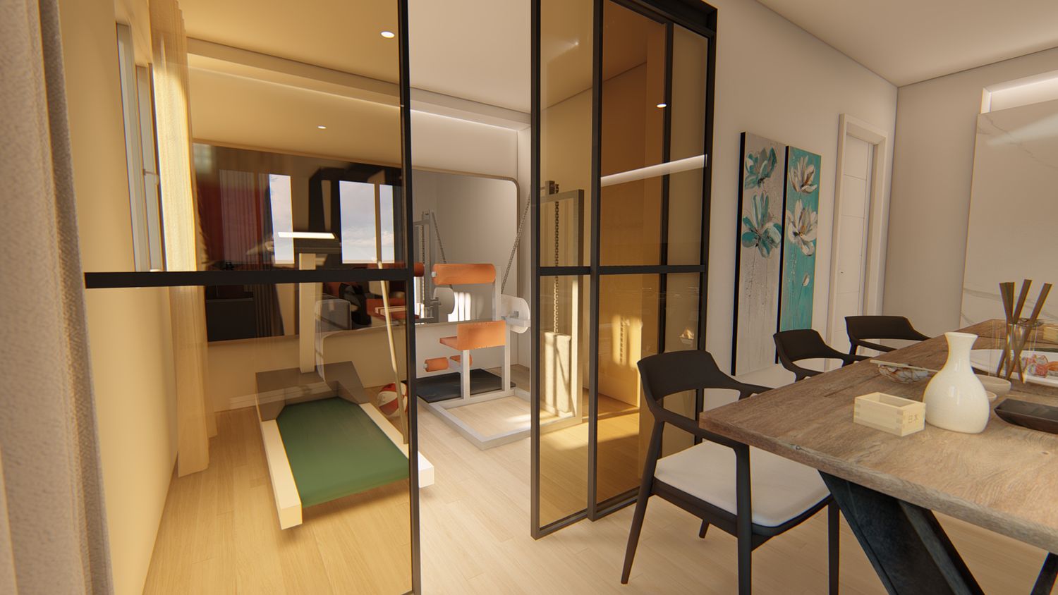 La nicchia nell'area in cui si elimina parte della tramezza diventa uno spazio fitness chiudibile con porta scorrevole vetrata, il lavabo viene spostato nel locale lavanderia ed inserito in una capiente parete attrezzata, insieme a lavatrice, asciugatrice, colonna per scope e detersivi, stenditoio pieghevole e asse da stiro pieghevole o a scomparsa.