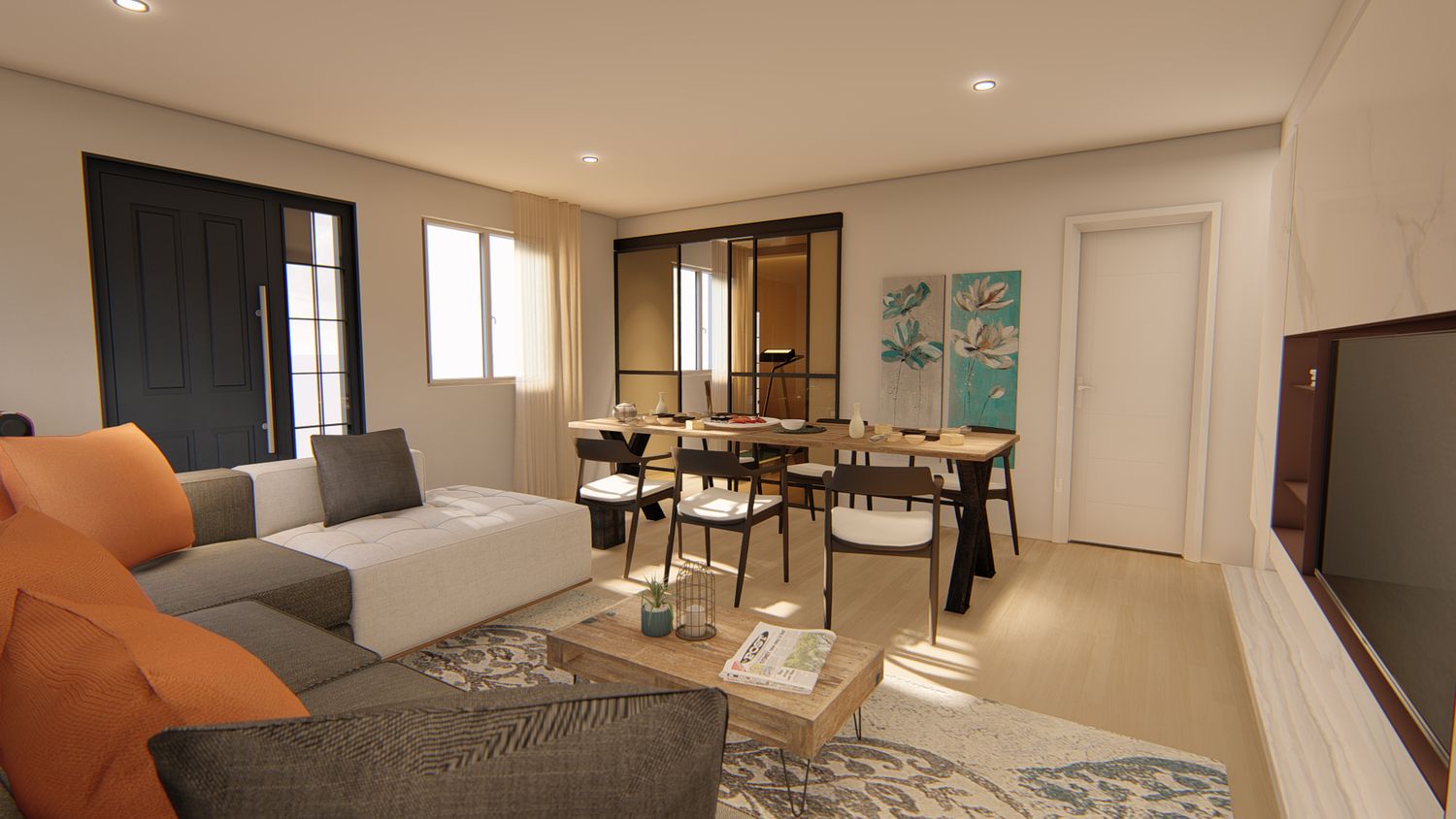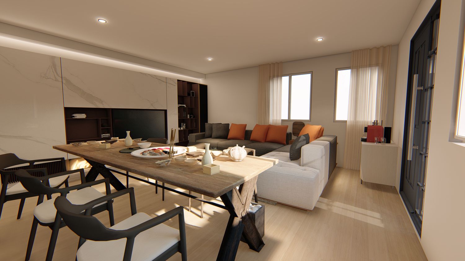 A terra, gres effetto parquet (https://www.iperceramica.it/it/ita/catalogo/pavimento-spc-harbour-caramel-effetto-legno-rovere-marrone-chiaro); illuminazione d'effetto diretta (faretti led) e indiretta (barre led incassate in velette di cartongesso).