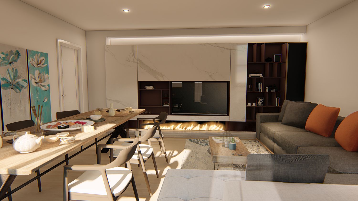 La nostra proposta per l'area relax prevede un'ampia zona open con un divano modulare, una capiente parete libreria-TV con camino lineare a bioetanolo, un tavolo allungabile ed un piccolo mobile/madia con coffee corner, equipaggiato di macchina da caffè e spazio stoviglie.