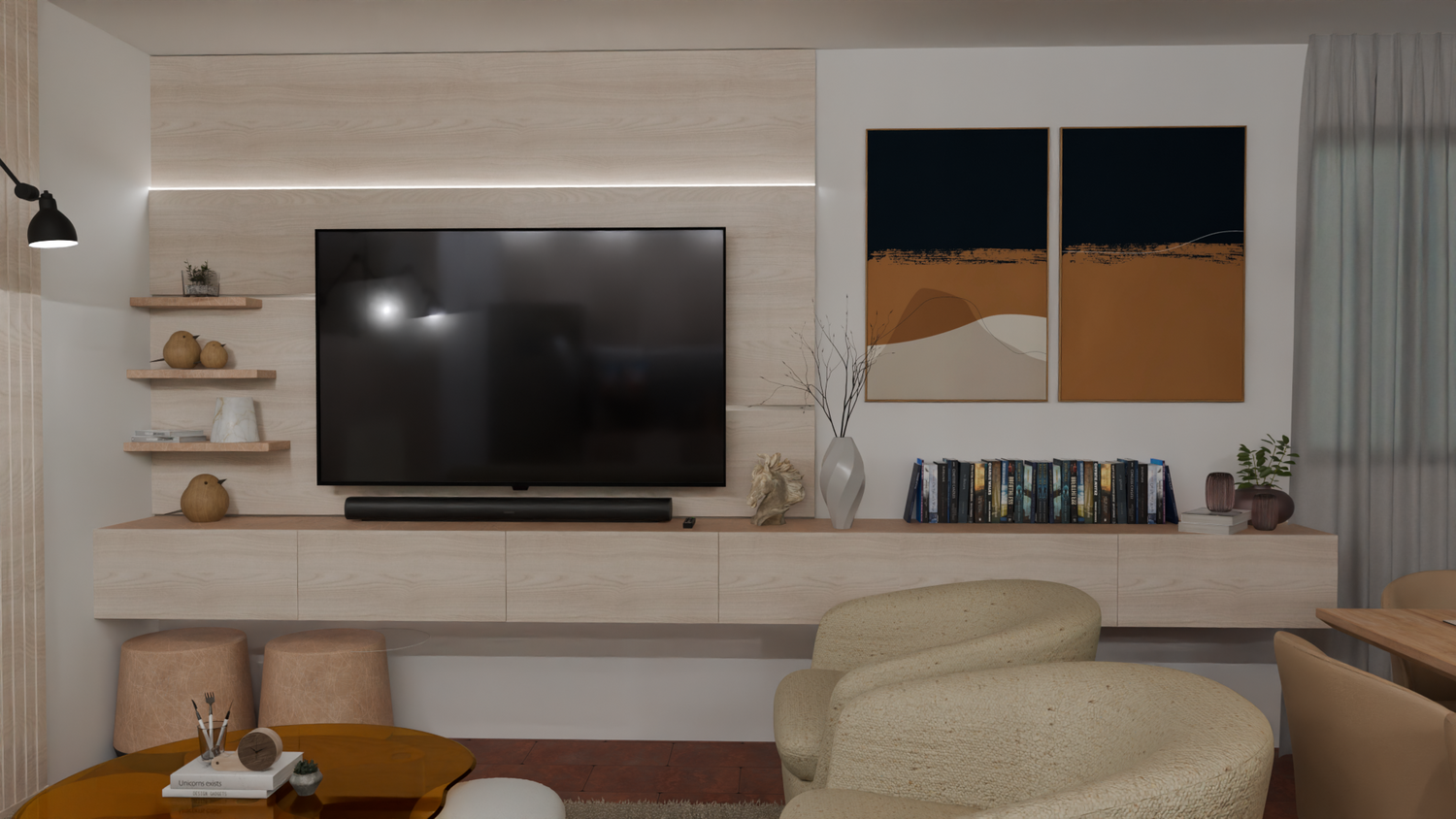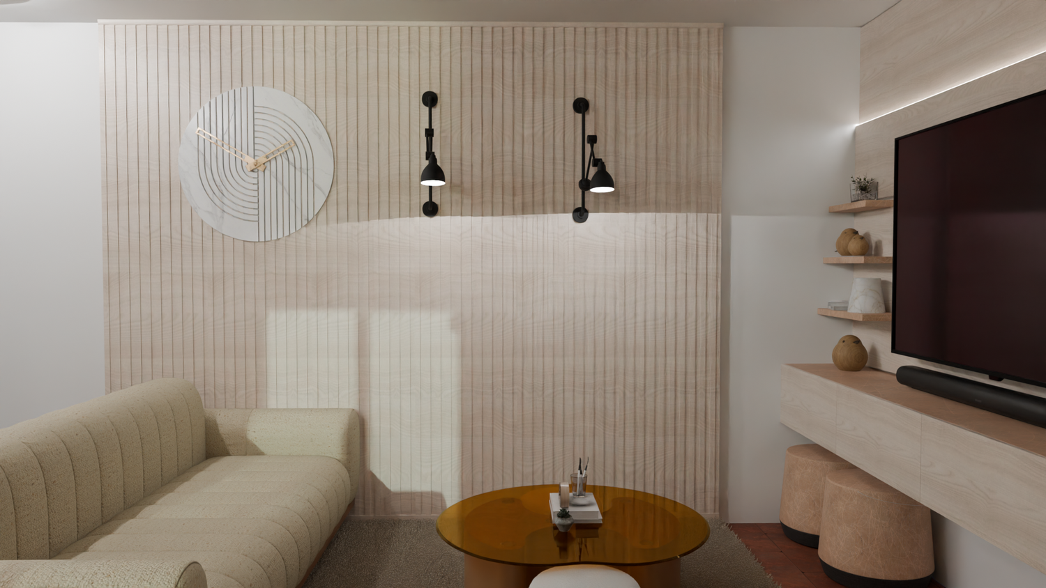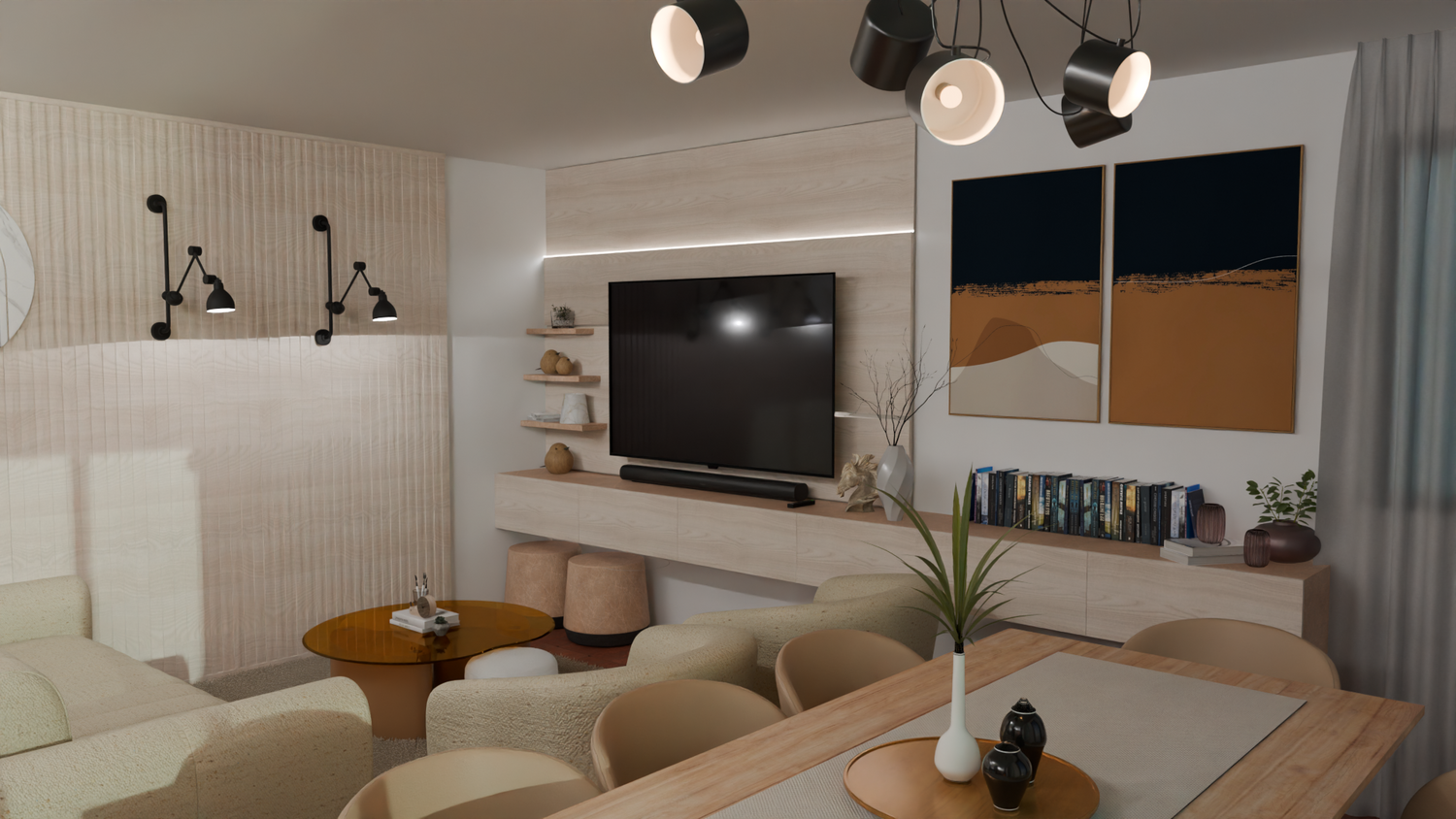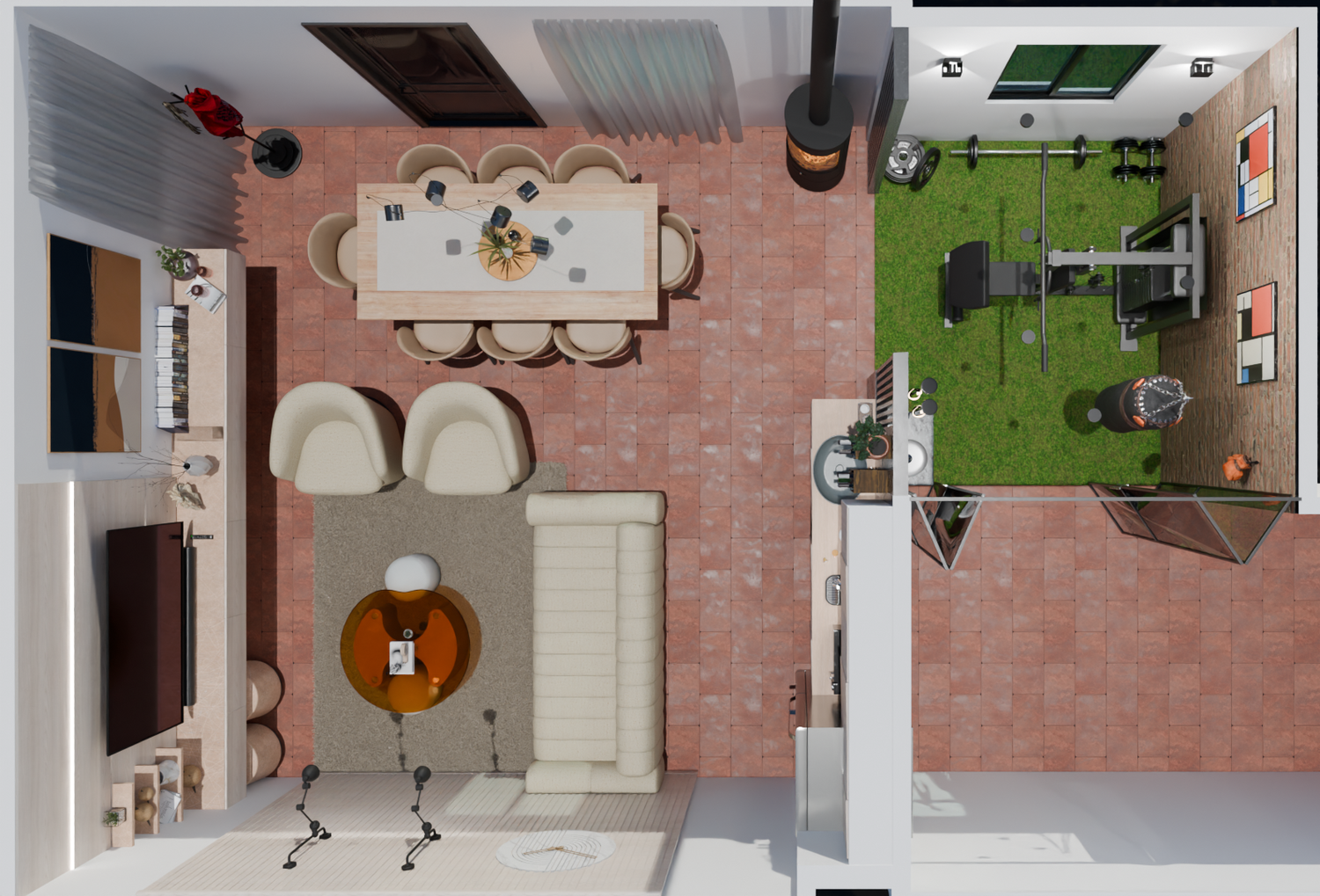 In questo progetto, la sfida principale era inserire ogni elemento d'arredo senza sacrificare l'ampiezza visiva, e abbiamo ottenuto questo risultato creando tre aree distinte ma connesse. Nella zona living abbiamo posizionato un grande divano lineare e due poltroncine avvolgenti fronte TV per definire chiaramente l'area conversazione. La parete attrezzata corre lungo tutto il perimetro laterale, offrendo spazio per i libri e la tecnologia in modo ordinato e lineare. Spostandoci verso la zona fitness, noterà come abbiamo utilizzato i listelli in legno come 'filtro' visivo: questo arredo non chiude lo spazio ma delimita la palestra, dove abbiamo inserito la stazione multifunzione e il sacco da boxe su un tappeto di erba sintetica che definisce la funzione dell'area.Infine, l'area dining e kitchenette è stata disposta in modo da non intralciare i passaggi: il tavolo da pranzo è vicino alla stufa per creare atmosfera, mentre la cucina compatta è addossata alla parete con il frigorifero incassato in un modulo laterale, qui è stato inserito un altro piccolo lavabo sfruttando gli scarichi già presenti sul retro.
