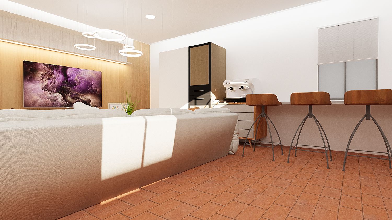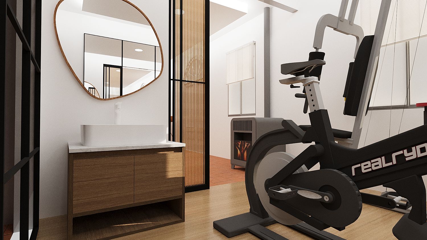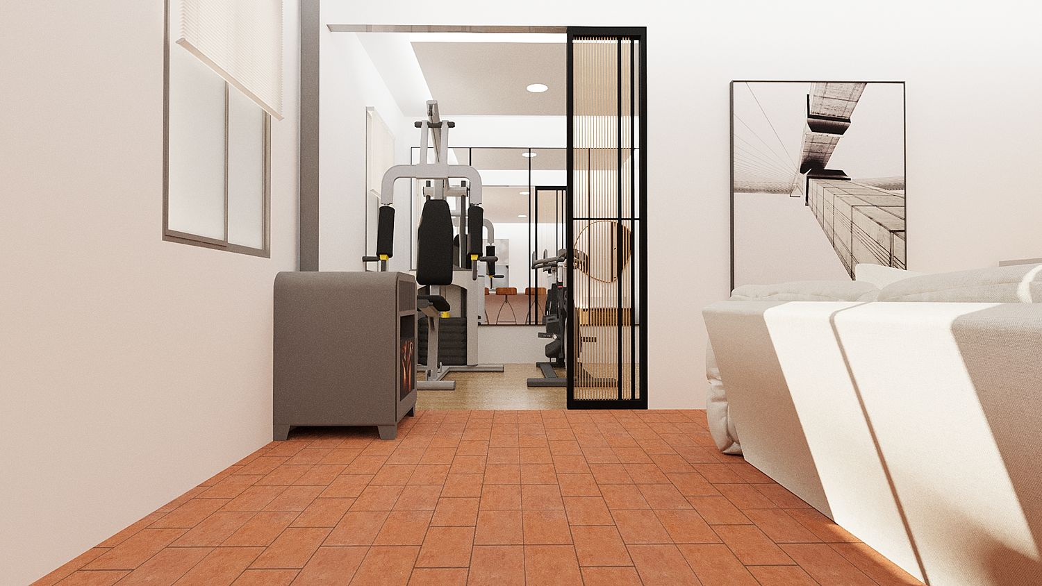 This design preserves the existing terracotta flooring to maintain its natural warmth and character, creating a timeless and grounded atmosphere throughout the main living areas. To enhance functionality and durability, SPC flooring is selectively applied in the gym area, providing better resistance to impact, moisture, and daily physical activities.