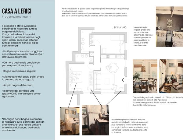 Disegno di interni, scelta dei materiali di rivestimento, finiture, progettazione di arredi su misura, illuminazione esterna ed interna, e disegno del giardino per un bed & breakfast vicino al mare.