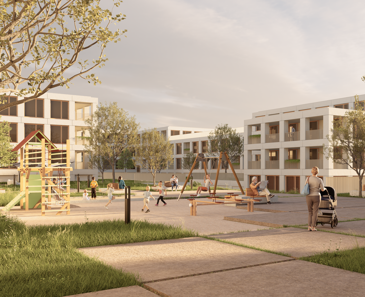 This project proposes a unique housing complex located in Zegrze, near Zegrzyńskie Lake and key transport links. The core concept transforms a traditional urban block into a sculpted "canyon" form, replacing a standard enclosed layout with a fluid design that ensures a smooth transition between the public street and the private residential interior. The heart of the development is a central public square featuring retail and gastronomy to foster social integration, while a linear atrium and a series of intimate courtyards provide gradation of privacy. The four-story development comprises 150 apartments (approx. 8,610 m² of usable residential area), balancing high aesthetic standards with functional comfort.