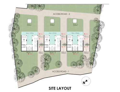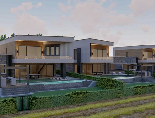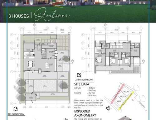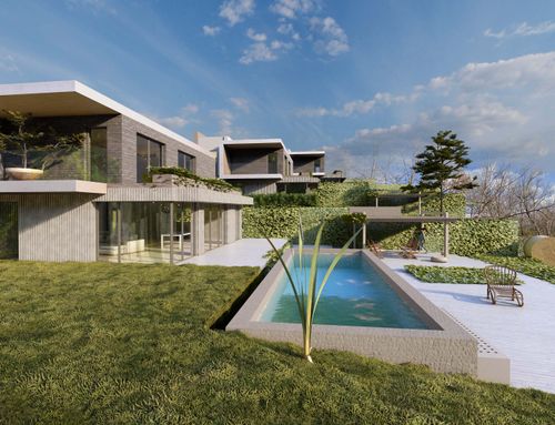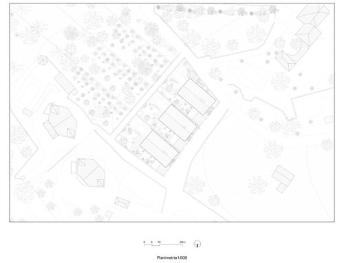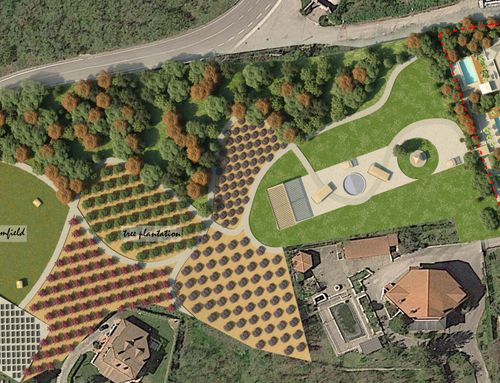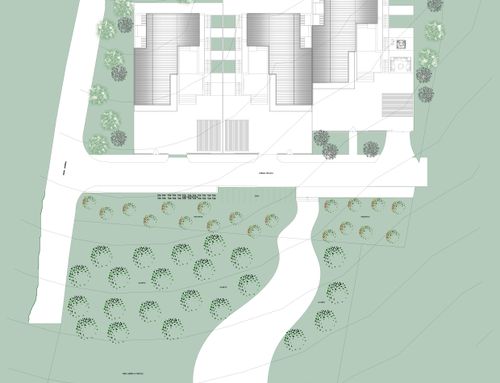 Hi Everyone, we have a lot of about 18.000sqm on which to build 3 adjacent 300sqm villas (150 per floor on two floors). The lot has a slope of 30% -40% in front (to the south) we would like to create an area equipped with gardens and swimming pool while at the end (always to the south, crossing the path to be built indicated in yellow) a space reserved for the garden, fruit and vegetables and even further down to a small farm. The houses are on two levels, the living area on the ground floor and the sleeping area on the first floor, the ground floor partly underground so as not to create cubature. A space for parking cars and for an external gazebo that does not have cubic volume must also be taken into the land.