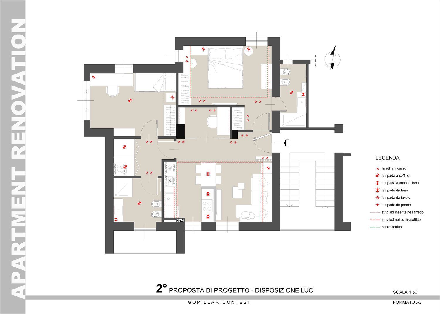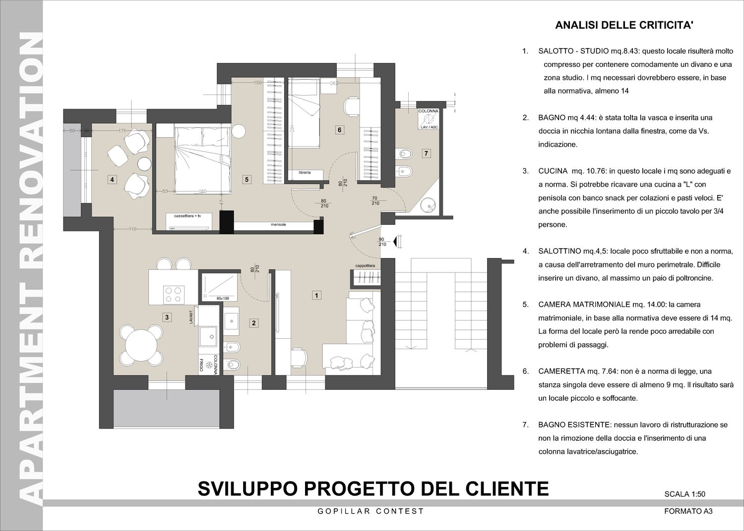per il Suo appartamento ho sviluppato una proposta progettuale a partire dallo schizzo condiviso in chat, che riflette fedelmente quanto emerso durante il briefing iniziale. Da questa base ho analizzato e messo in evidenza le principali criticità, sia normative sia funzionali, che potrebbero presentarsi in fase di sviluppo.