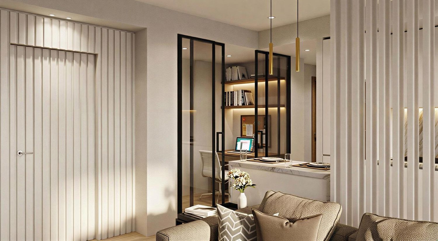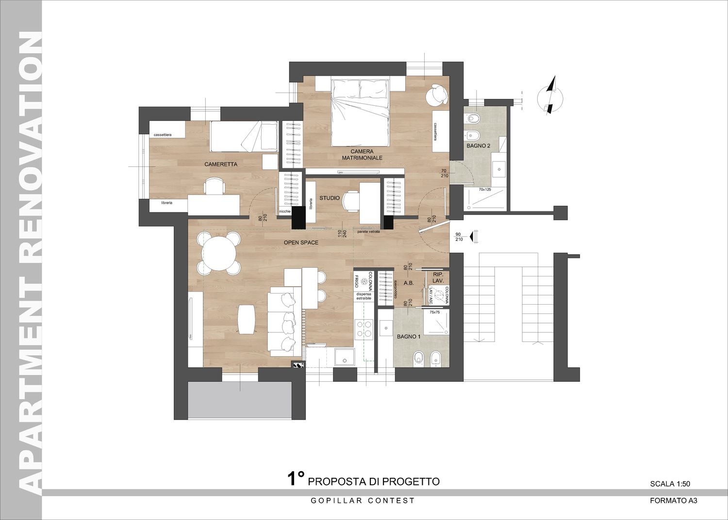 Questa soluzione rappresenta un ribaltamento della precedente: l’ingresso si apre direttamente su un ampio open space che comprende cucina, soggiorno e studio. Il bagno principale viene invece collocato nella parte finale dell’appartamento.