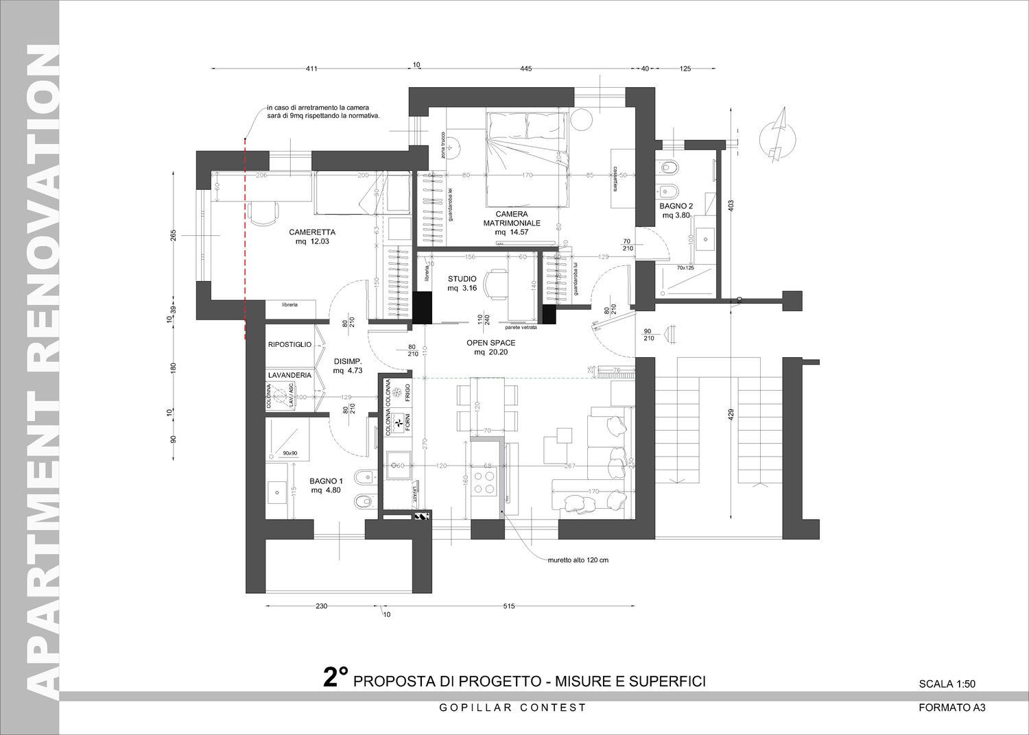 Il disimpegno distribuisce la cameretta e una zona ripostiglio/lavanderia, che può essere schermata con ante a filo, come un armadio, oppure delimitata da pareti e porte tradizionali. In questa configurazione, il terrazzo viene utilizzato come area di servizio per la stesura dei panni, risultando funzionalmente collegato alla lavanderia.