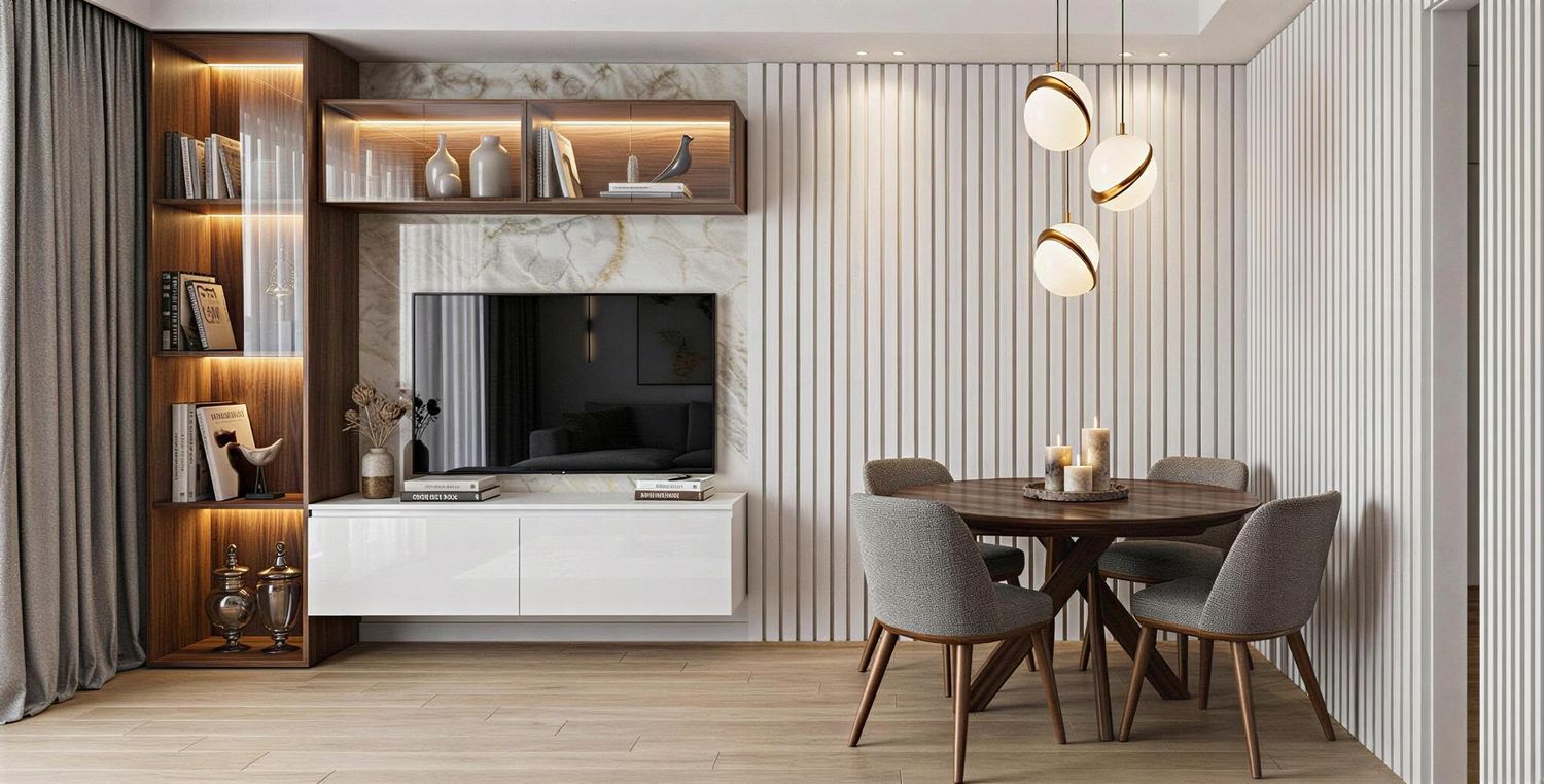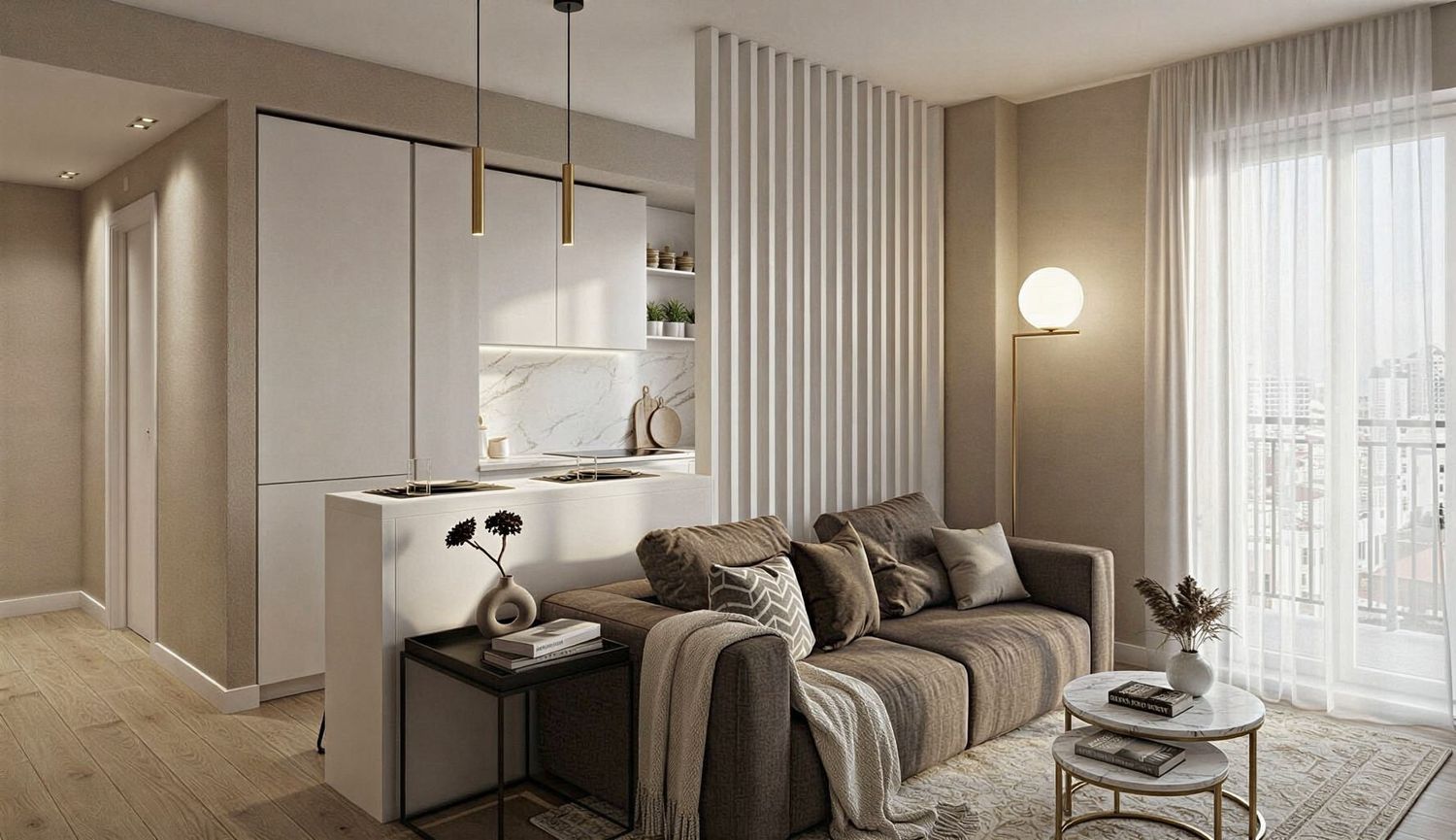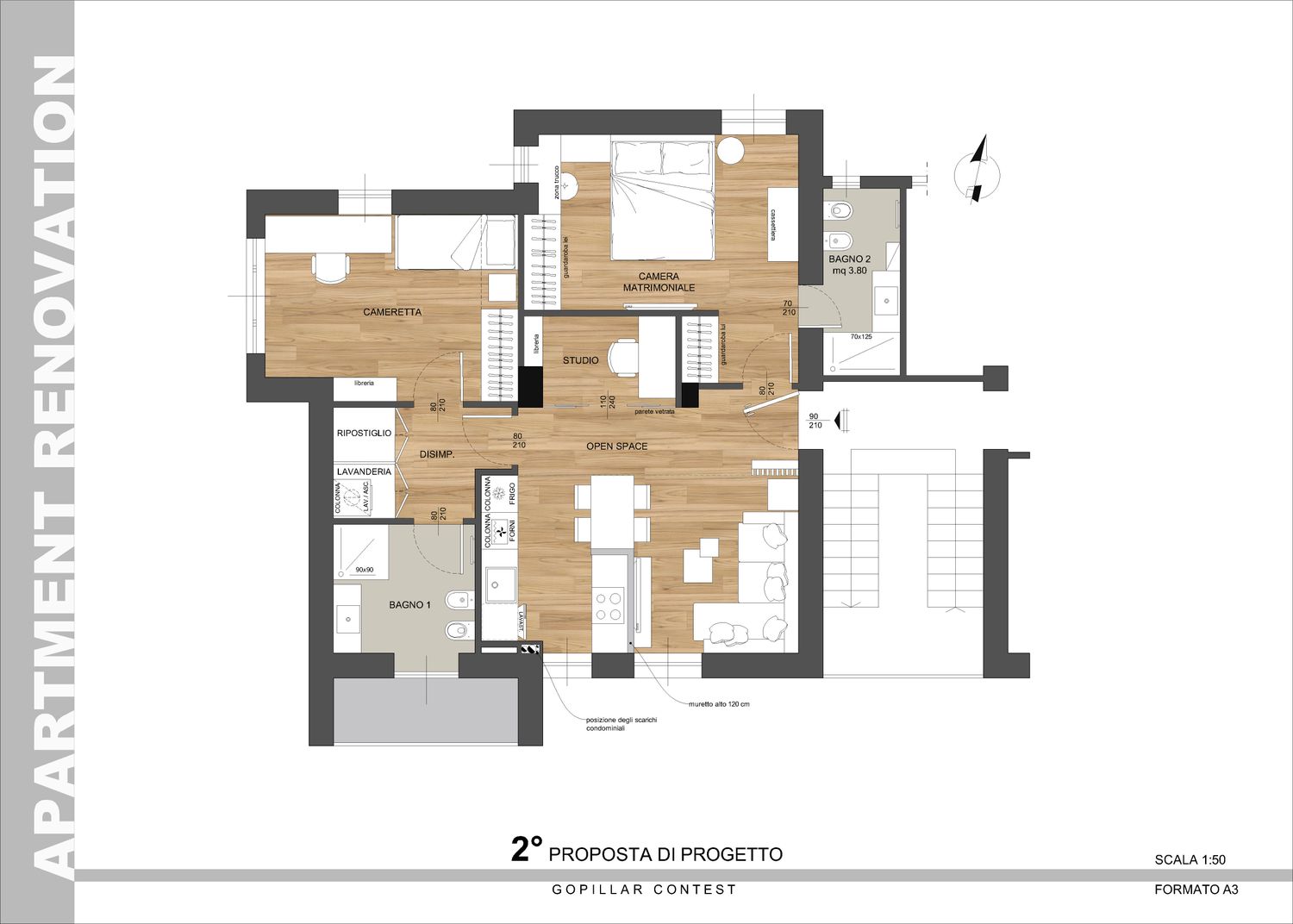 Il bagno, insieme a un antibagno attrezzato con lavanderia e cappottiera, viene collocato in prossimità dell’ingresso. Questa scelta consente di liberare la zona sud-ovest dell’appartamento, ottenendo un ampio open space che integra cucina, soggiorno, zona pranzo e balcone, valorizzando al massimo luce e continuità spaziale.