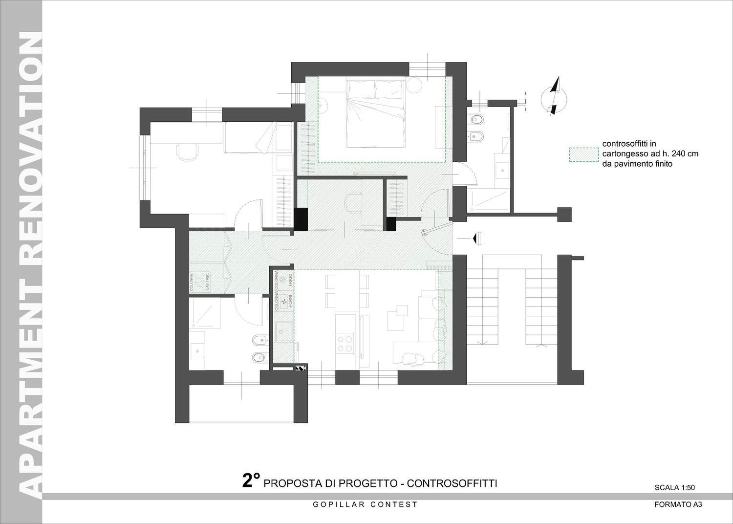 Le propongo quindi due soluzioni alternative rispetto a quella iniziale, entrambe nel rispetto del vincolo distributivo che prevede le stanze da letto a nord e la zona giorno a sud. Per la prima proposta ho inoltre allegato alcune viste renderizzate, utili a comunicare in modo più immediato il concept progettuale.