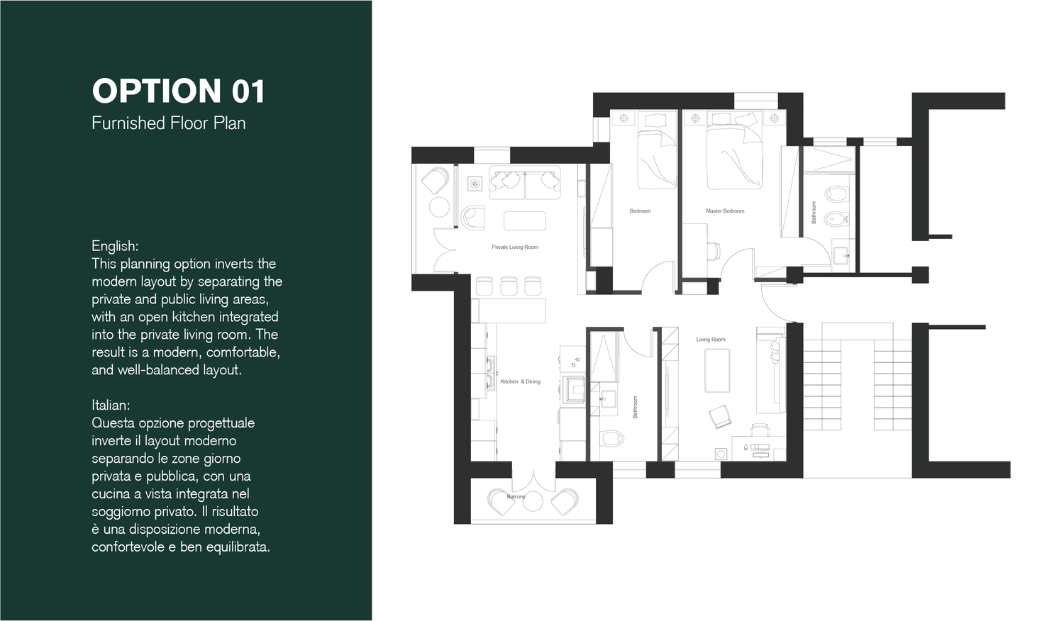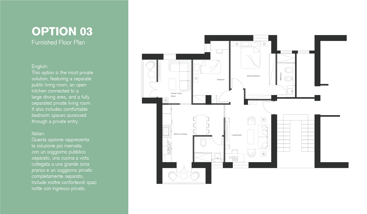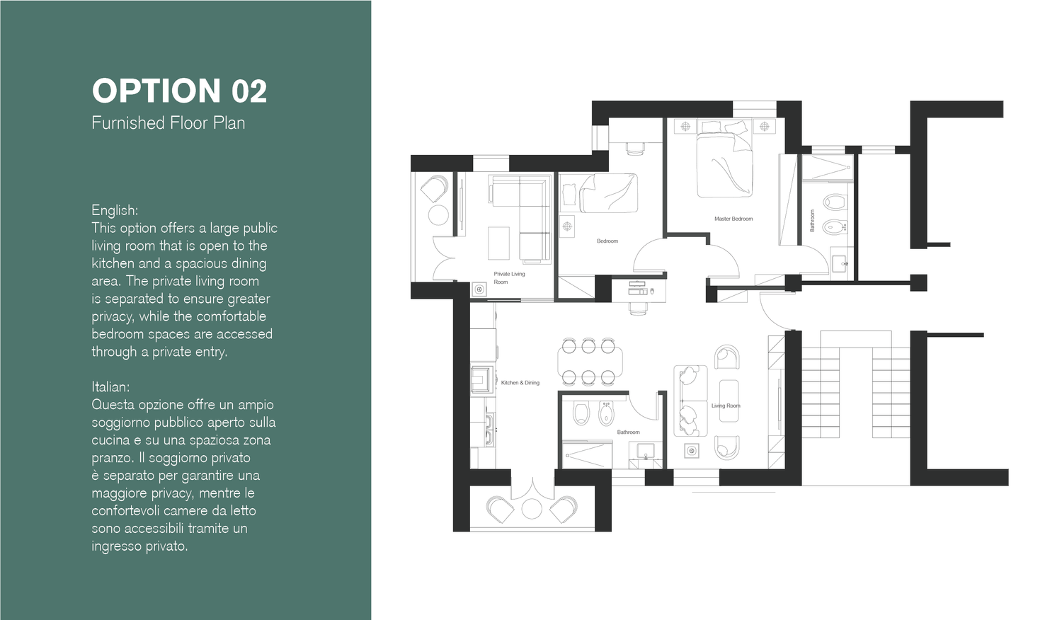 Inoltre, riceverà due differenti proposte di interior design, presentate attraverso rendering dettagliati.