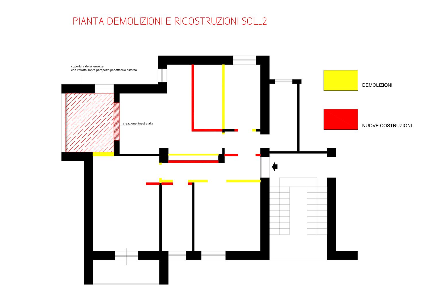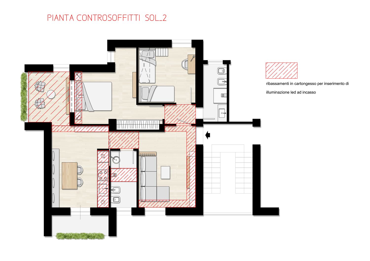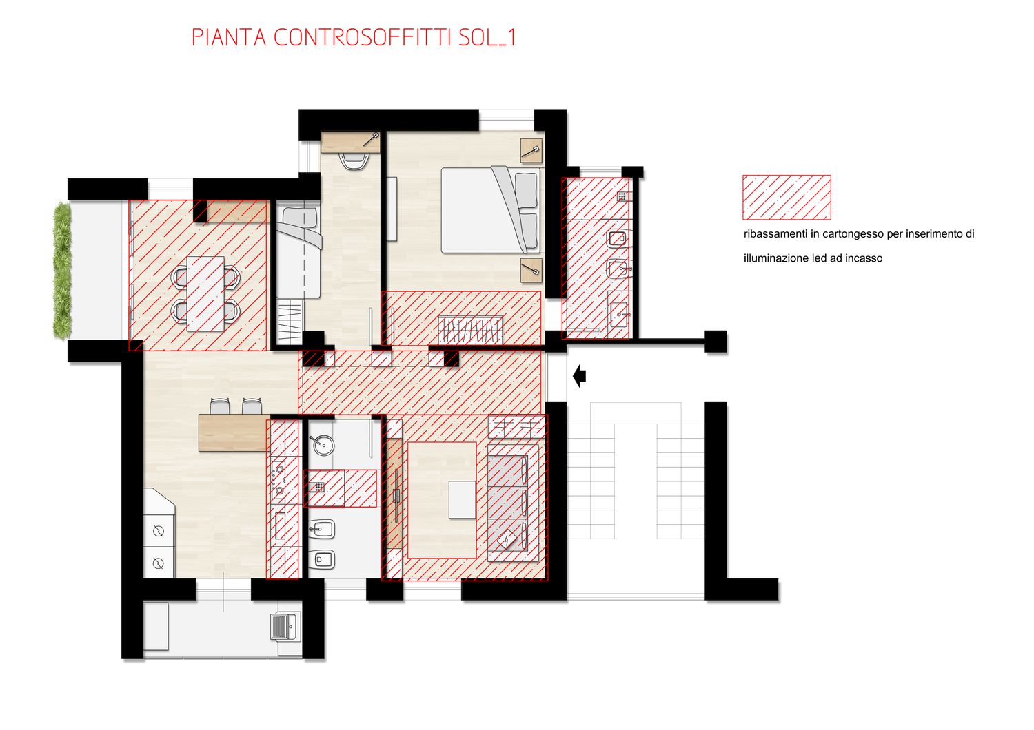 The project involves reorganizing the apartment's interior, moving the sleeping area to the north and the living area to the south, as per your request. In the two proposed solutions, upon entering, we find a comfortable living room with a sofa and TV cabinet, a bathroom with shower, and a kitchen with an island or snack bar. The balcony can be glass-enclosed to accommodate a washing machine. Adjacent to the kitchen is the dining area, created from the terrace. The work involved demolishing the masonry and enclosing it with sliding glass doors to access the balcony. In the second version, the terrace has been completely enclosed and houses a TV lounge area adjacent to the kitchen/dining area. The sleeping area, as shown in the two proposals, consists of a single bedroom, a double bedroom, and a second bathroom, also ensuite. Architecturally and design-wise, the suspended ceilings were designed to accommodate recessed lighting that enhances the space.