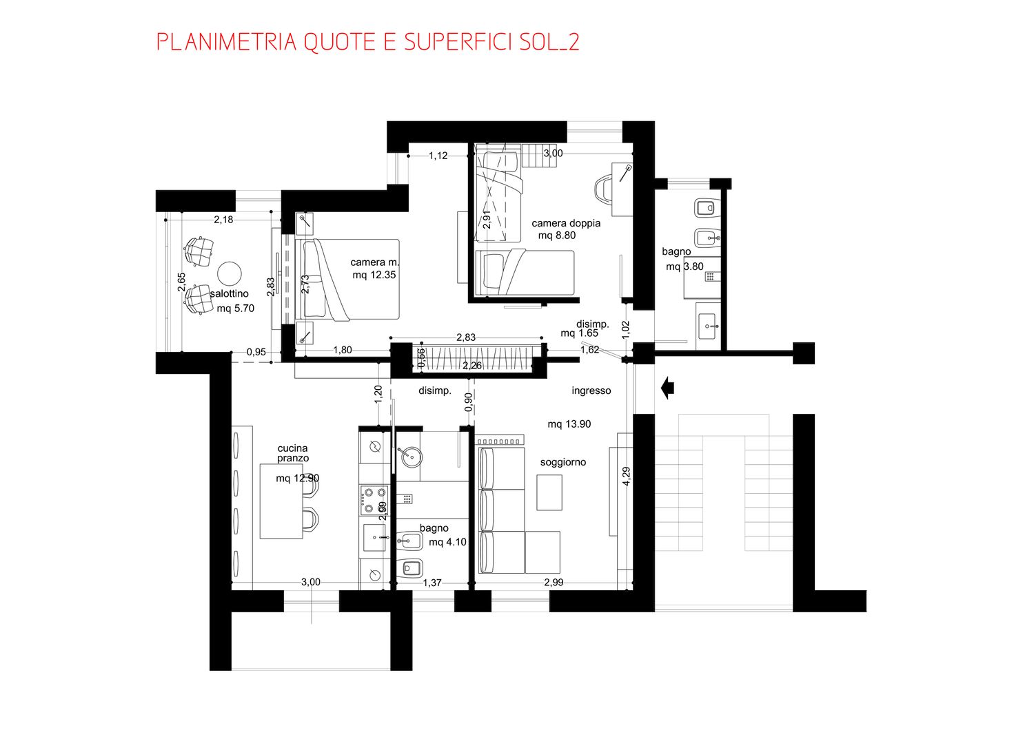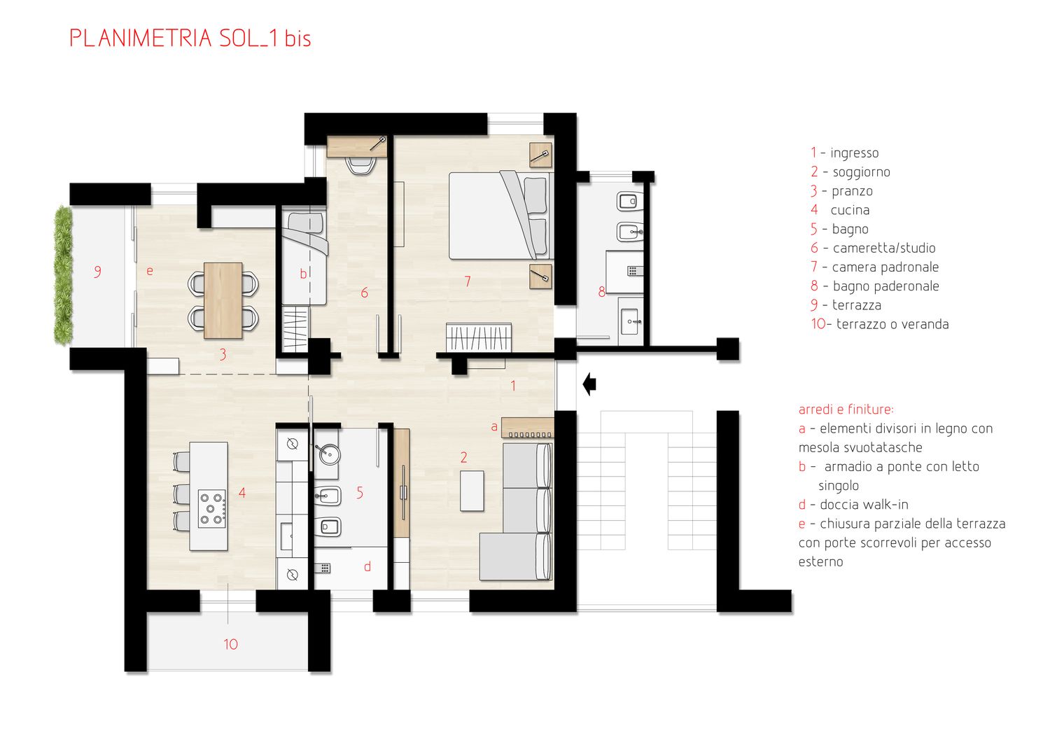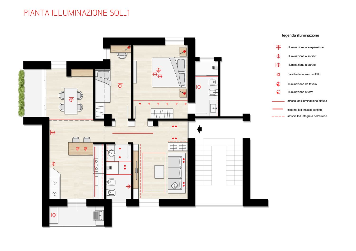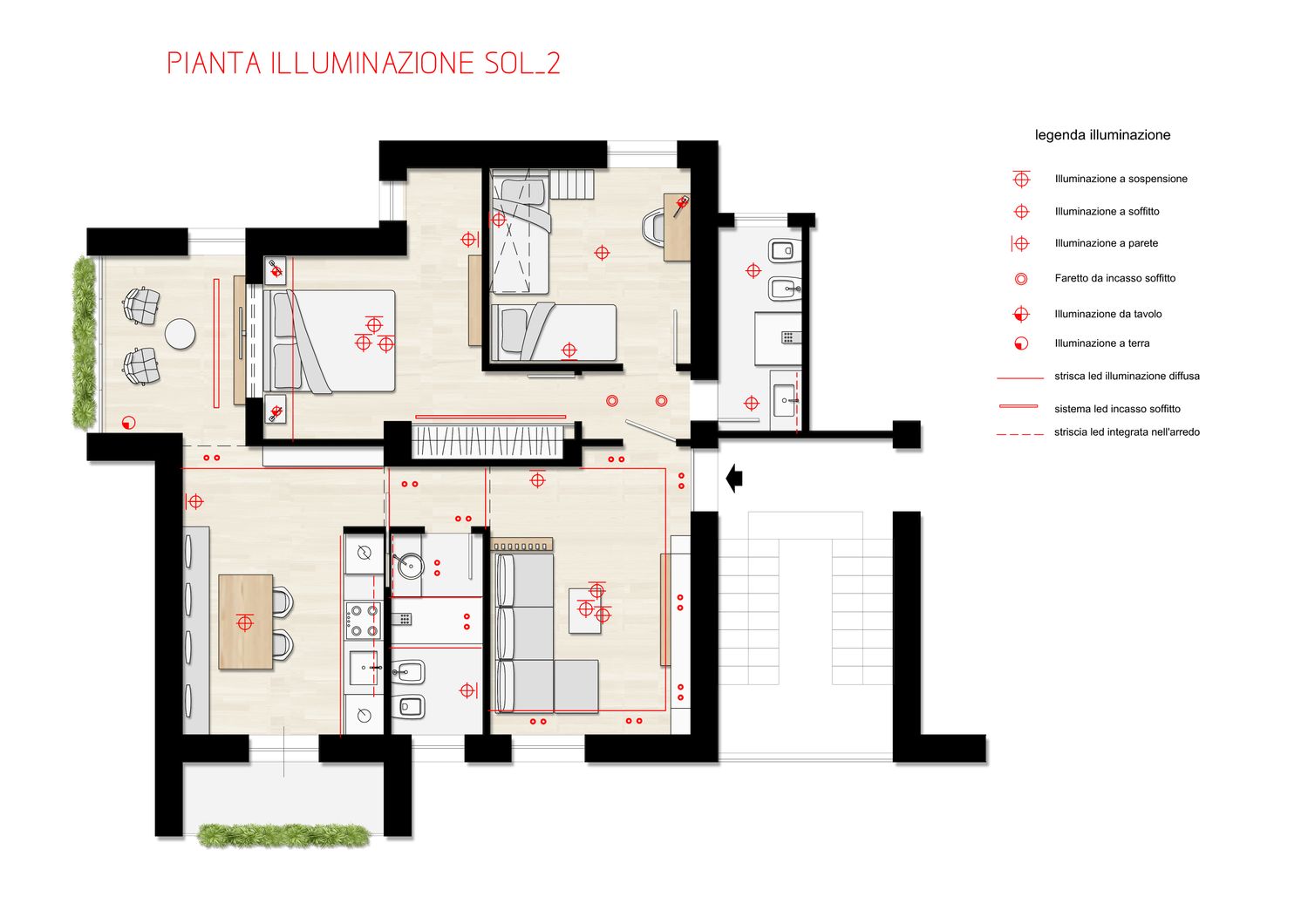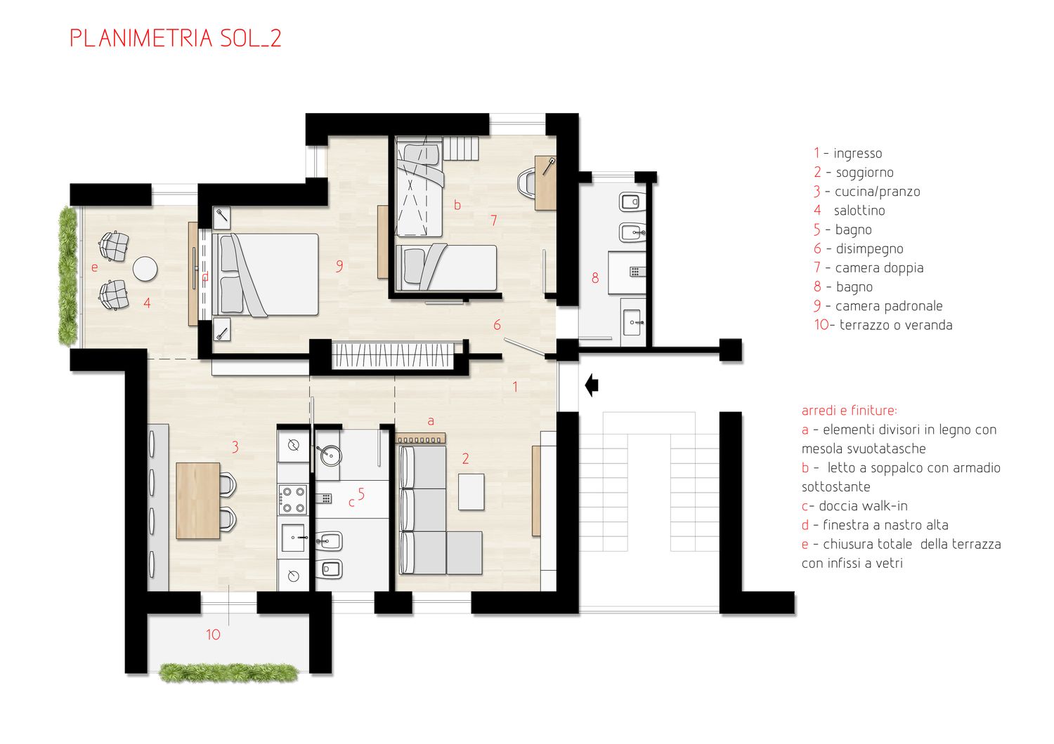 Il progetto prevede la ridistribuzione interna dell’appartamento portando la zona notte a nord e la zona giorno a sud, come da vostra richiesta. Nelle due soluzioni presentate troviamo entrando il comodo soggiorno con divano e mobile tv, il bagno con doccia, e la cucina con isola o penisola snack, qui il poggiolo può essere chiuso a vetri per ospitare la lavatrice. Adiacente alla cucina troviamo la zona pranzo ricavata nello spazio della terrazza. Qui l’intervento prevede la demolizione della muratura e la chiusura con vetrate scorrevoli per l’accesso al balcone. Nella seconda versione invece la terrazza è stata chiusa totalmente ed ospita un salottino tv a corredo della cucina/ pranzo. La zona notte come si vede nelle due proposte si compone di una cameretta, di una camera matrimoniale e di un secondo bagno anche privato. A livello architettonico e di design i controsoffitti sono stati pensati per accogliere luci ad incasso che valorizzino l’ambiente.