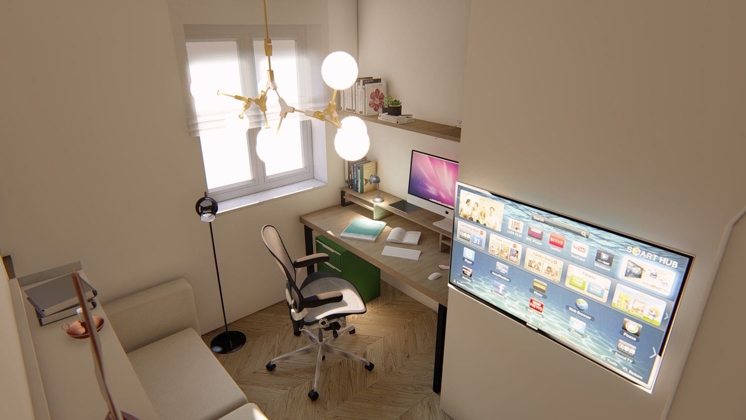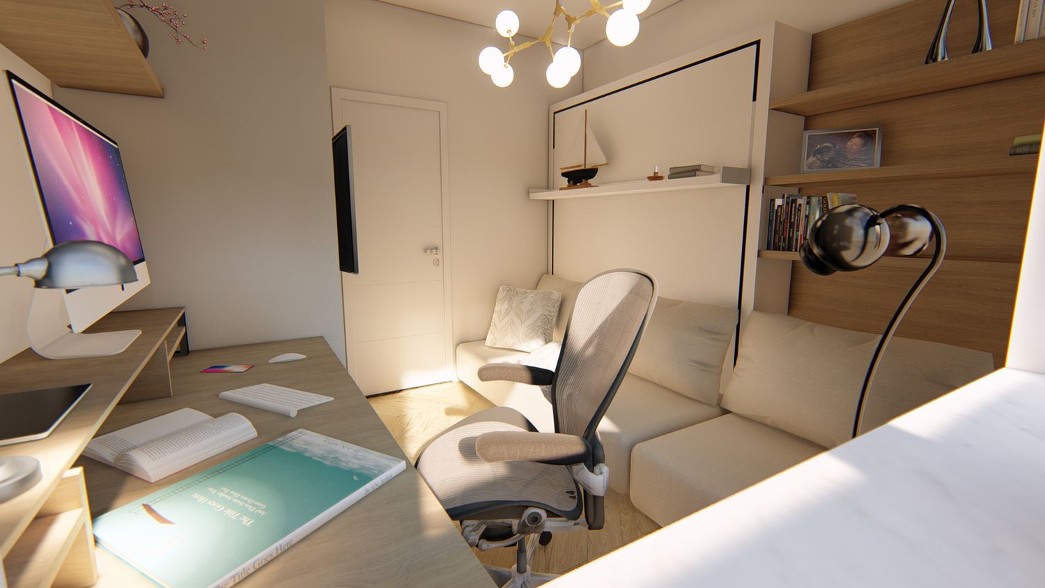 2. Creazione di un salottino/studio al posto della cameretta vicina all'entrata, con l'inserimento di un elemento di arredo trasformabile (cfr. https://www.clei.it/swing) per dare la possibilità di accogliere ospiti;