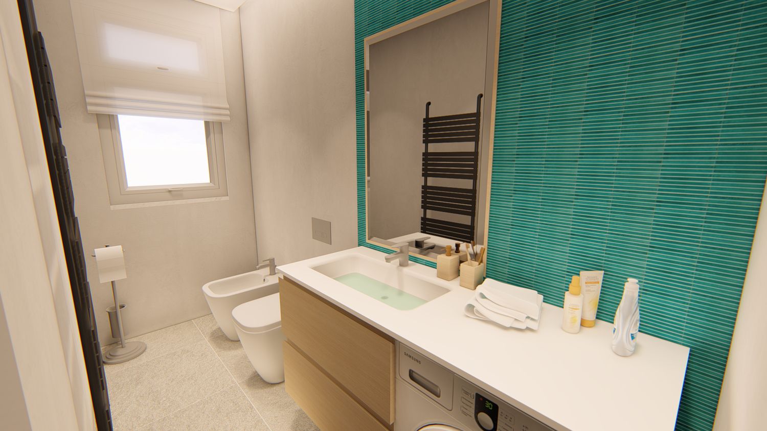 8. Rinnovo del locale lavanderia/bagno con l'inserimento di un lavabo ampio dotato di lavatrice sottopiano, e di coppia sanitari;