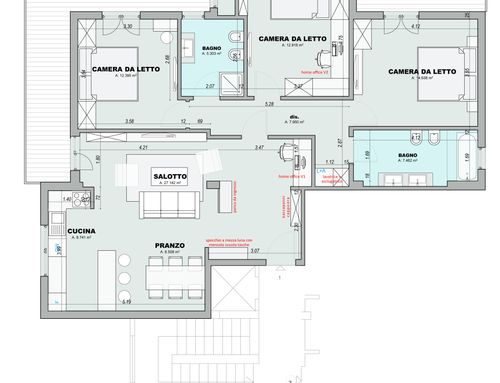 A sinistra dell'ingresso un salotto open space (abbattere la parete - o parte di essa - che divide salotto da cucina). La cucina si sviluppa sulla parete in fondo dove si trova la porta finestra e su una penisola attaccata al pilastro, mentre la parete tv si sviluppa sulla parete di 5 metri a partire dalla parte dove si trova la finestra. La parete TV si preferisce con mobile colonna chiusa, colonna a giorno, e mensole orizzontali su cui mettere tv attaccata al muro su pannello con led.