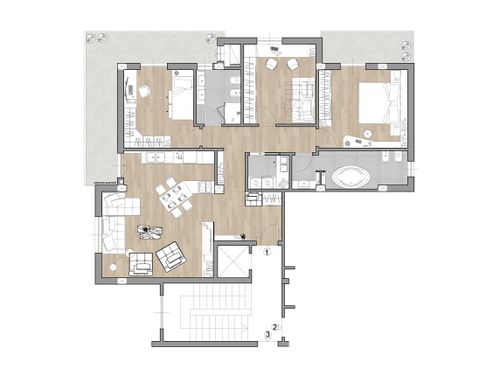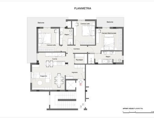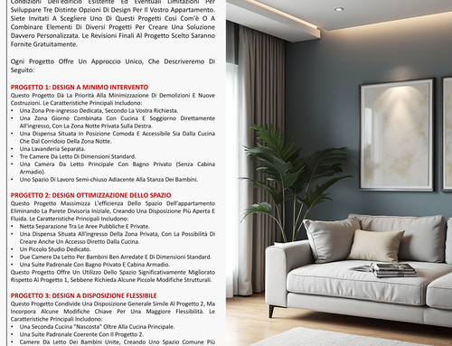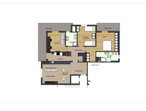 Per quanto riguarda il pavimento potremmo avere sia un pavimento unico per tutto l'appartamento, che due finiture diverse tra la zona notte (come parquet/effetto legno/ecc..) e la zona giorno (effetto legno/gres/ecc..)