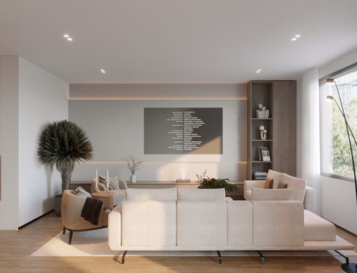 To the left of the entrance, an open-plan living area is designed, with the wall separating the living room from the kitchen to be either partially or fully removed. The kitchen is to be positioned along the far wall, where a French door provides access to the exterior. A peninsula, attached to a supporting column, is intended to create a fluid connection between the kitchen and living space. The TV wall is planned for the 5-meter wall, beginning from the area near the window. For the TV wall, the preferred design is a combination of closed-column storage, open shelving, and horizontal shelves, with a wall-mounted TV positioned on a panel featuring integrated LED lighting.