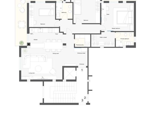 We are a family of two adults and two boys (the first is 4 years old, the second will arrive in two months). Our home should also include a space dedicated to work, as the mother is a freelancer who often works from home, and the father works from home on the computer, although much more occasionally.