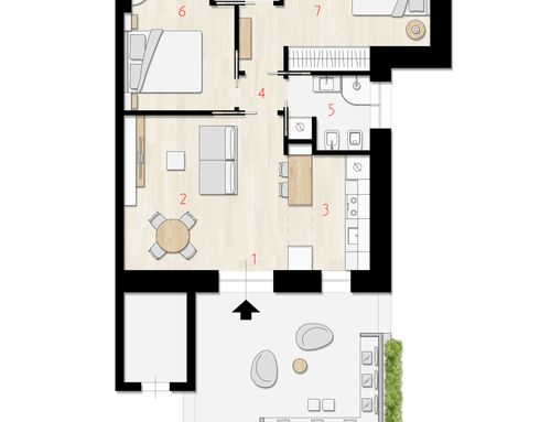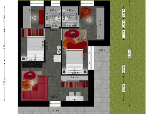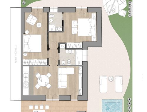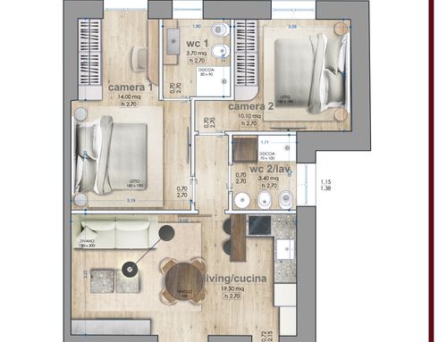 En este pequeño apartamento, me gustaría redistribuir completamente los espacios creando un baño principal (sin bañera) + 2 habitaciones dobles, una con baño en suite. La cocina y el comedor/sala de estar se fusionarán en un solo espacio. El verdadero desafío es crear la habitación con baño en suite de al menos 14 metros cuadrados (excluyendo el baño), que luego será utilizable por invitados externos. Esta habitación también debería tener acceso externo a uno de los dos patios al transformar una de las ventanas actuales en una puerta francesa.