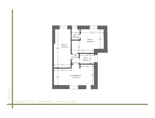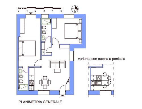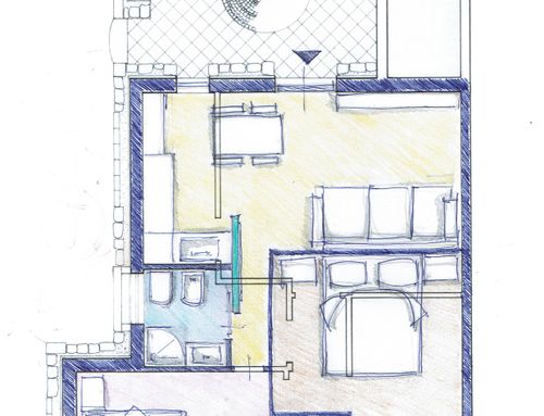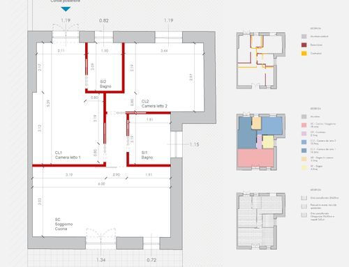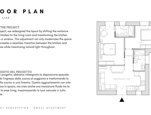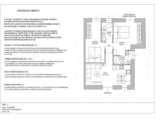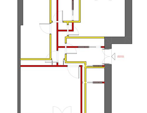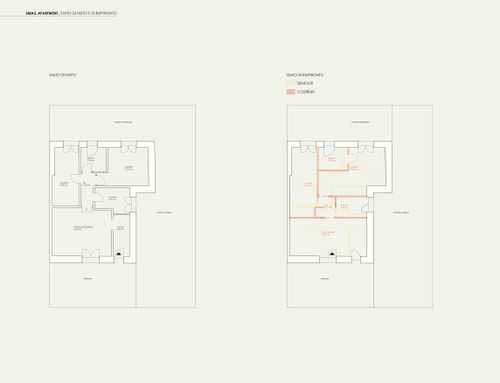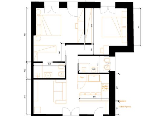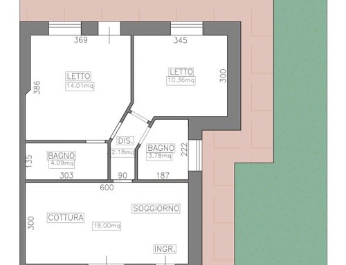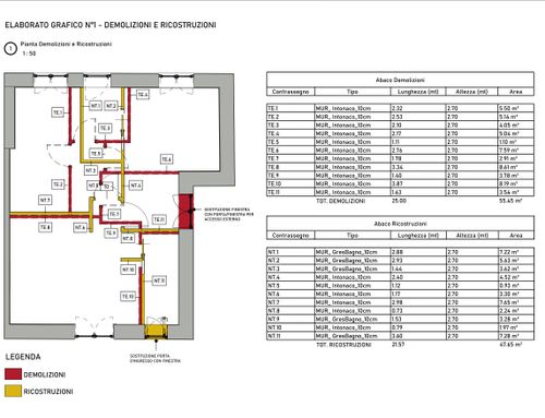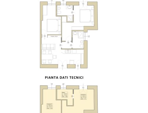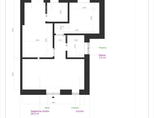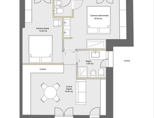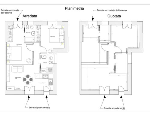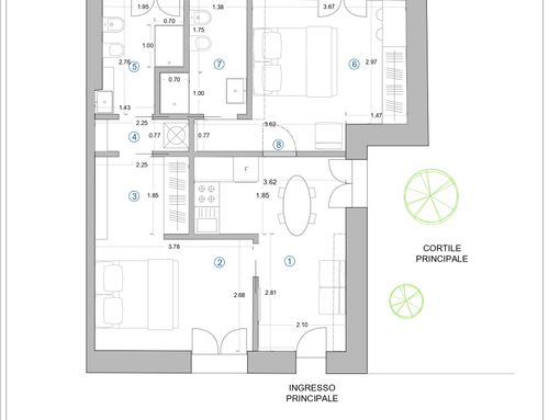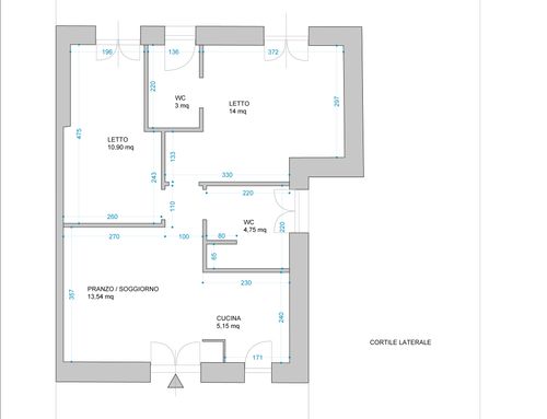 In questo piccolo appartamento vorrei redistribuire completamente gli spazi ricavando un bagno principale (no vasca da bagno) + 2 stanze da letto matrimoniali di cui una col bagno in camera, la cucina e il pranzo soggiorno andranno fusi in un unico ambiente, la vera sfida è quella di ricavare la camera da letto col bagno in camera di almeno 14mq calpestabili (bagno escluso) per essere in seguito fruibile da ospiti esterni, questa camera dovrà avere anche l'accesso dall'esterno a uno dei due cortili trasformando una delle attuali finestre in porta finestra.