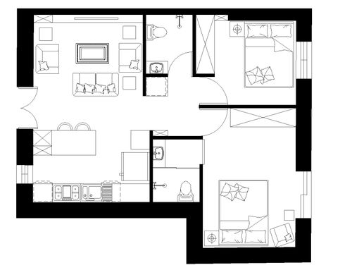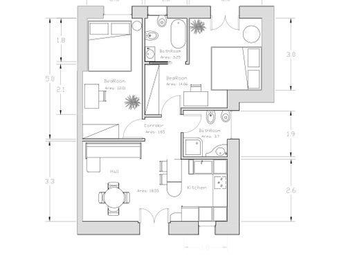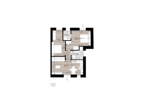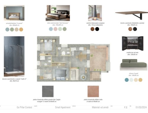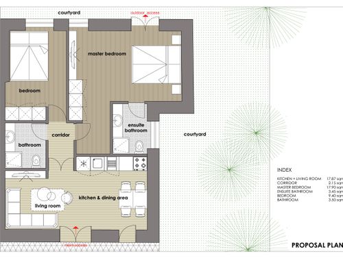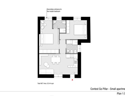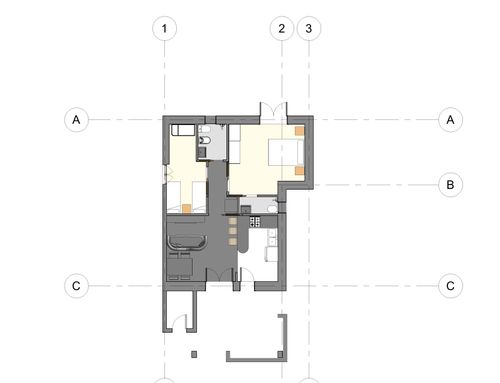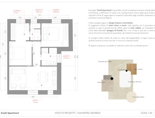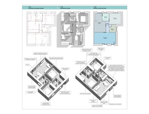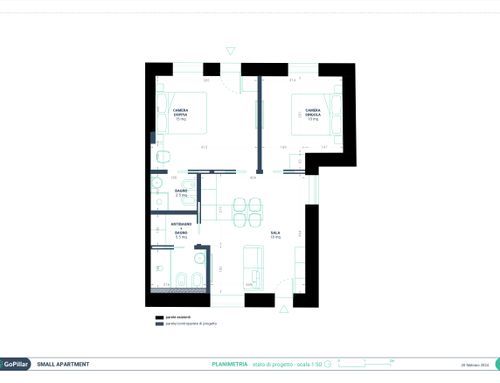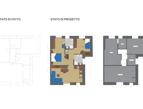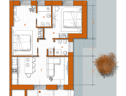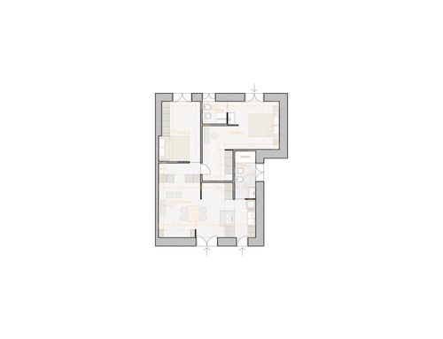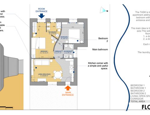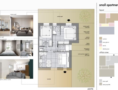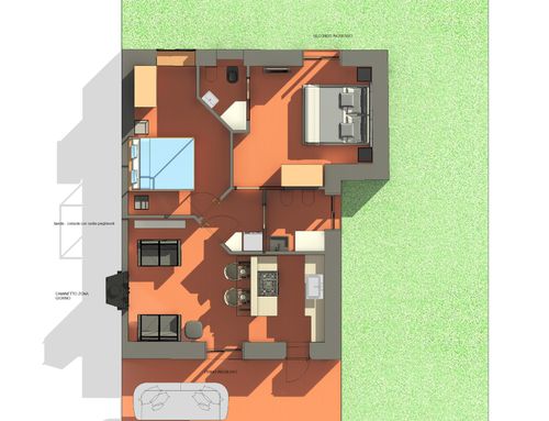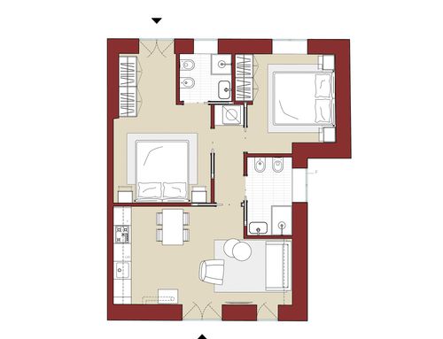 In questo piccolo appartamento vorrei redistribuire completamente gli spazi ricavando un bagno principale (no vasca da bagno) + 2 stanze da letto matrimoniali di cui una col bagno in camera, la cucina e il pranzo soggiorno andranno fusi in un unico ambiente, la vera sfida è quella di ricavare la camera da letto col bagno in camera di almeno 14mq calpestabili (bagno escluso) per essere in seguito fruibile da ospiti esterni, questa camera dovrà avere anche l'accesso dall'esterno a uno dei due cortili trasformando una delle attuali finestre in porta finestra.