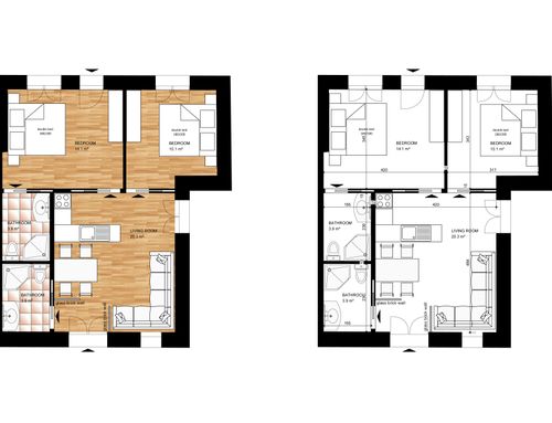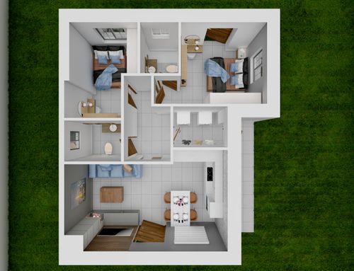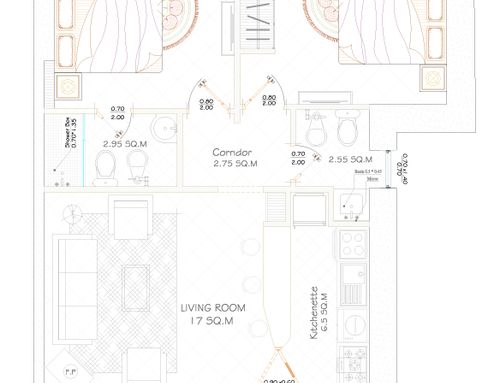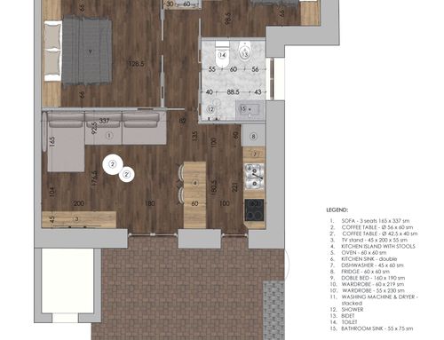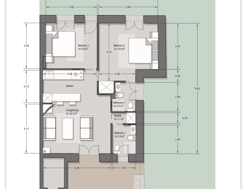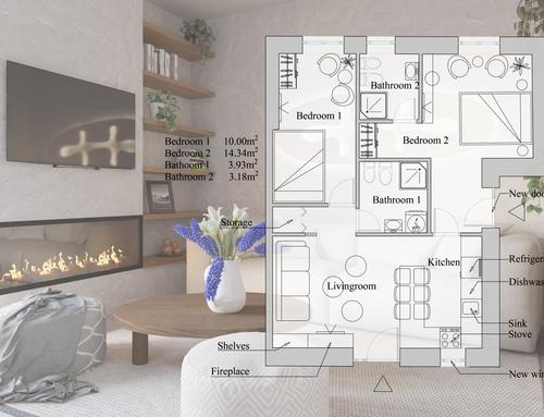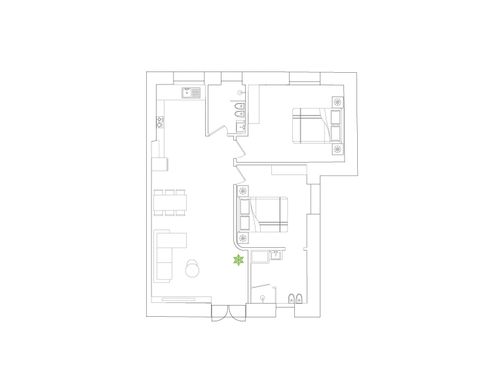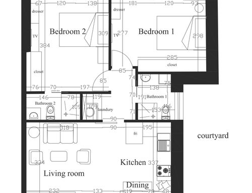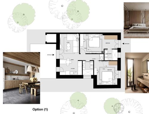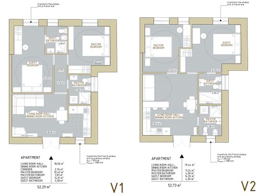 In this small apartment, I would like to completely redesign the spaces by creating a main bathroom (no bathtub) + 2 double bedrooms, one with an ensuite bathroom. The kitchen and dining/living room will be merged into a single space. The real challenge is to create the bedroom with an ensuite bathroom of at least 14 square meters (excluding the bathroom), which will later be usable by external guests. This bedroom should also have external access to one of the two courtyards by transforming one of the current windows into a French door.