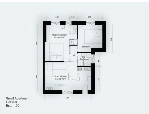 All rooms should have windows. In the main bathroom or in the possible hallway, I would also like to create (if possible) a space for the washer and dryer (stacked).