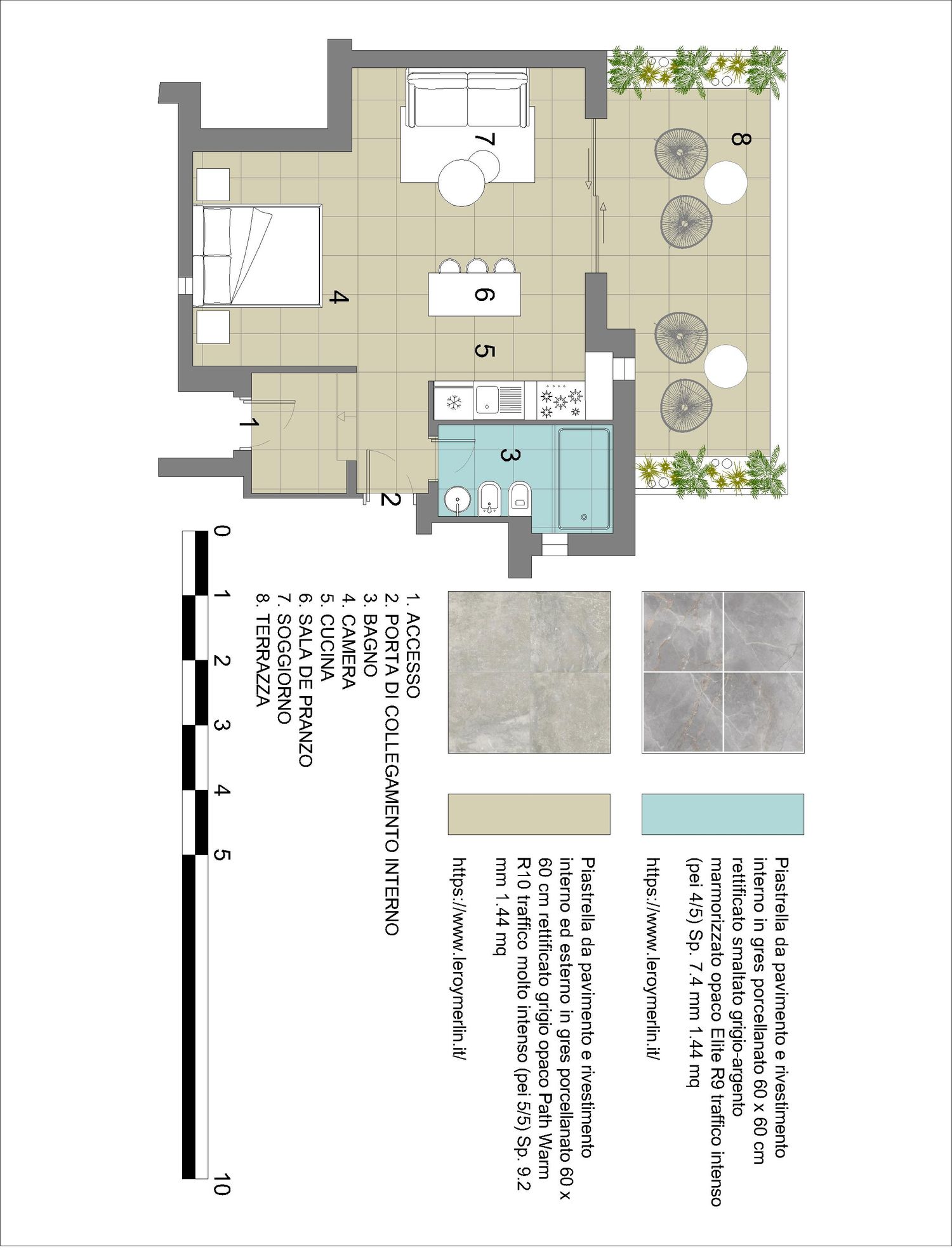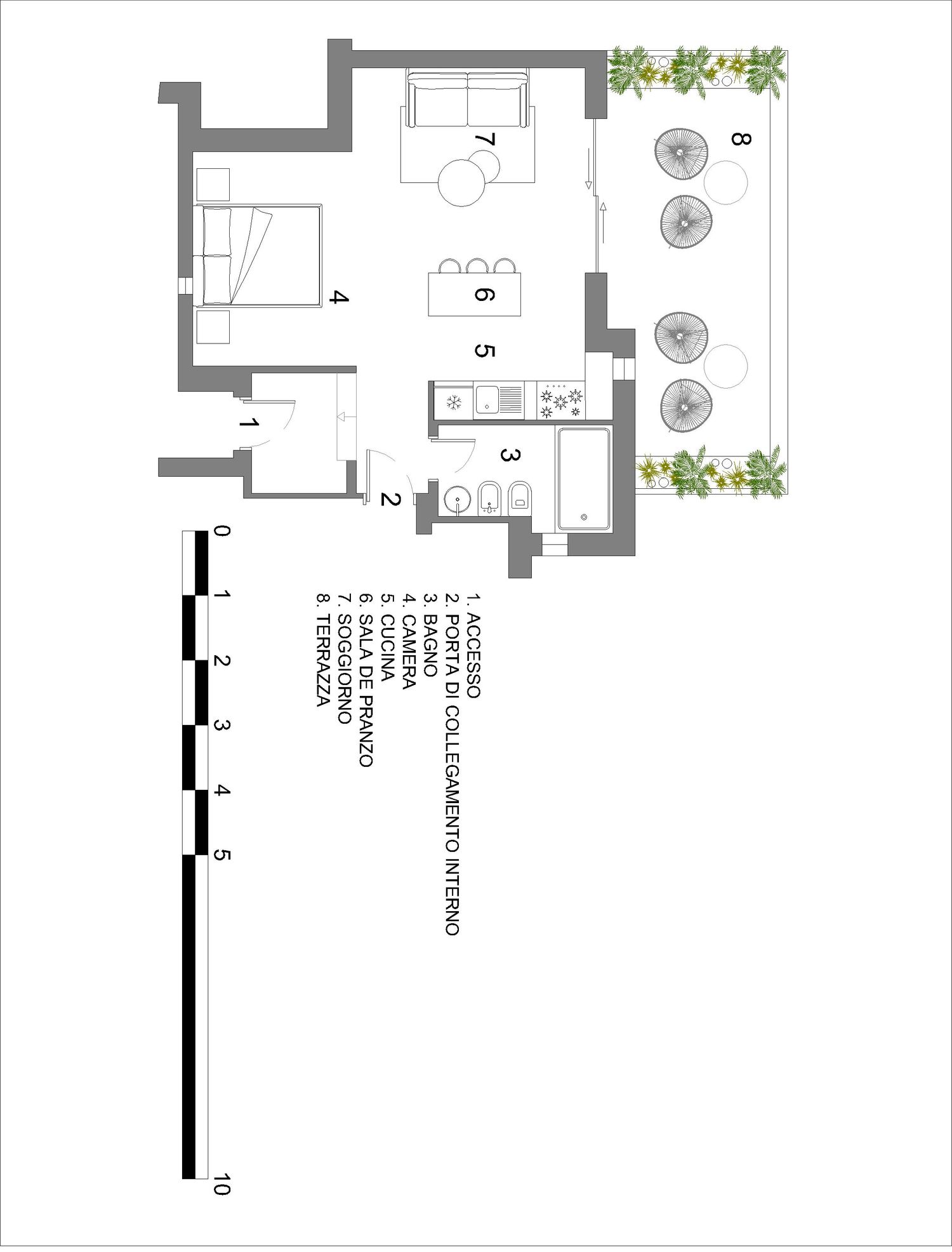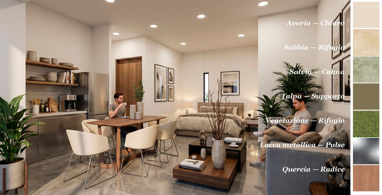 Proponiamo la ristrutturazione di un piccolo appartamento di circa 50 metri quadrati in riva al mare. Proponiamo una porta di collegamento interna per consentire il futuro accesso all'appartamento adiacente, mantenendo l'indipendenza funzionale di ciascuna unità. Proponiamo uno stile che integra armoniosamente le caratteristiche e i colori del complesso residenziale, costruito interamente in pietra. Proponiamo un'unica porta/finestra che si apre sul terrazzo, in sostituzione delle due esistenti.