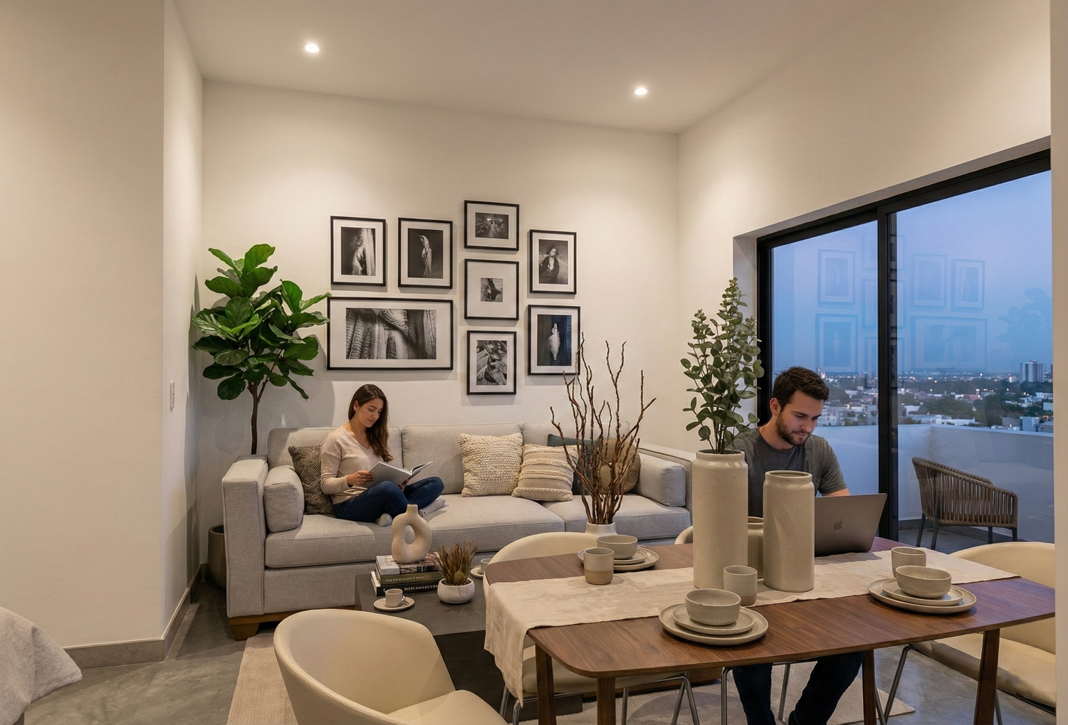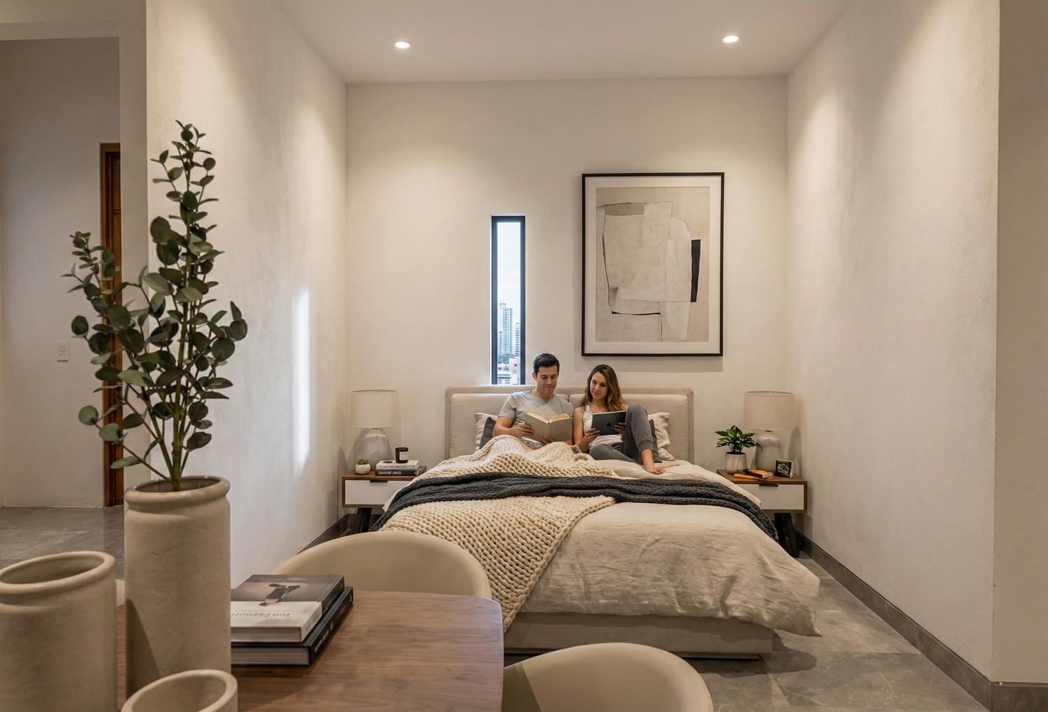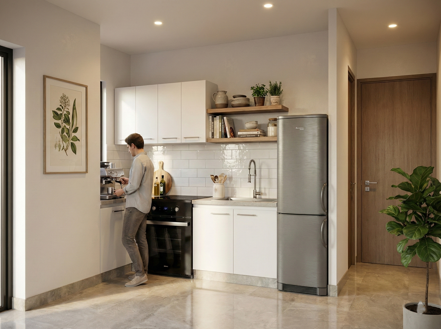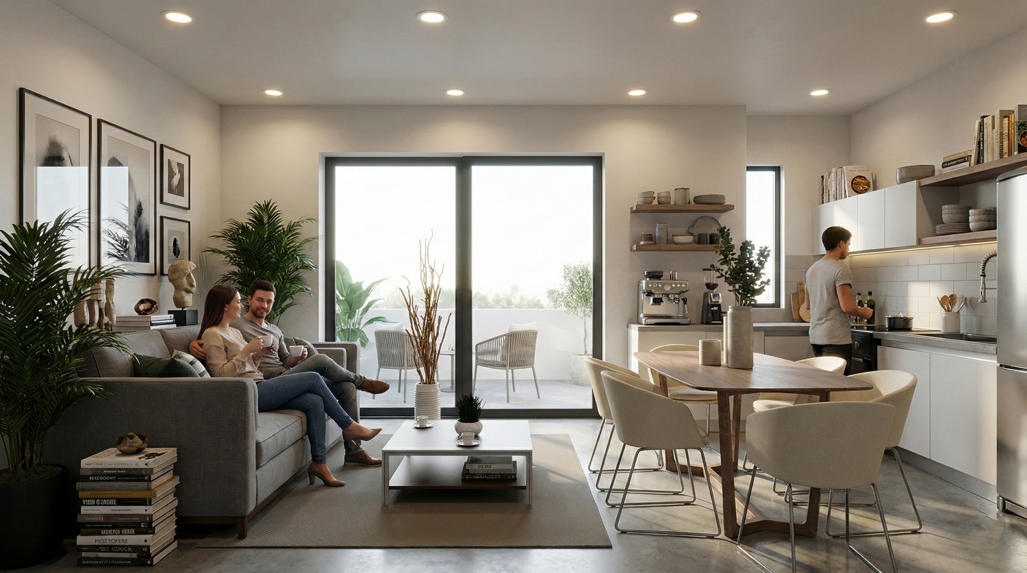 This proposal outlines the renovation of a small, approximately 50-square-meter apartment by the sea. It proposes an internal connecting door to allow future access to the adjacent apartment while maintaining the functional independence of each. The proposed style harmoniously integrates the characteristics and colors of the villa complex, which is constructed entirely of stone. A single door/window leading to the terrace is proposed, replacing the two existing ones.