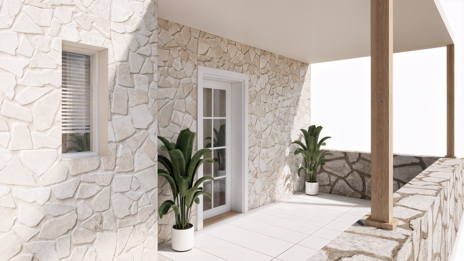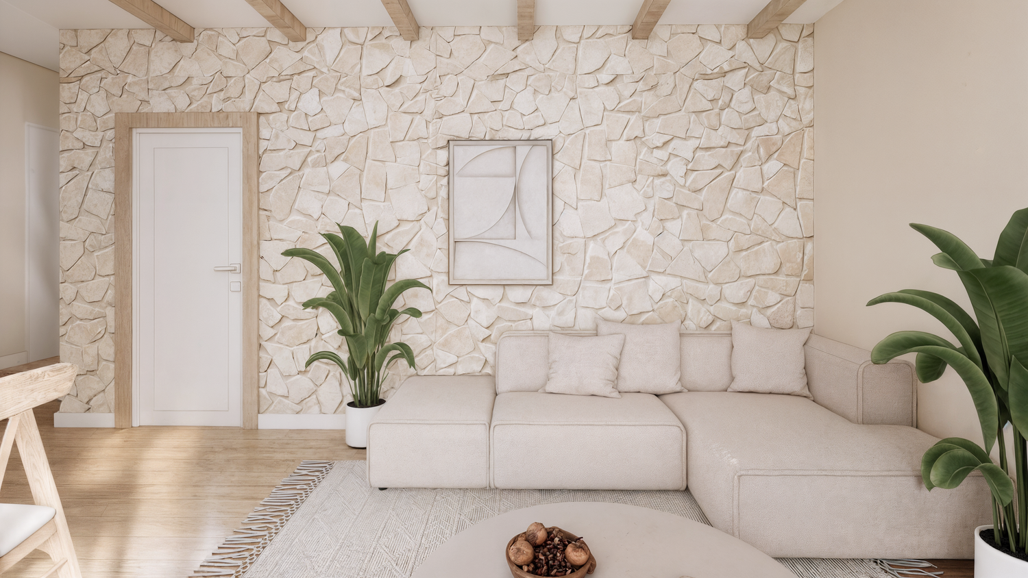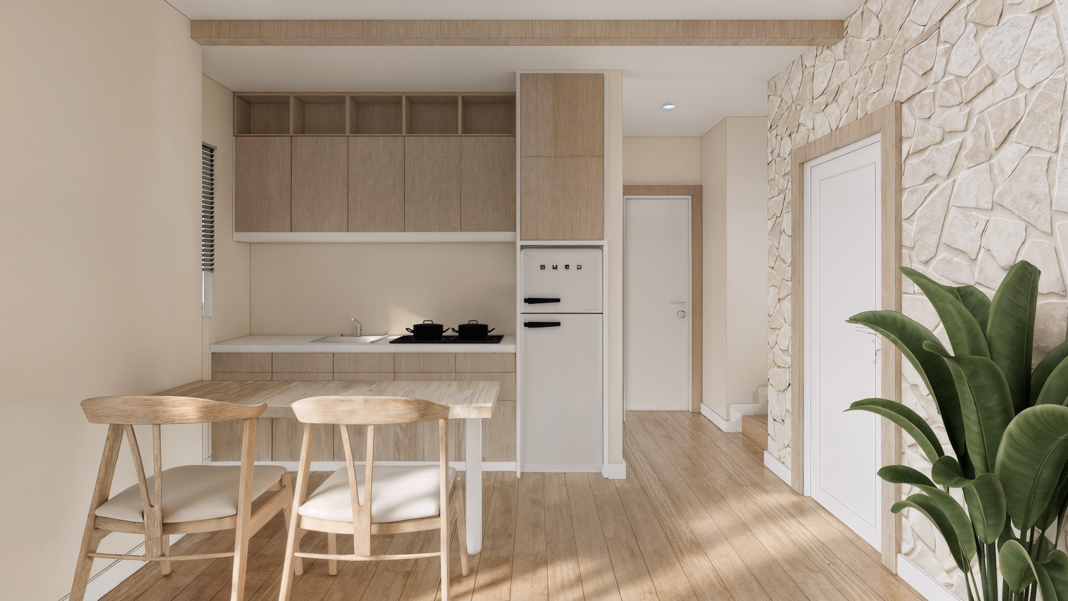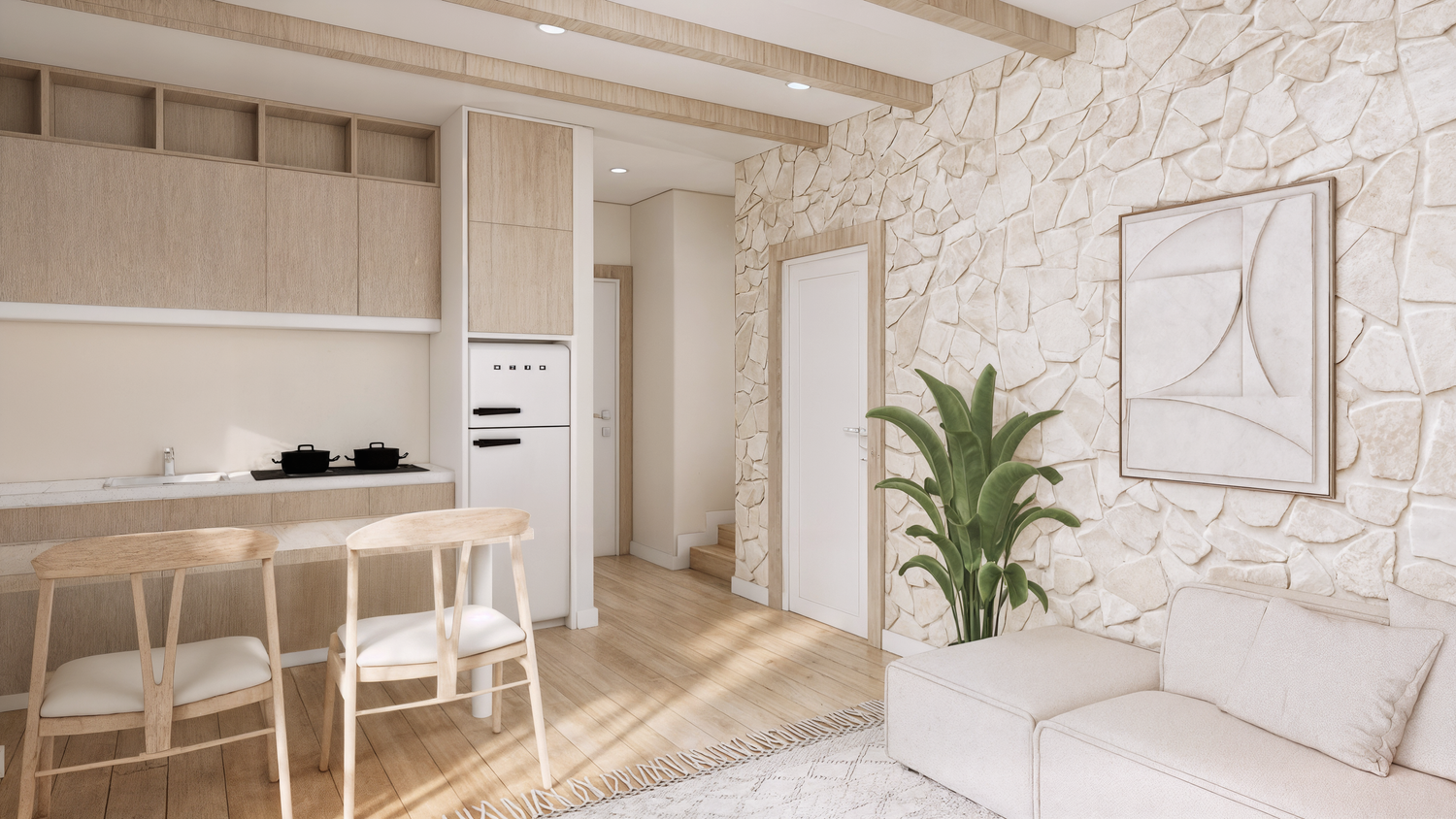 Design mediterraneo, un design luminoso con una combinazione di bianco, crema, legno e texture in pietra. Su sua richiesta, ho reso la stanza più spaziosa demolendo un piccolo muro nella zona cucina e ricostruendo la cucina, completa di una piccola zona pranzo. Può anche notare che la camera da letto ha una porta normale, mentre in precedenza aveva una grande porta scorrevole.