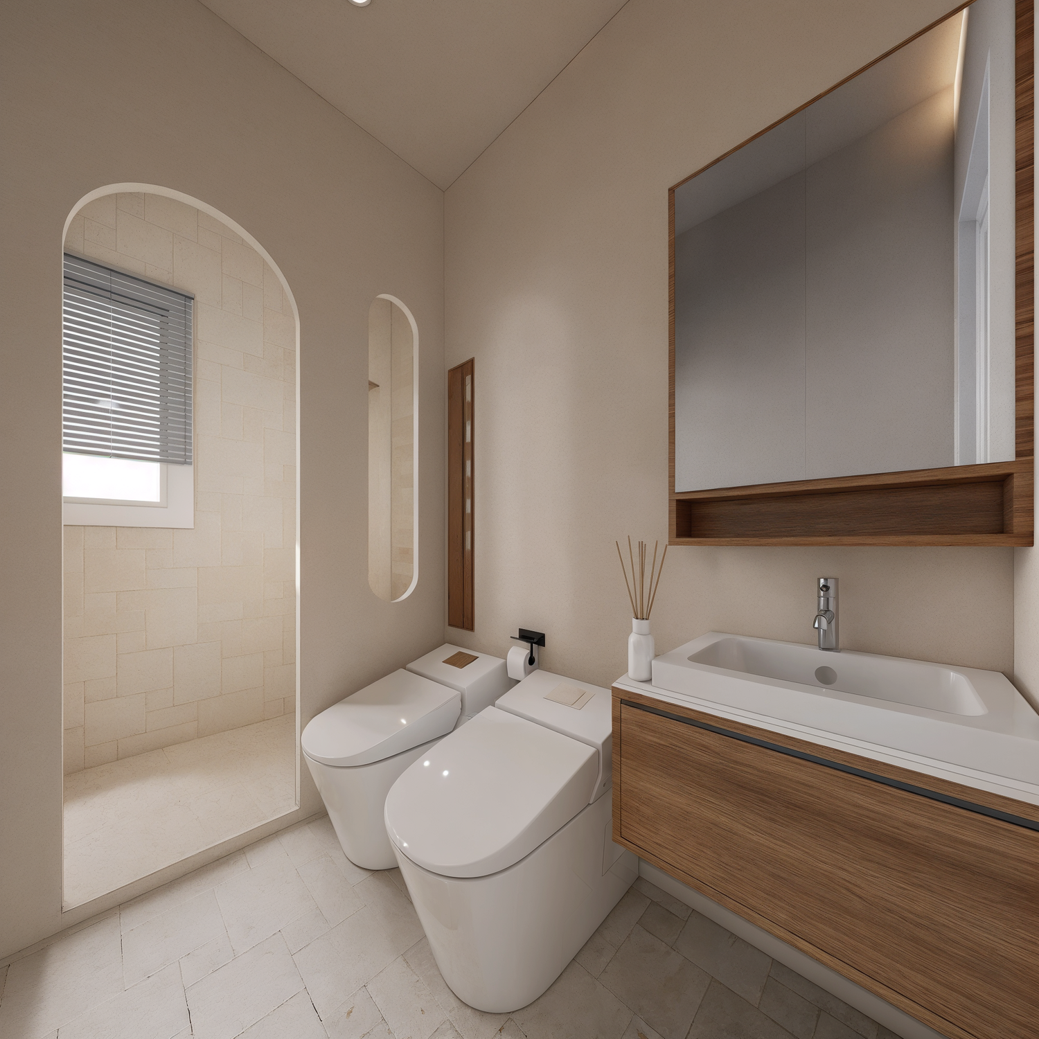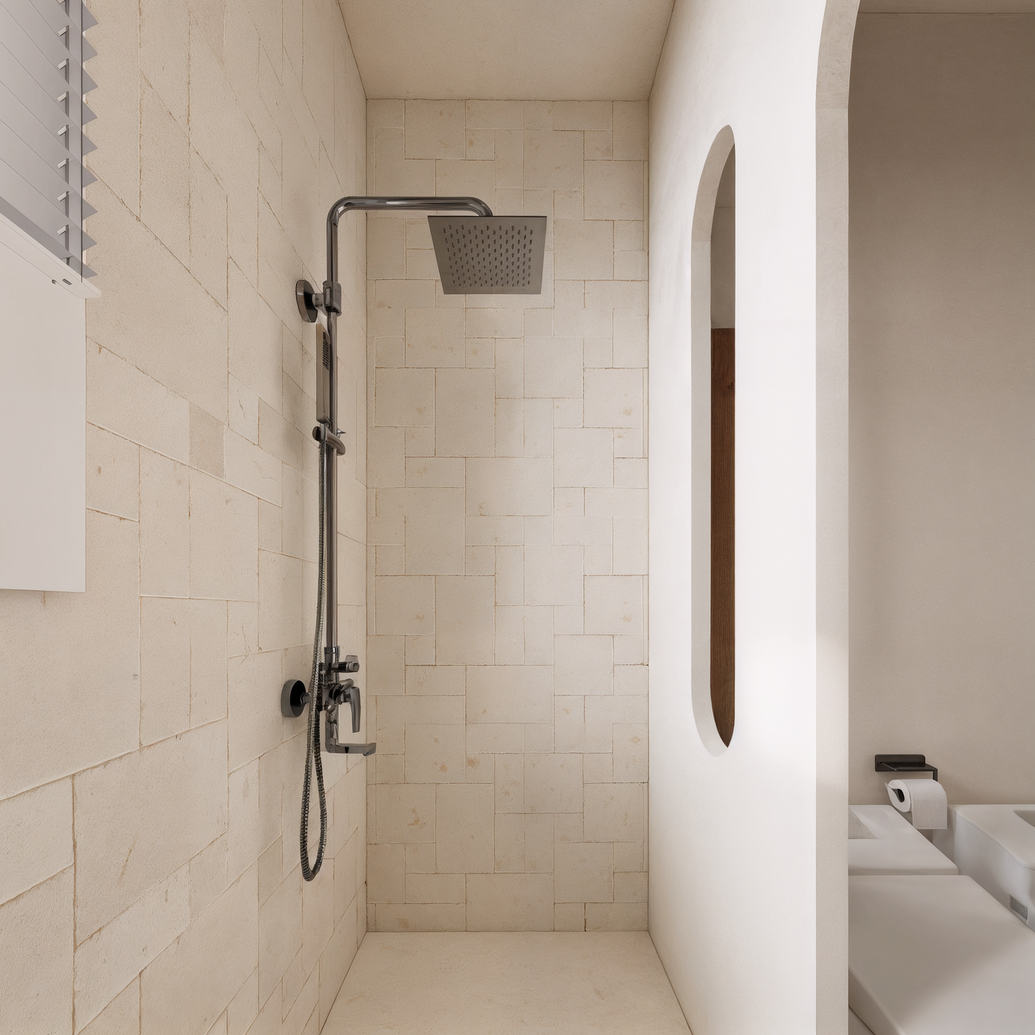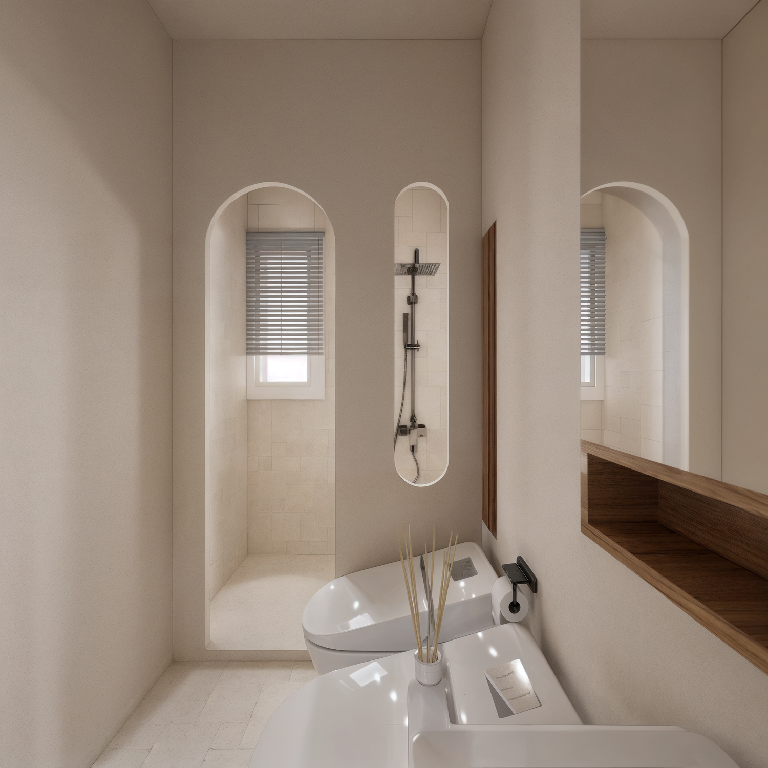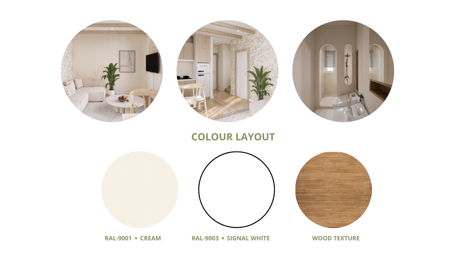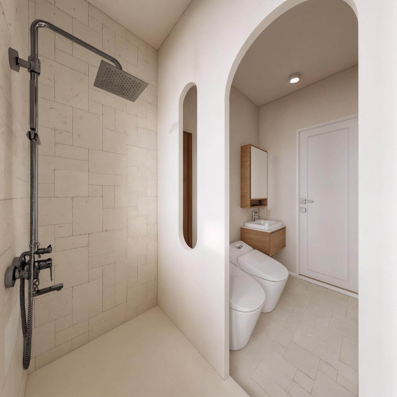 Design mediterraneo, un design luminoso con una combinazione di bianco, crema, legno e texture in pietra. Su sua richiesta, ho reso la stanza più spaziosa demolendo un piccolo muro nella zona cucina e ricostruendo la cucina, completa di una piccola zona pranzo. Può anche notare che la camera da letto ha una porta normale, mentre in precedenza aveva una grande porta scorrevole.