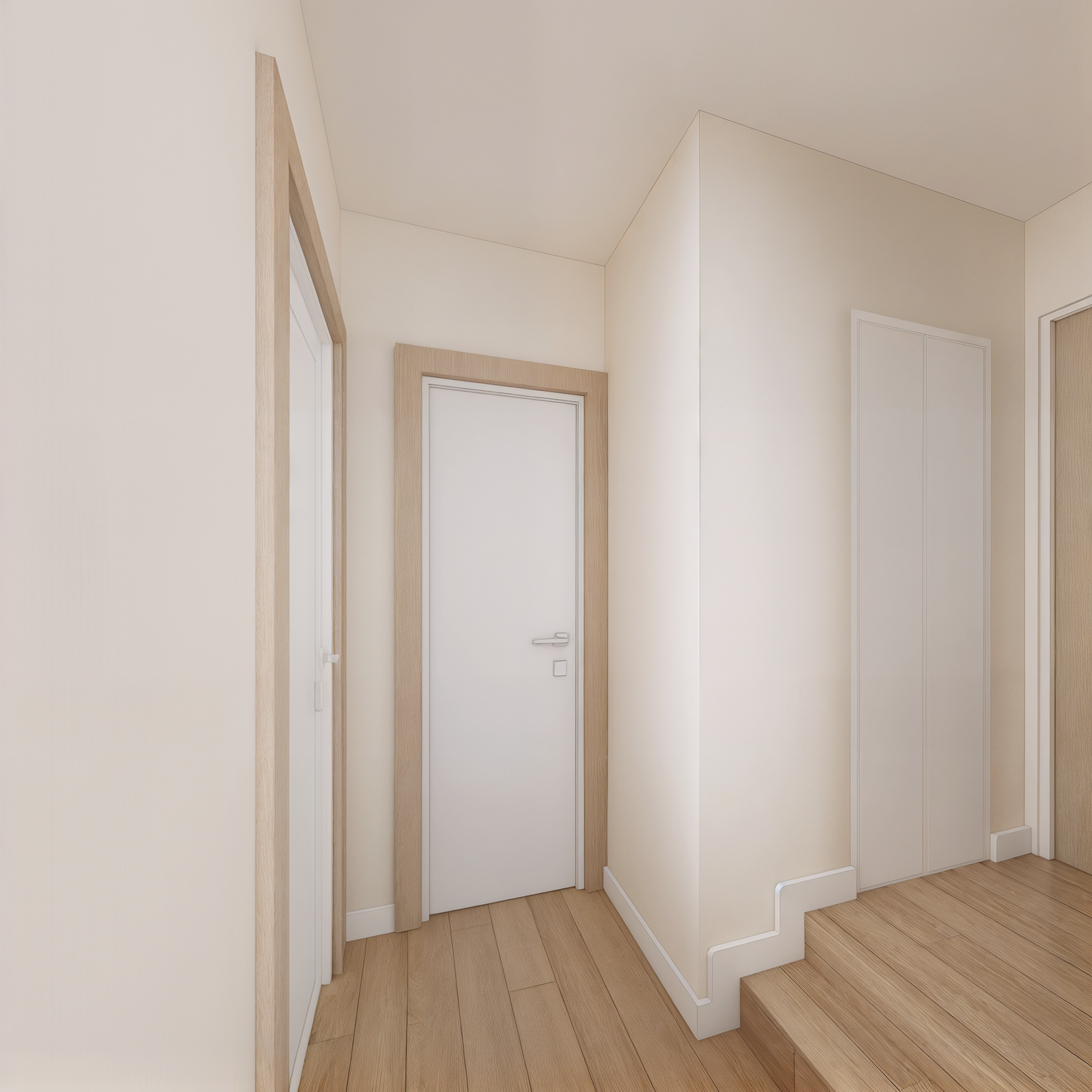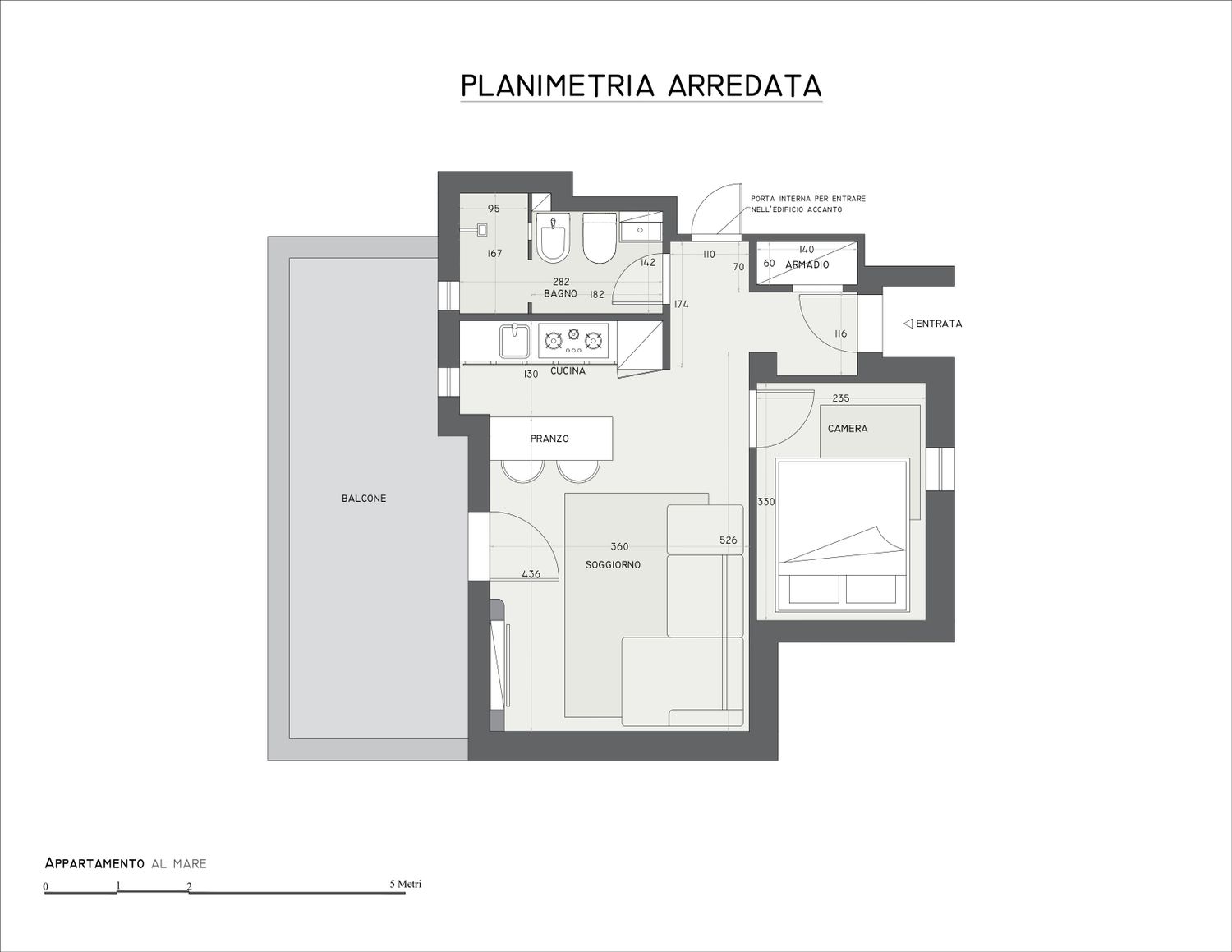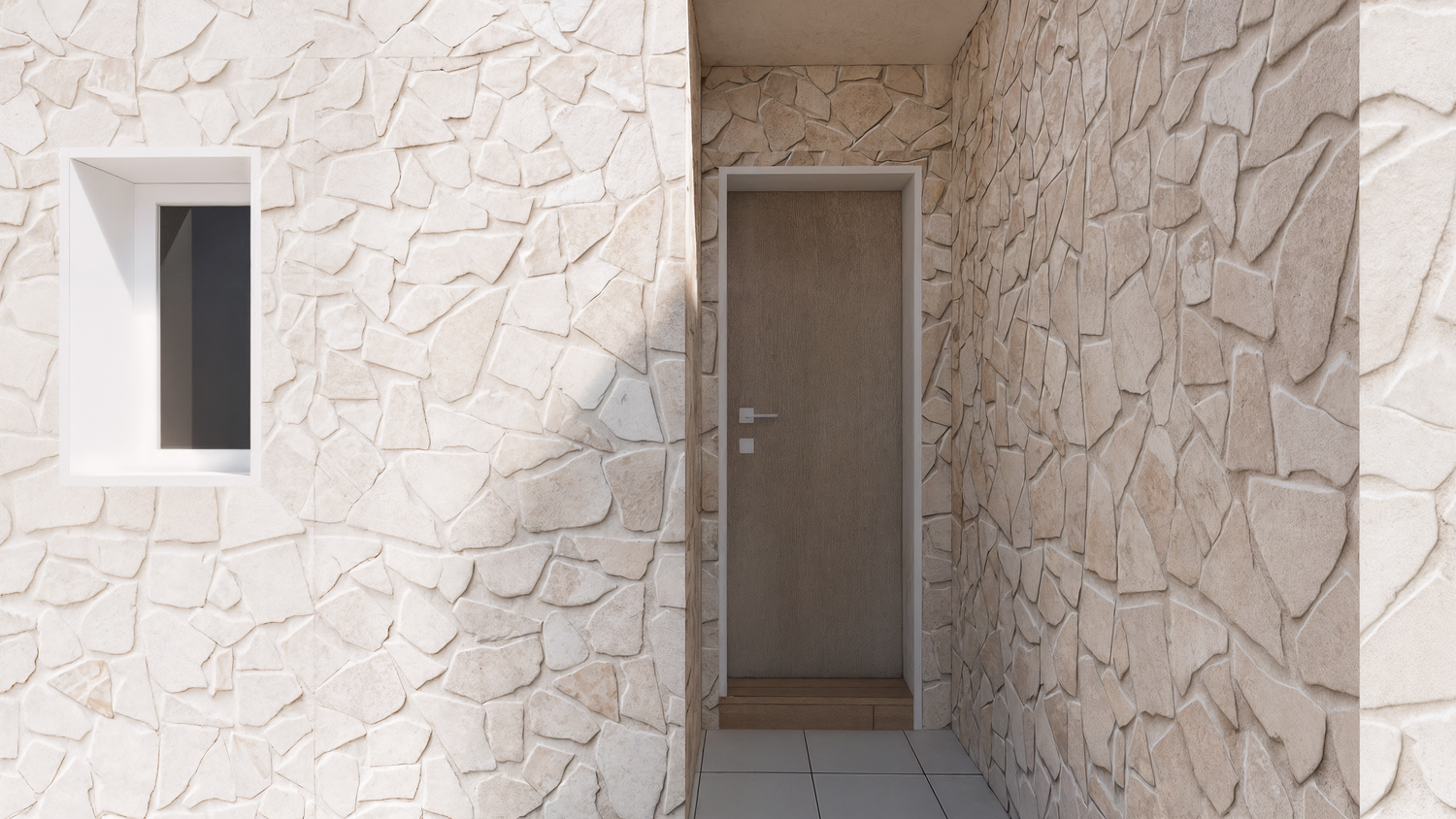 Ho creato una porta interna che conduce all'edificio laterale, come può vedere nella planimetria e nel rendering. Ho anche installato una porta a vetri che conduce al balcone, seguendo le sue istruzioni.