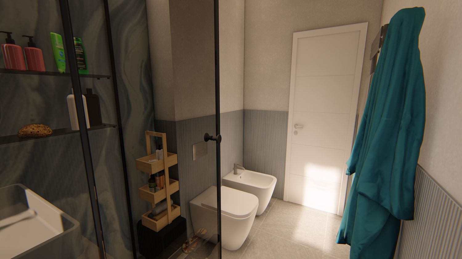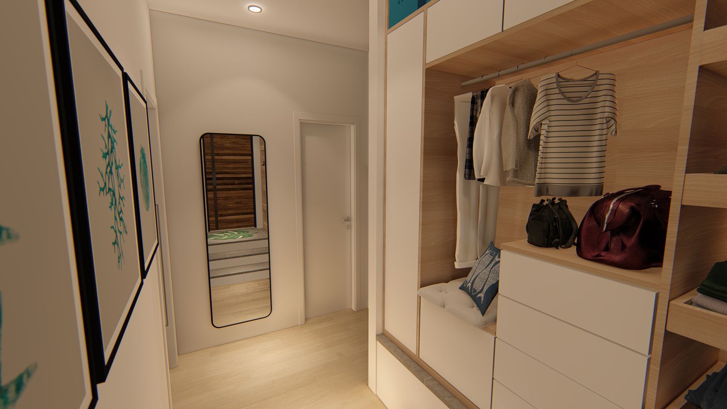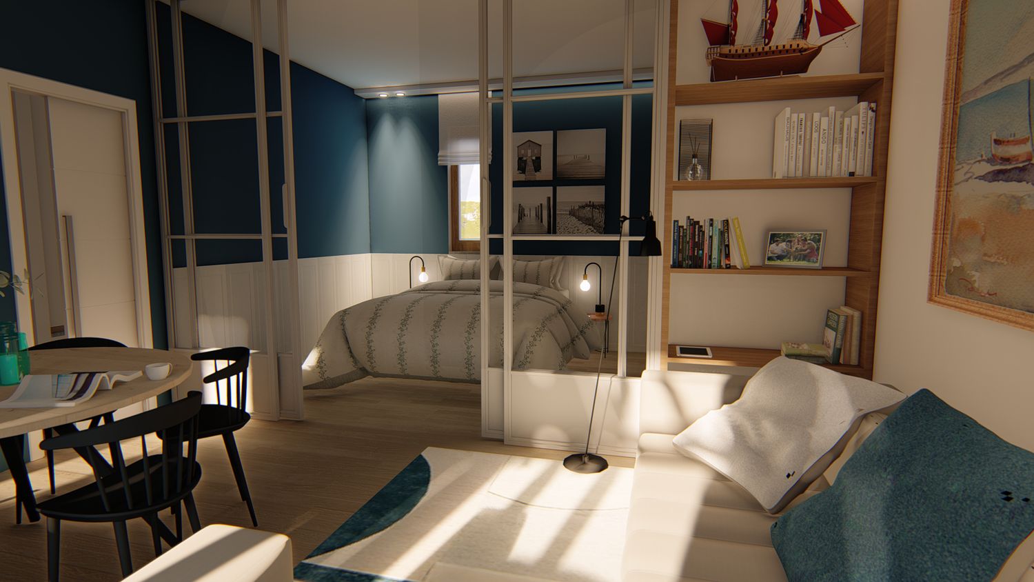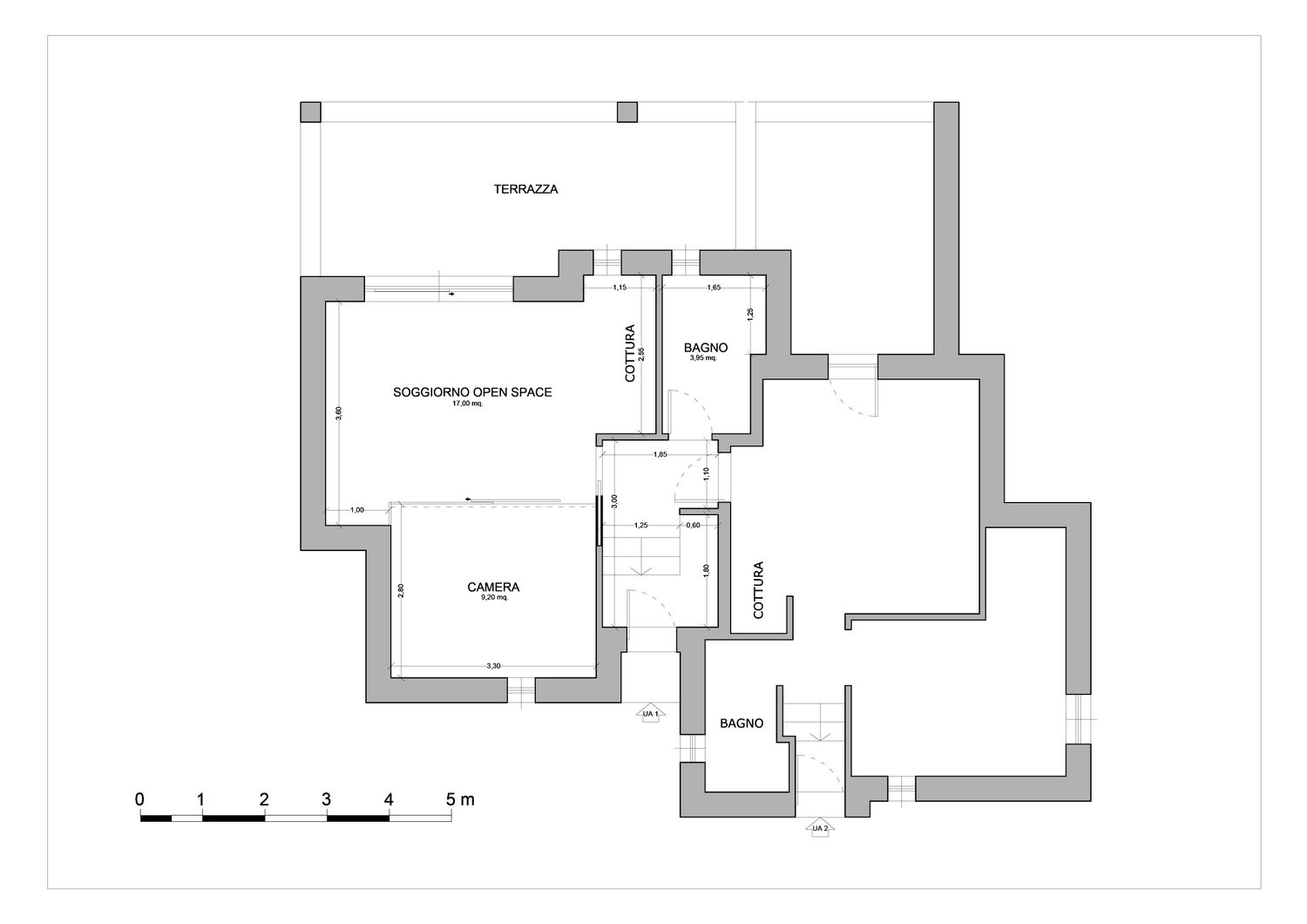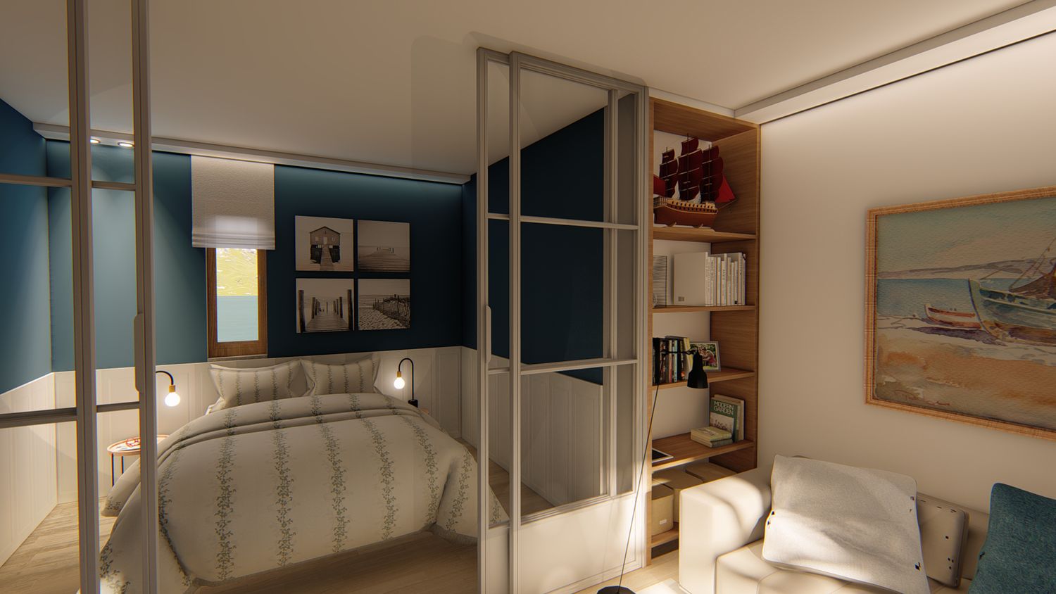 2. Modifica di alcune tramezze dell'area open space, in modo da rendere più lineare ed ampio lo spazio interno. Zona giorno e zona notte vengono separate tramite una struttura con piccolo pannello cieco laterale e ante vetrate scorrevoli frontali, che consente di chiudere la zona notte senza renderla angusta. Il pannello cieco è, inoltre, un piccolo artificio posizionato in modo da rendere leggermente più ampia la zona notte e di creare verso l'esterno una nicchia/contenitore arredata con mensole; le ante scorrevoli possono essere scelte trasparenti, satinate o cieche, a seconda delle preferenze del cliente.